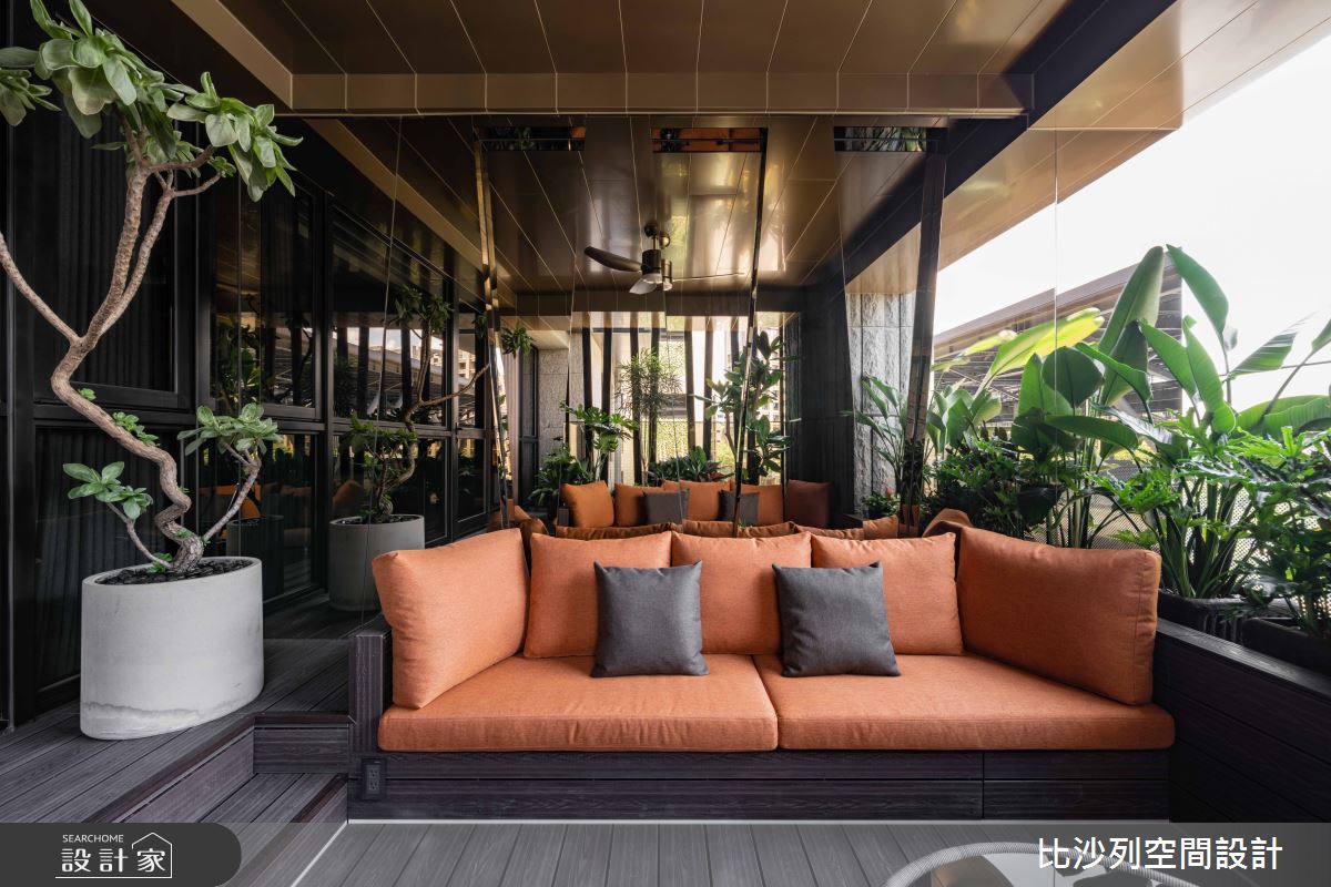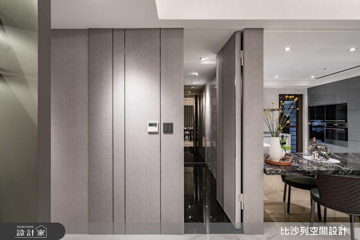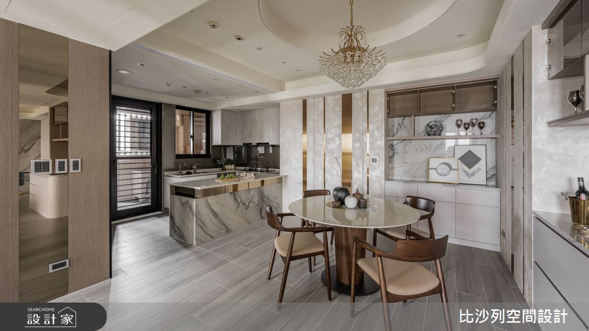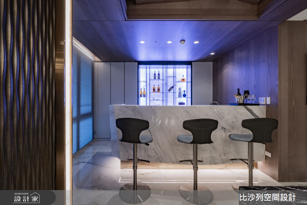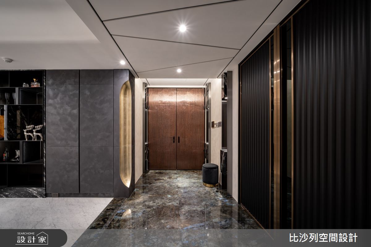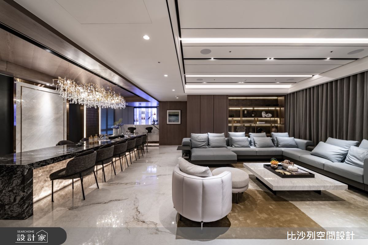 比沙列空間設計以石材、木皮、鍍鈦、茶鏡的搭配應用,呈現奢華風居家氛圍,將此間89坪、三房、單層、新成屋(5年以下)打造成舒適愜意的家庭空間,完成全家人的夢想之居。