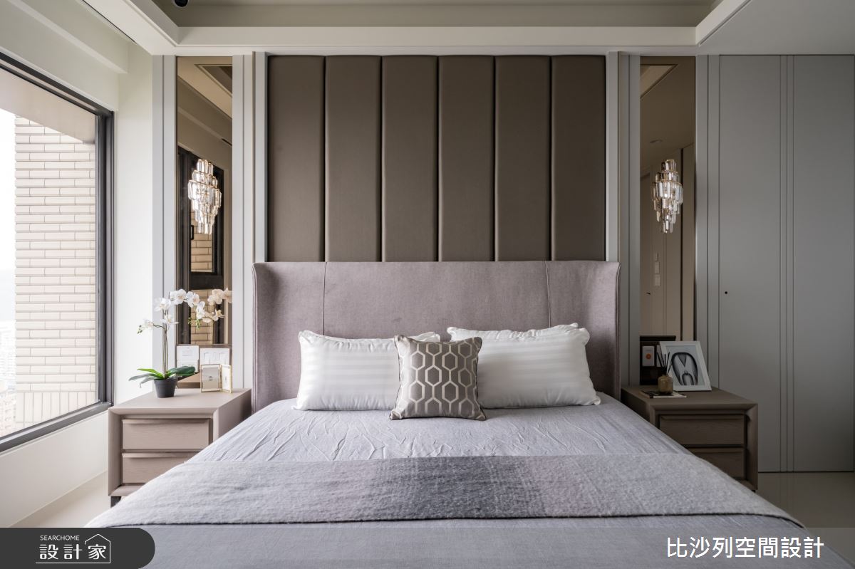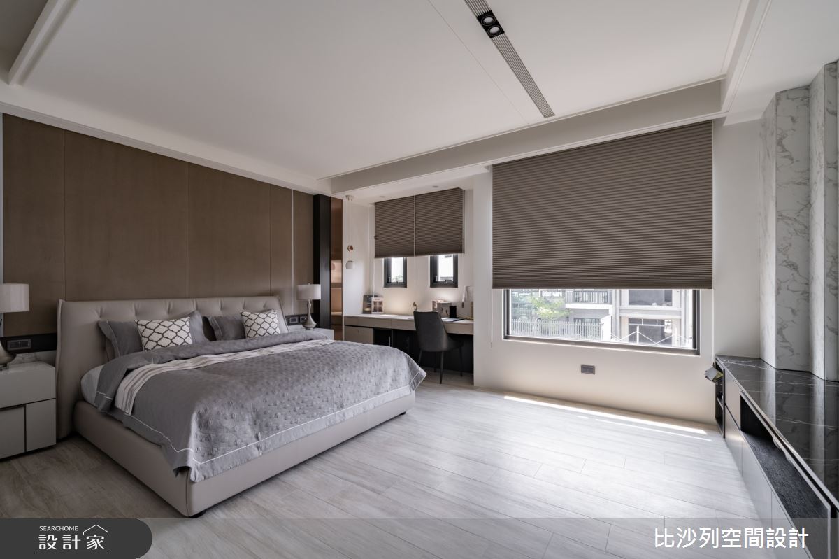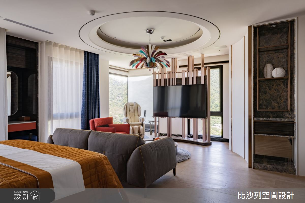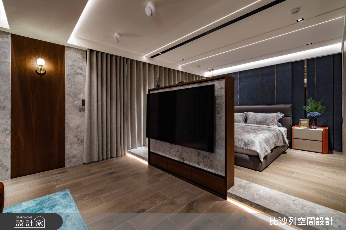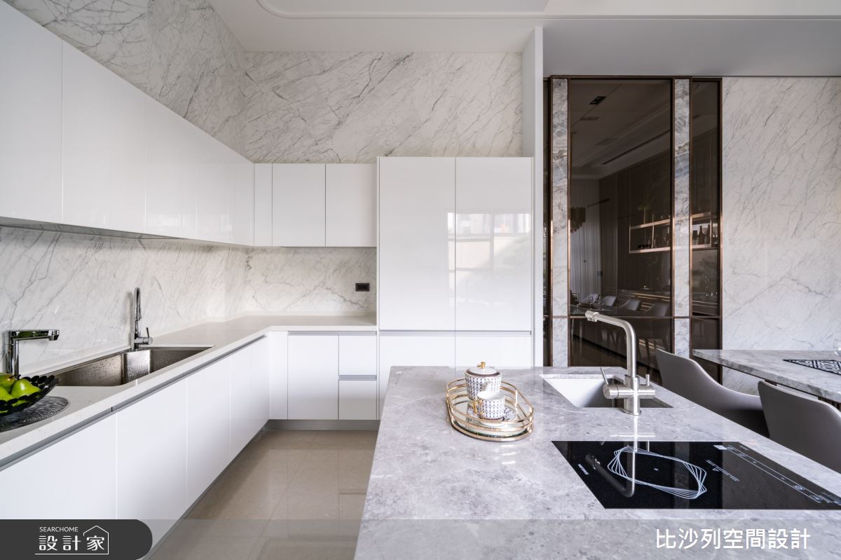 比沙列空間設計以石材、木皮、鍍鈦、茶鏡的搭配應用,呈現奢華風居家氛圍,將此間89坪、三房、單層、新成屋(5年以下)打造成舒適愜意的家庭空間,完成全家人的夢想之居。