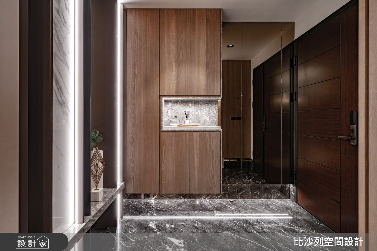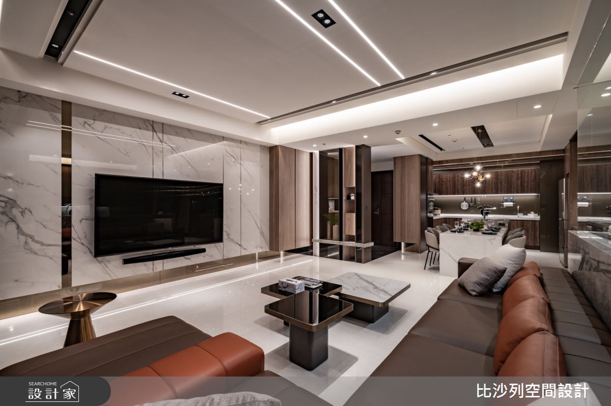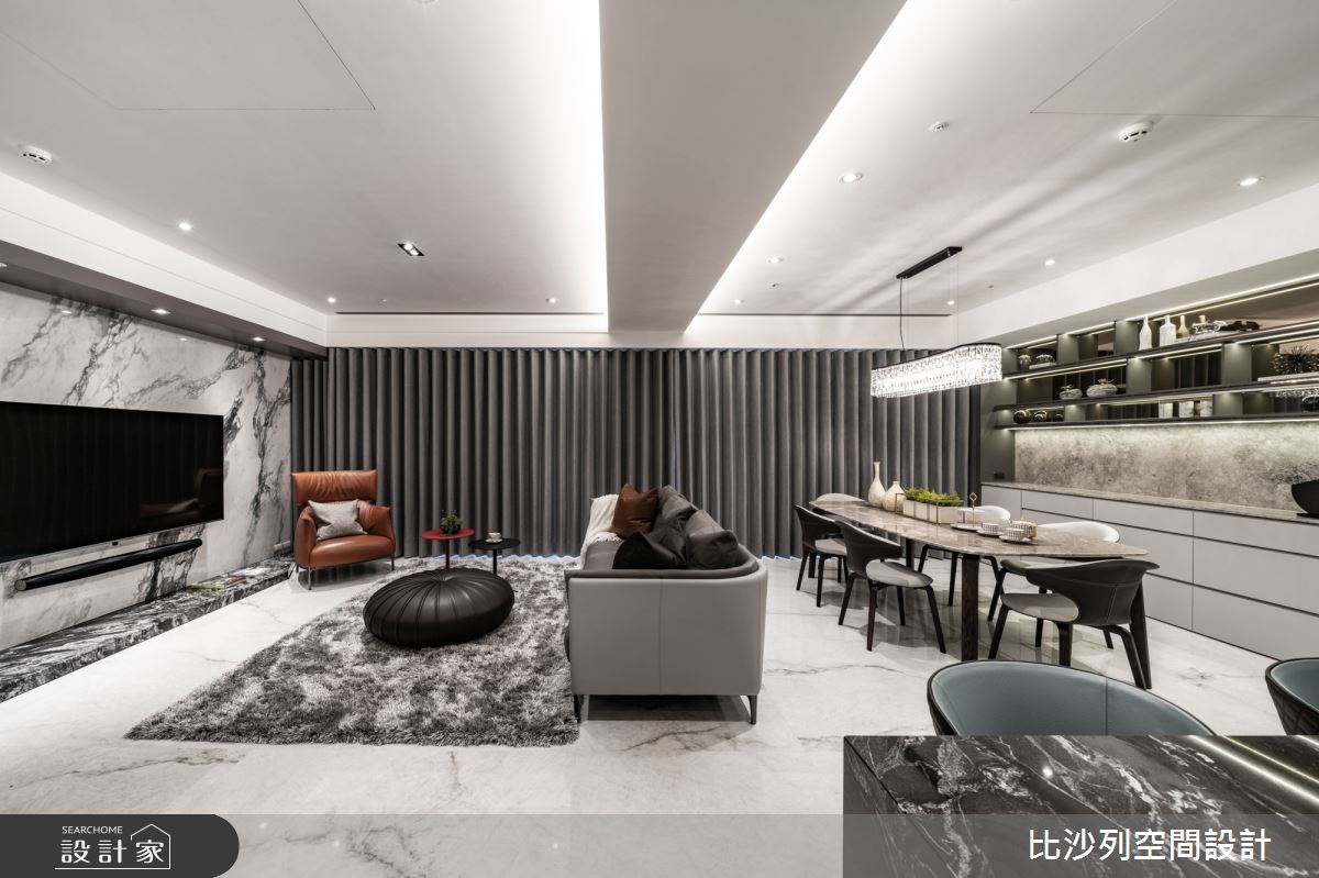 比沙列空間設計以大理石、進口大磚、鍍鈦、茶鏡、木地板的搭配應用,呈現現代風居家氛圍,將此間55坪、三房、單層、新成屋(5年以下)打造成舒適愜意的家庭空間,完成全家人的夢想之居。