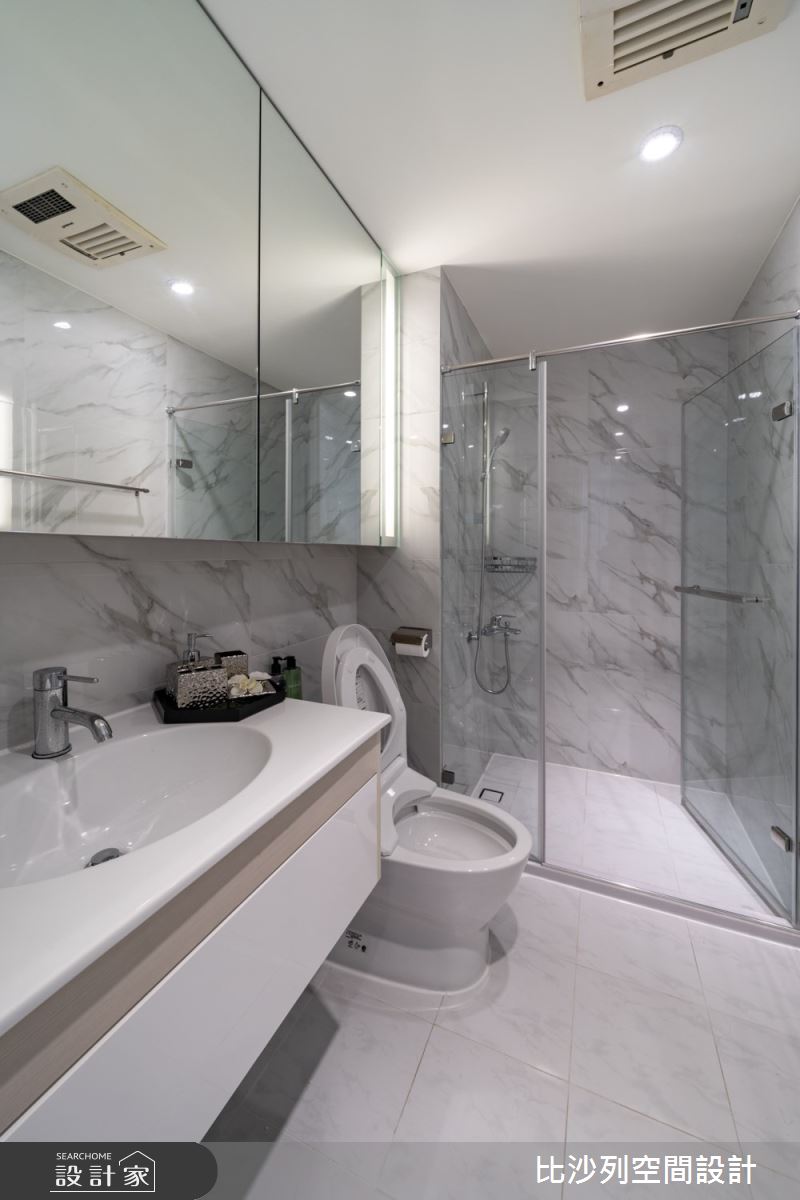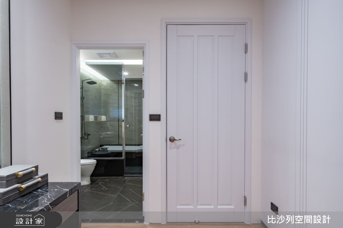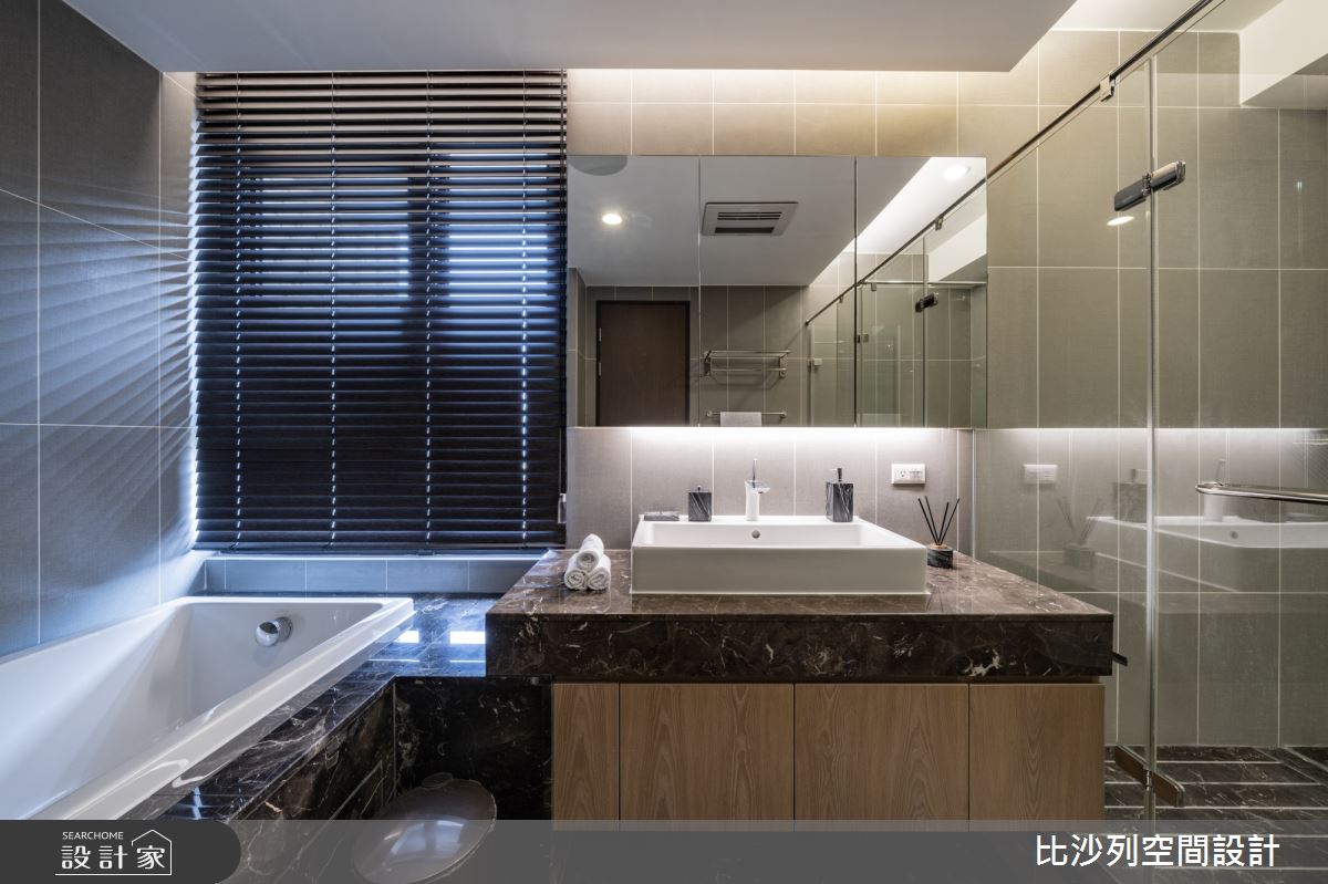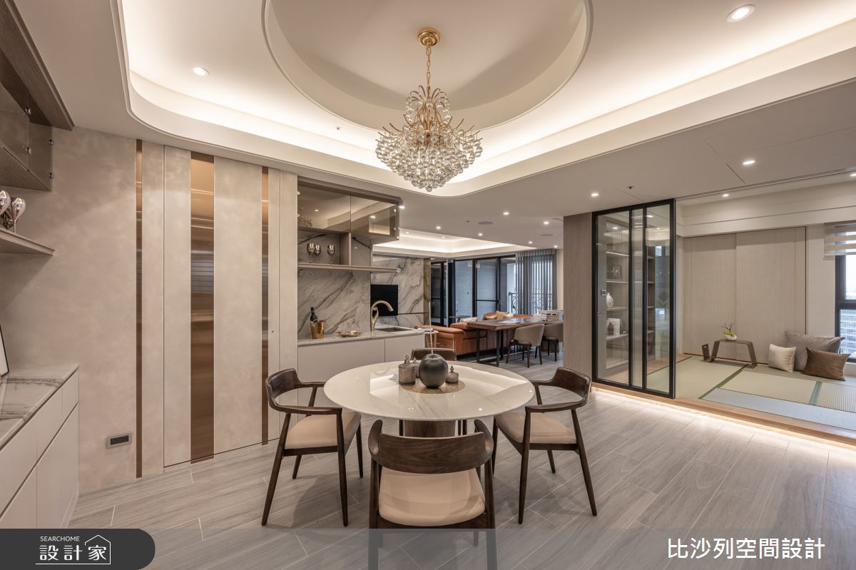 比沙列空間設計以大理石、進口大磚、鍍鈦、茶鏡、木地板的搭配應用,呈現現代風居家氛圍,將此間55坪、三房、單層、新成屋(5年以下)打造成舒適愜意的家庭空間,完成全家人的夢想之居。