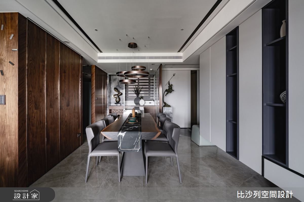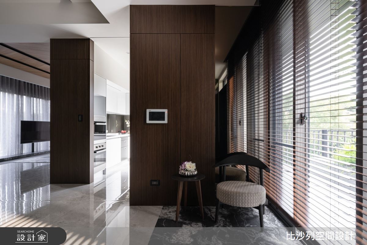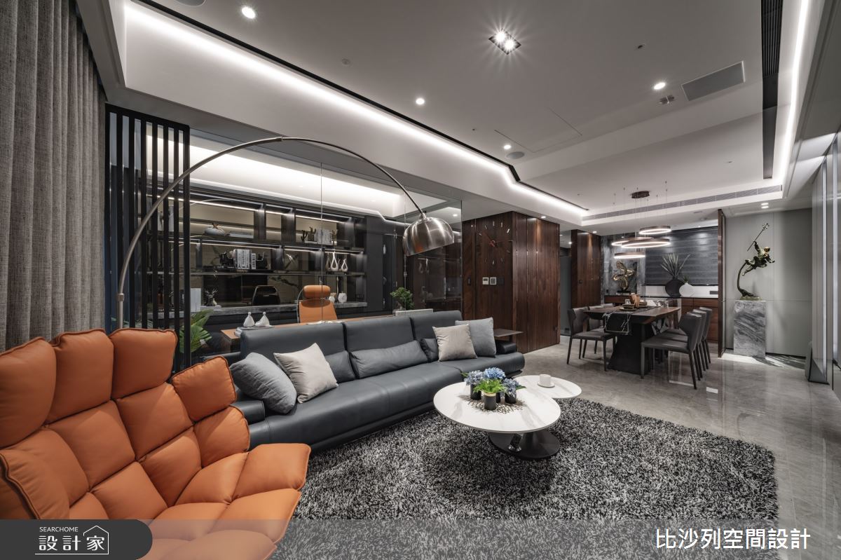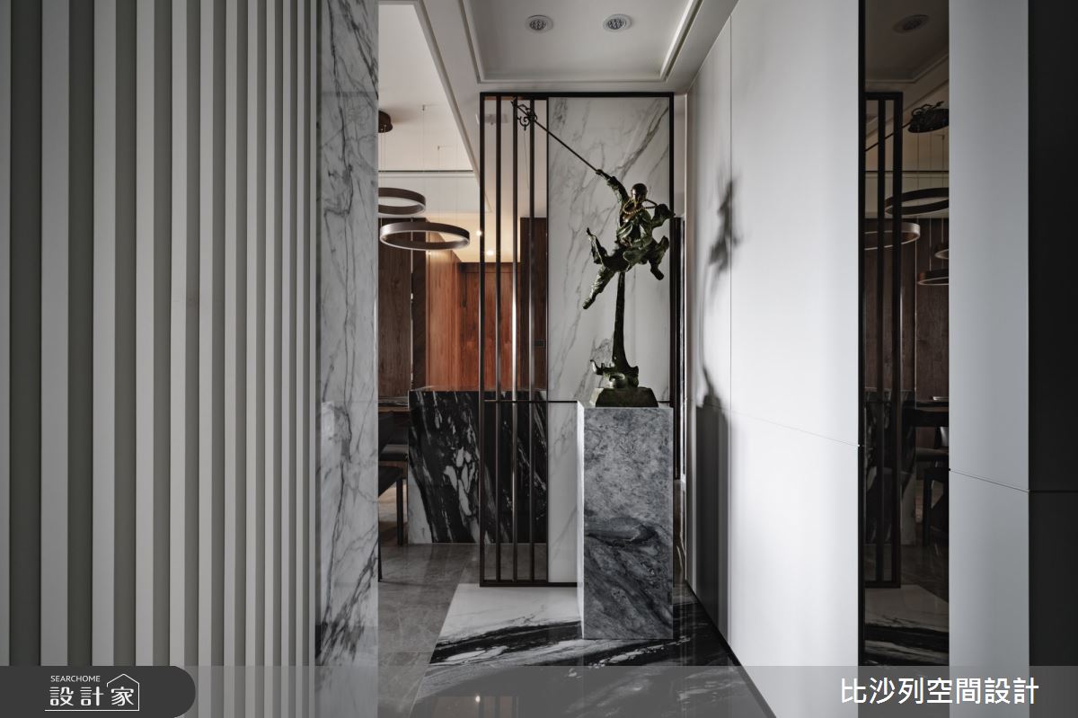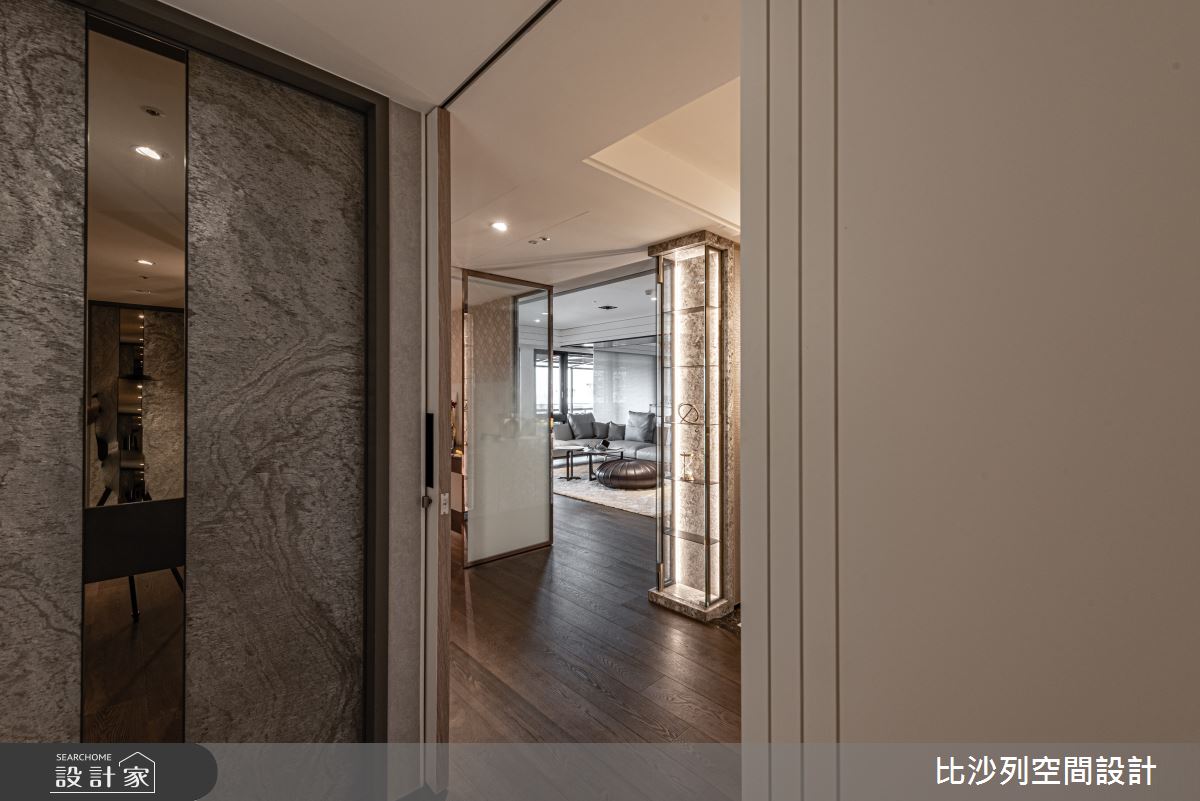 由比沙列空間設計精心規劃的70坪四房住宅空間。因應屋主需求,設計師運用現代風作為主軸,搭配大理石、茶鏡、鍍鈦、鐵件、透光板,打造全家人的夢想家居。