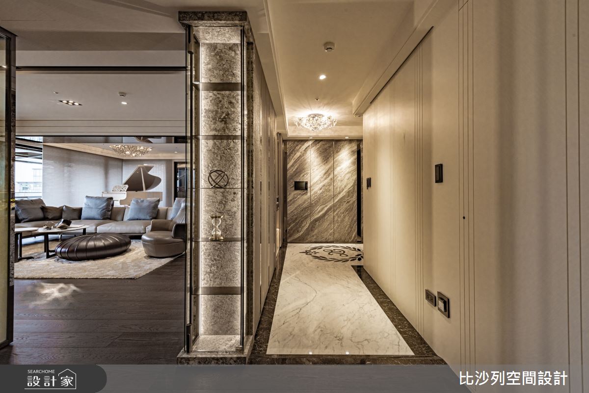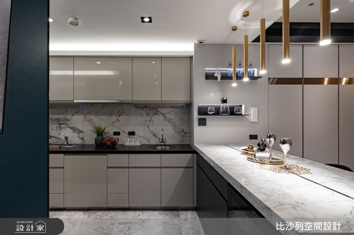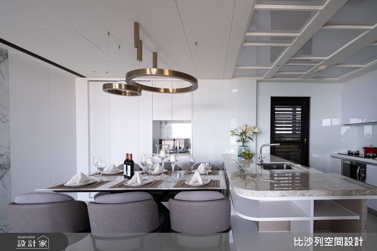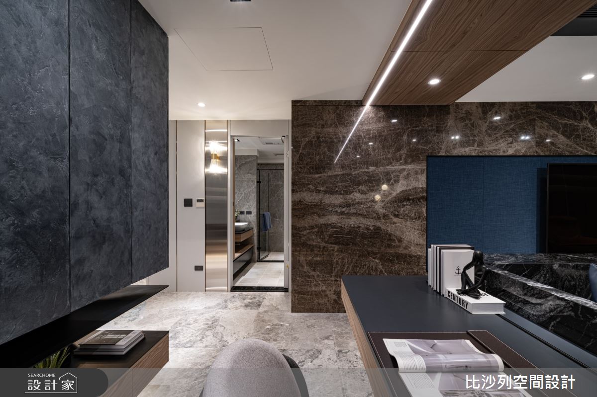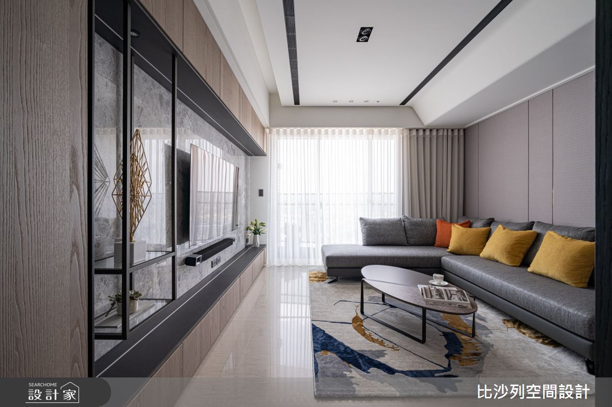 由比沙列空間設計精心規劃的70坪四房住宅空間。因應屋主需求,設計師運用現代風作為主軸,搭配大理石、茶鏡、鍍鈦、鐵件、透光板,打造全家人的夢想家居。