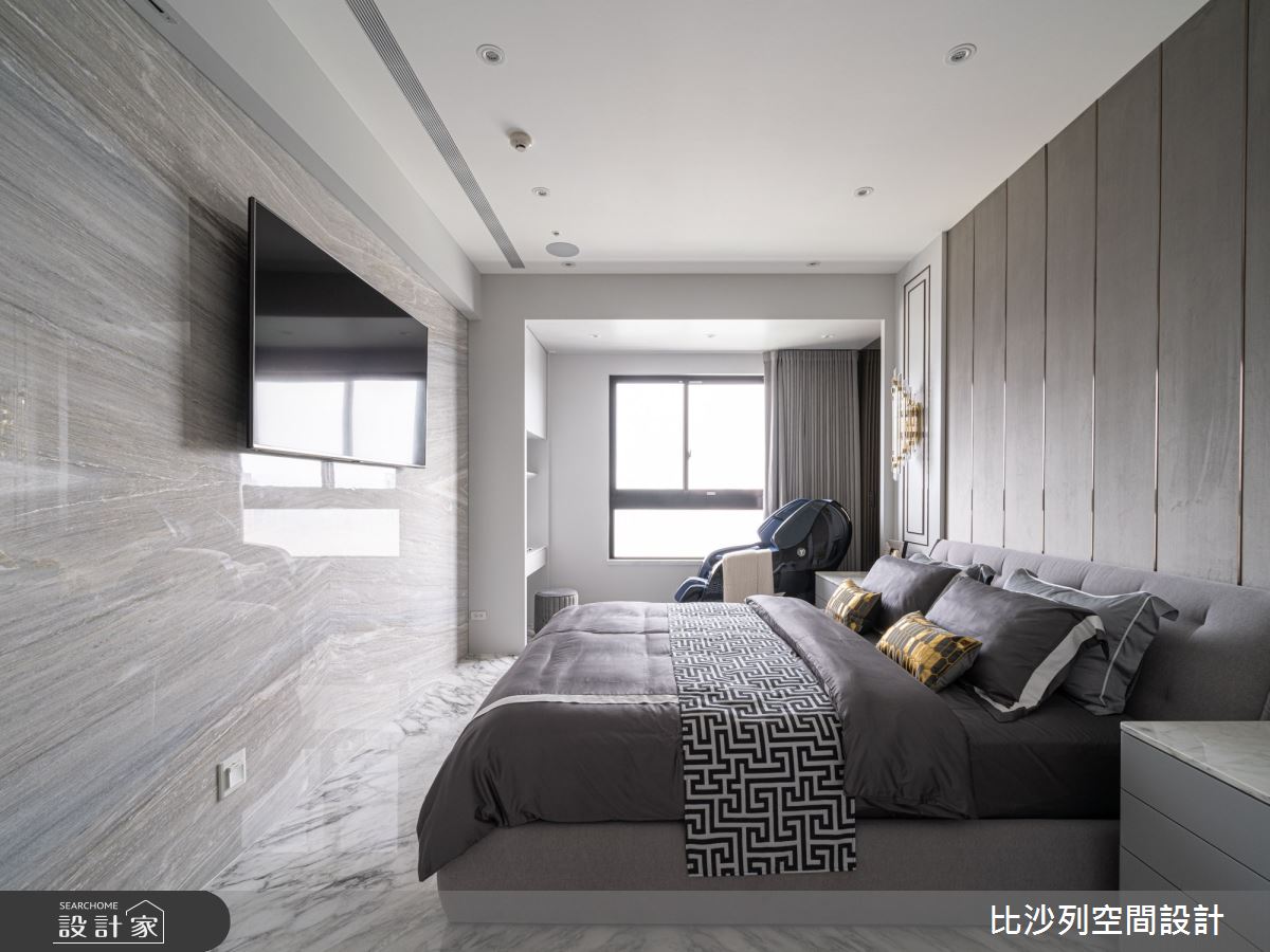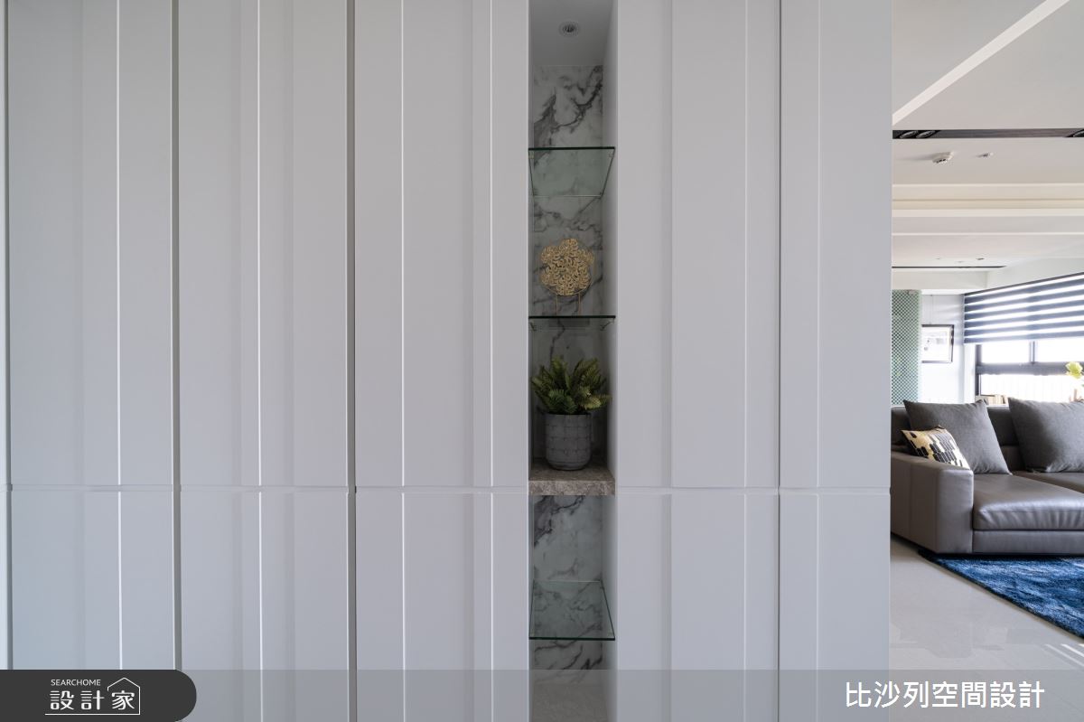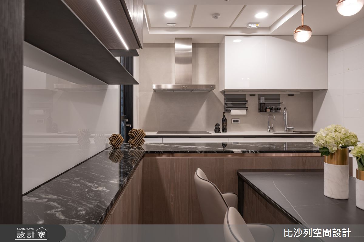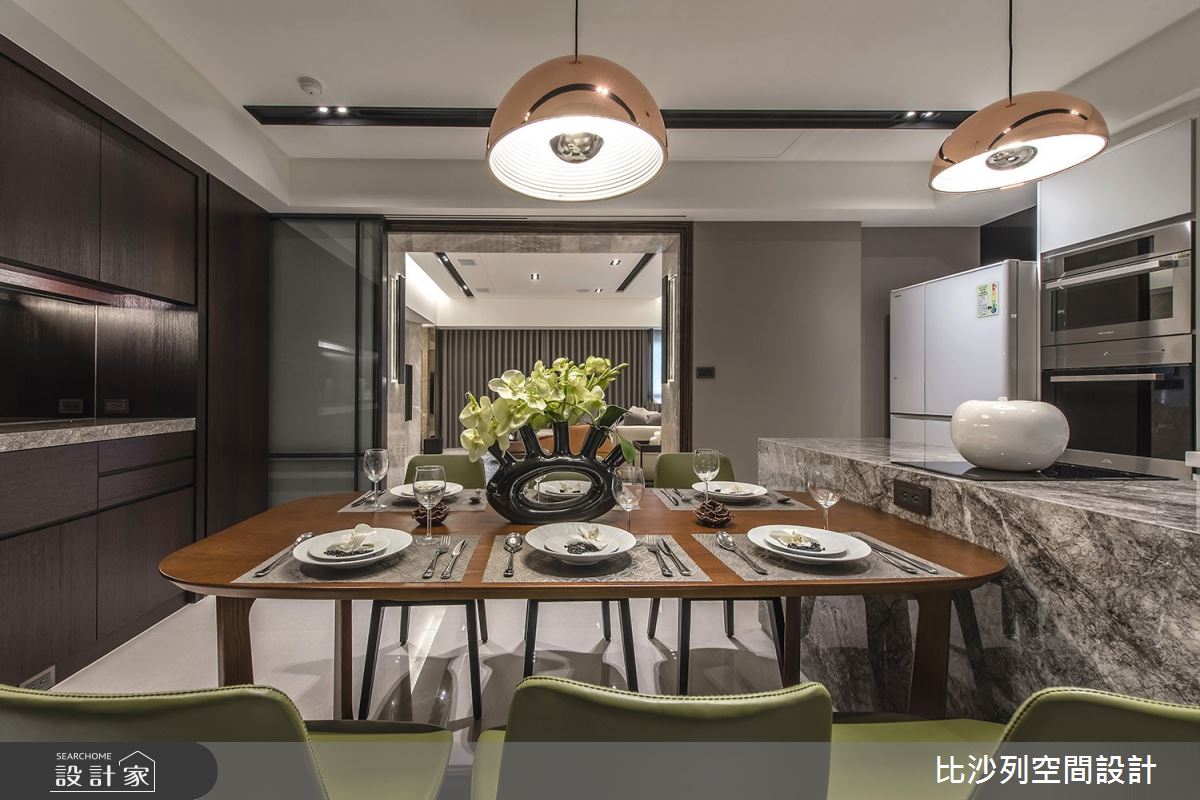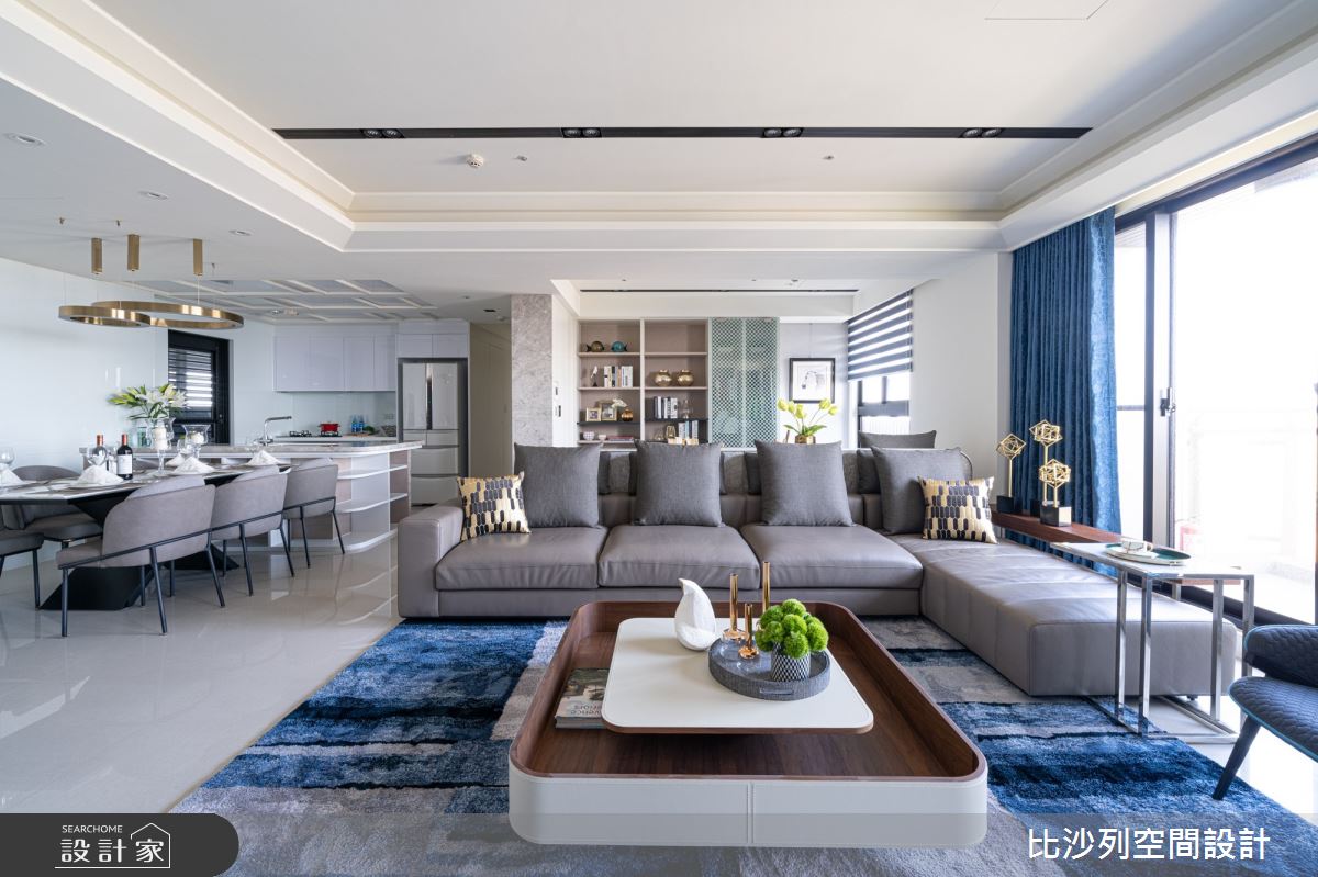 由比沙列空間設計精心規劃的70坪四房住宅空間。因應屋主需求,設計師運用現代風作為主軸,搭配大理石、茶鏡、鍍鈦、鐵件、透光板,打造全家人的夢想家居。