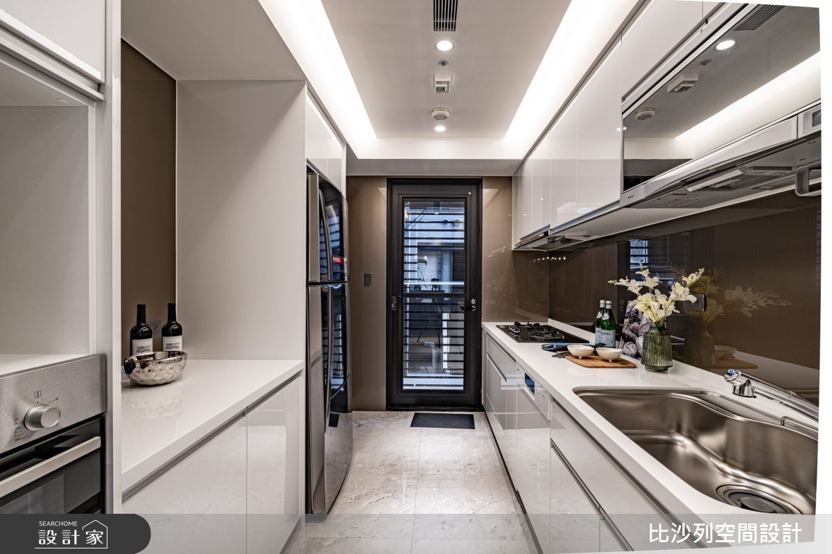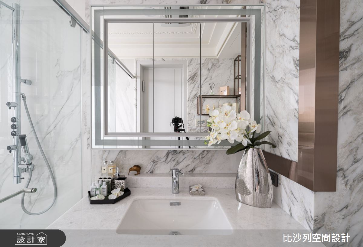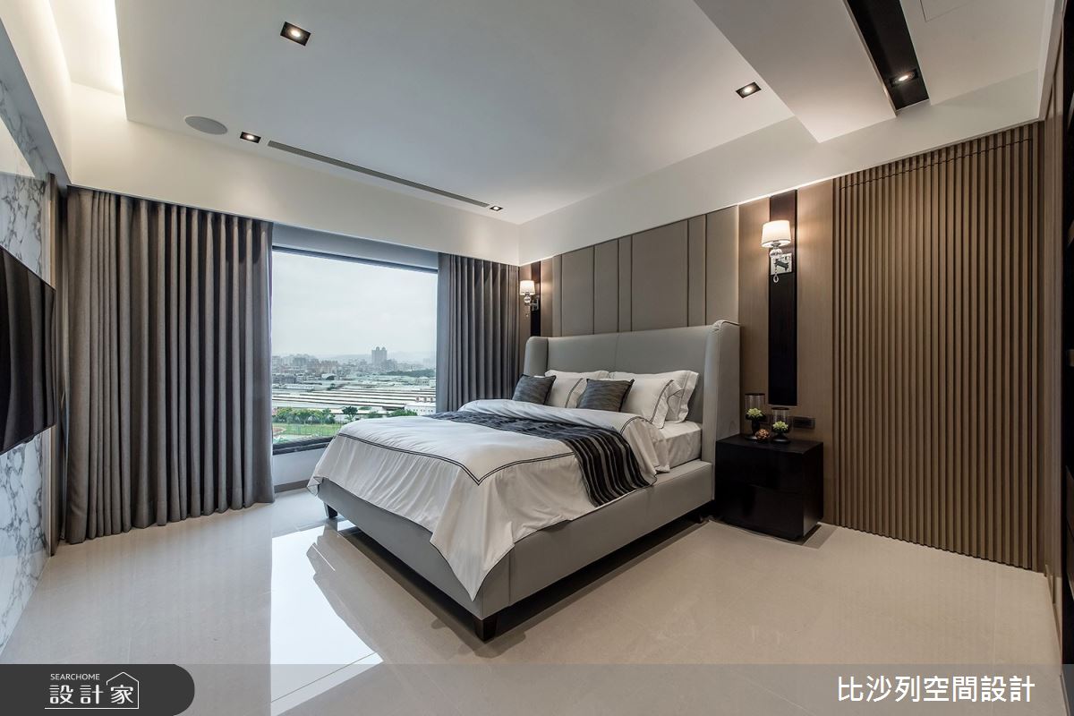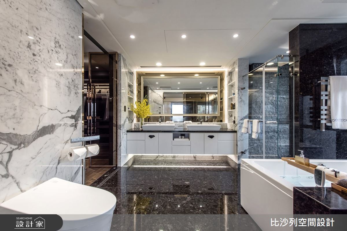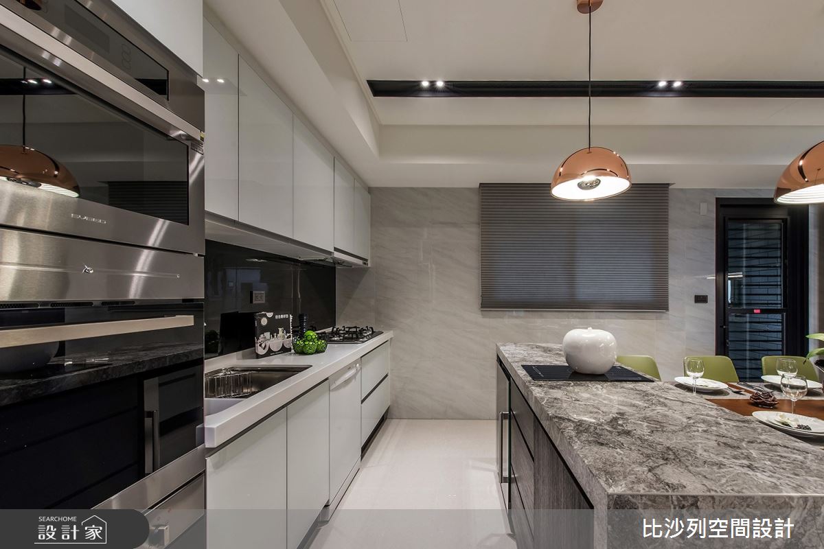 由比沙列空間設計精心規劃的70坪四房住宅空間。因應屋主需求,設計師運用現代風作為主軸,搭配大理石、茶鏡、鍍鈦、鐵件、透光板,打造全家人的夢想家居。