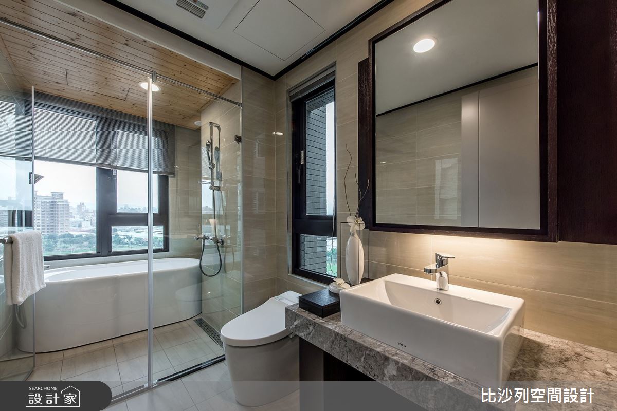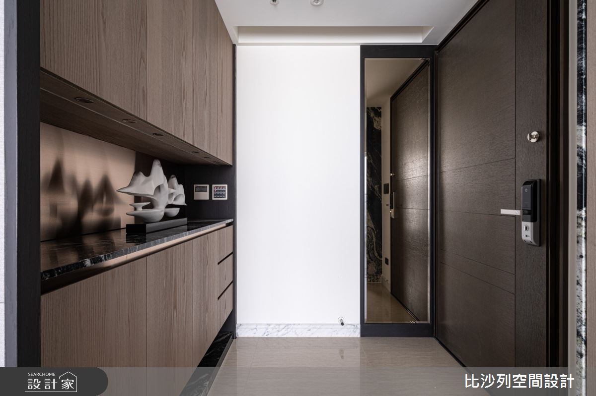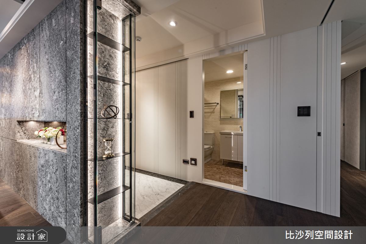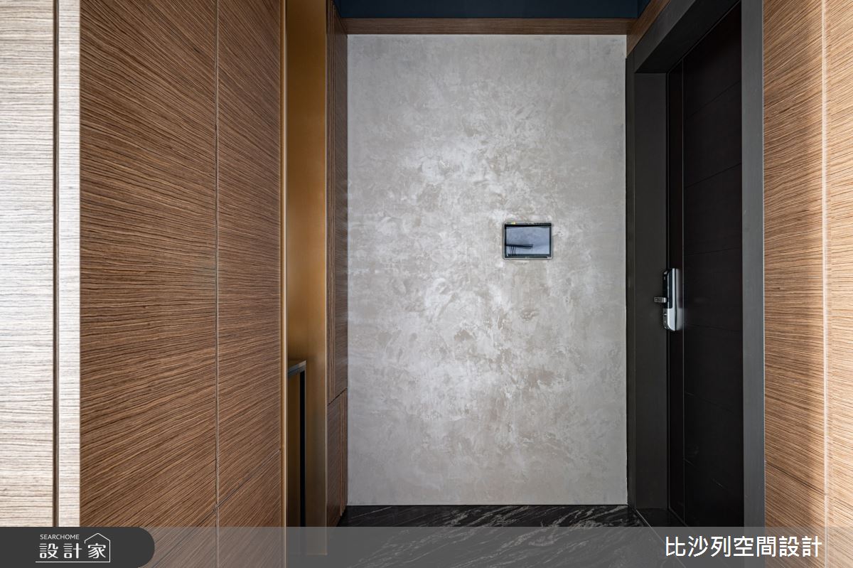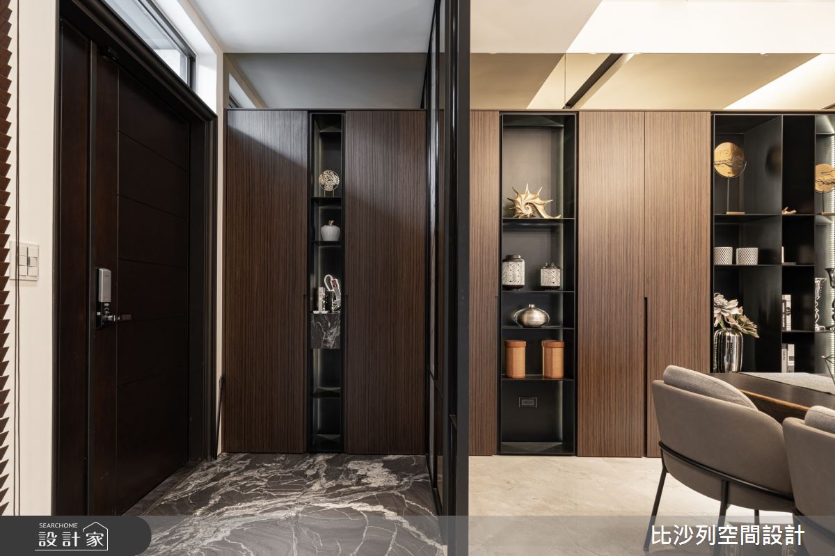 來自比沙列空間設計的60坪混搭風住宅案,屋主一家人共有2位大人,是一間單層預售屋的兩房格局,設計師藉由建材以石材、鍍鈦、木皮的搭配應用,實現一家人的理想生活。