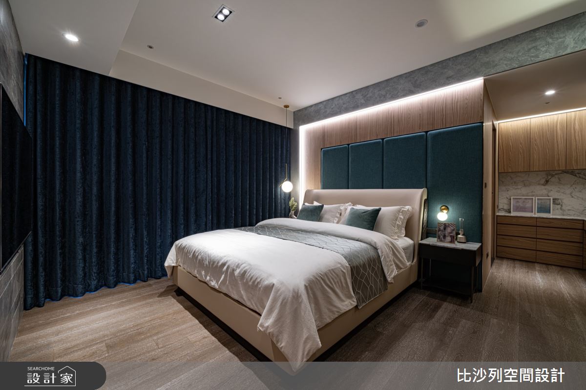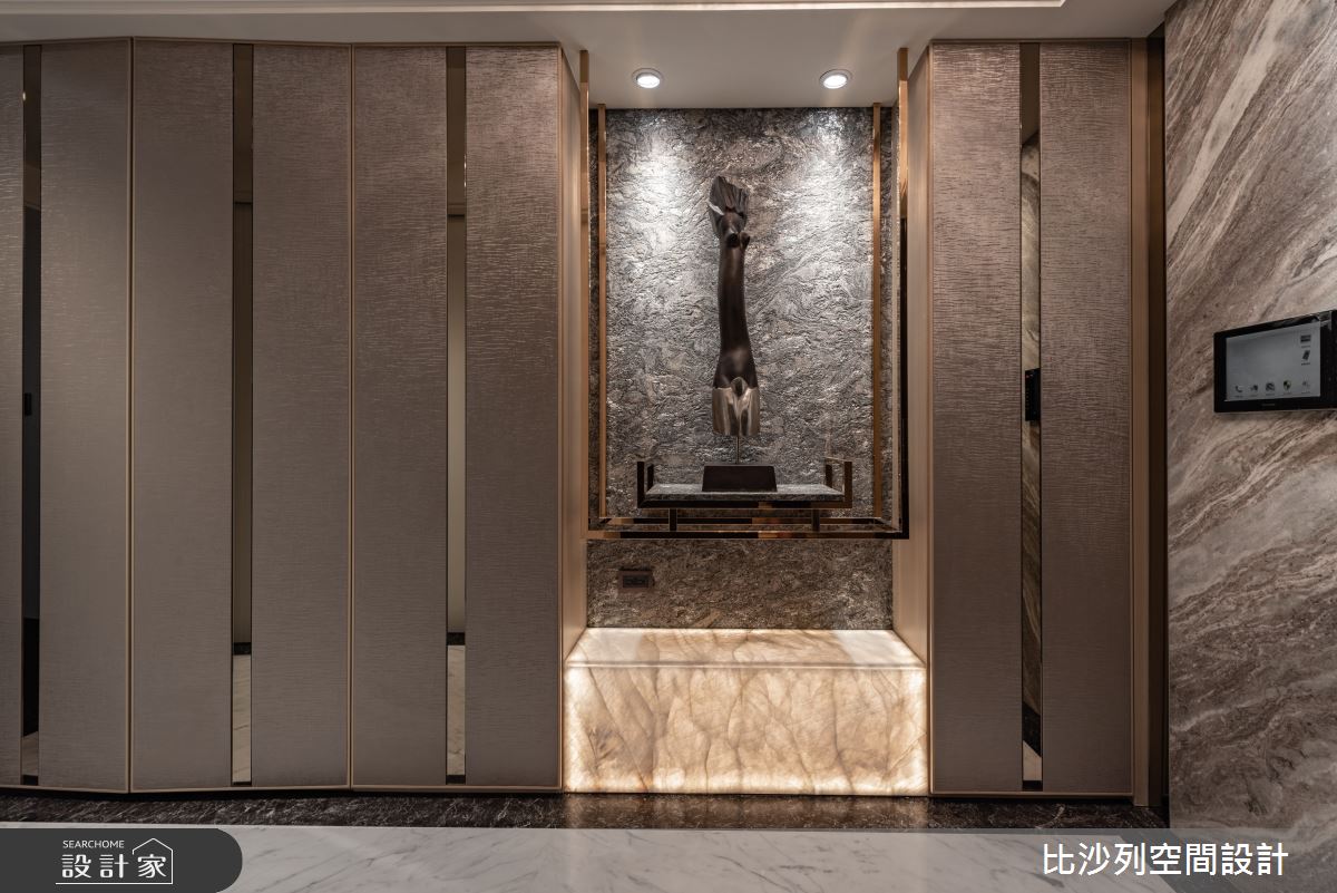 來自比沙列空間設計的60坪奢華風住宅案,是一間單層新成屋(5年以下)的四房格局,設計師藉由建材以鍍鈦、石材、木皮、板岩的搭配應用,實現一家人的理想生活。