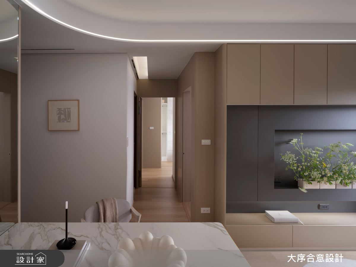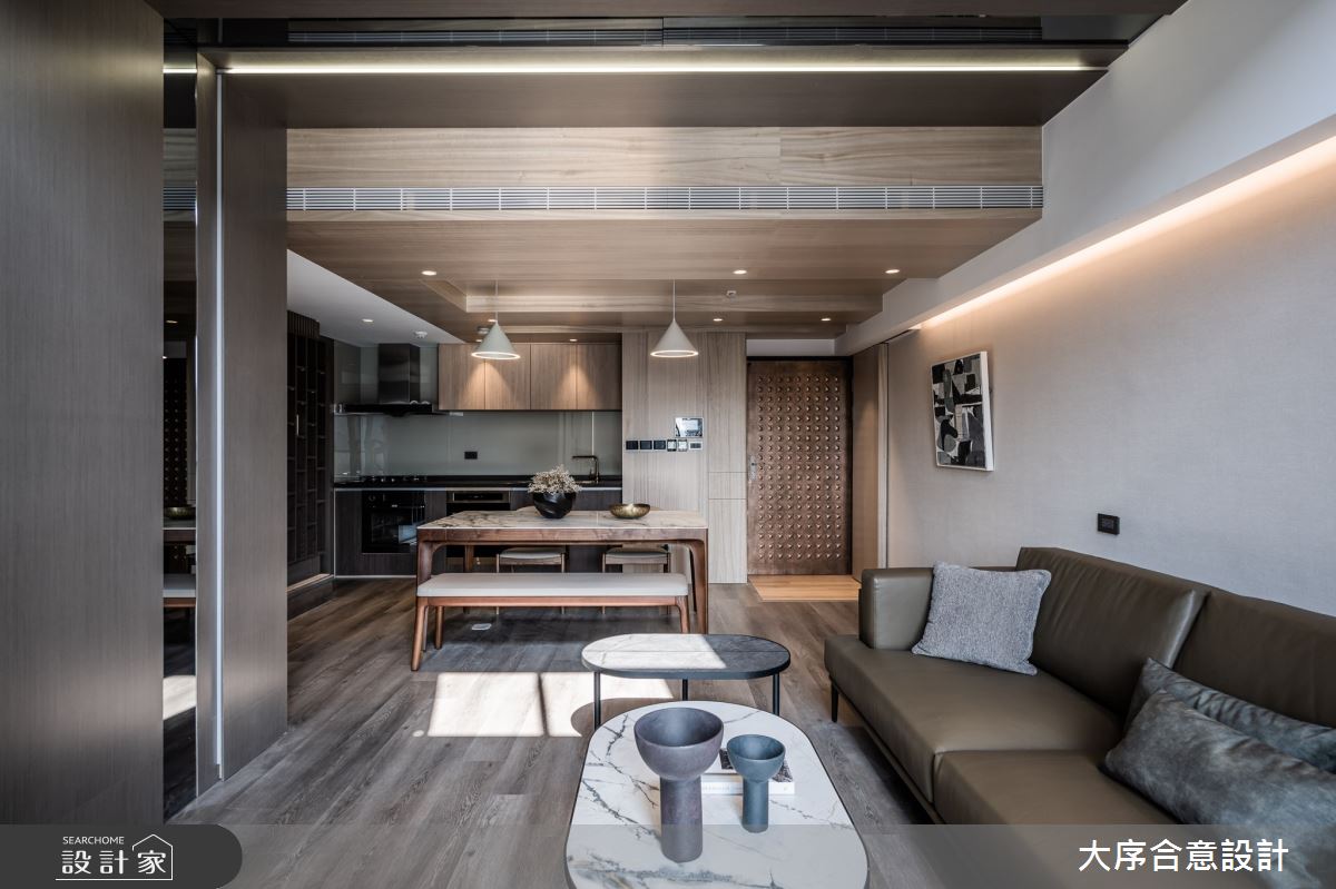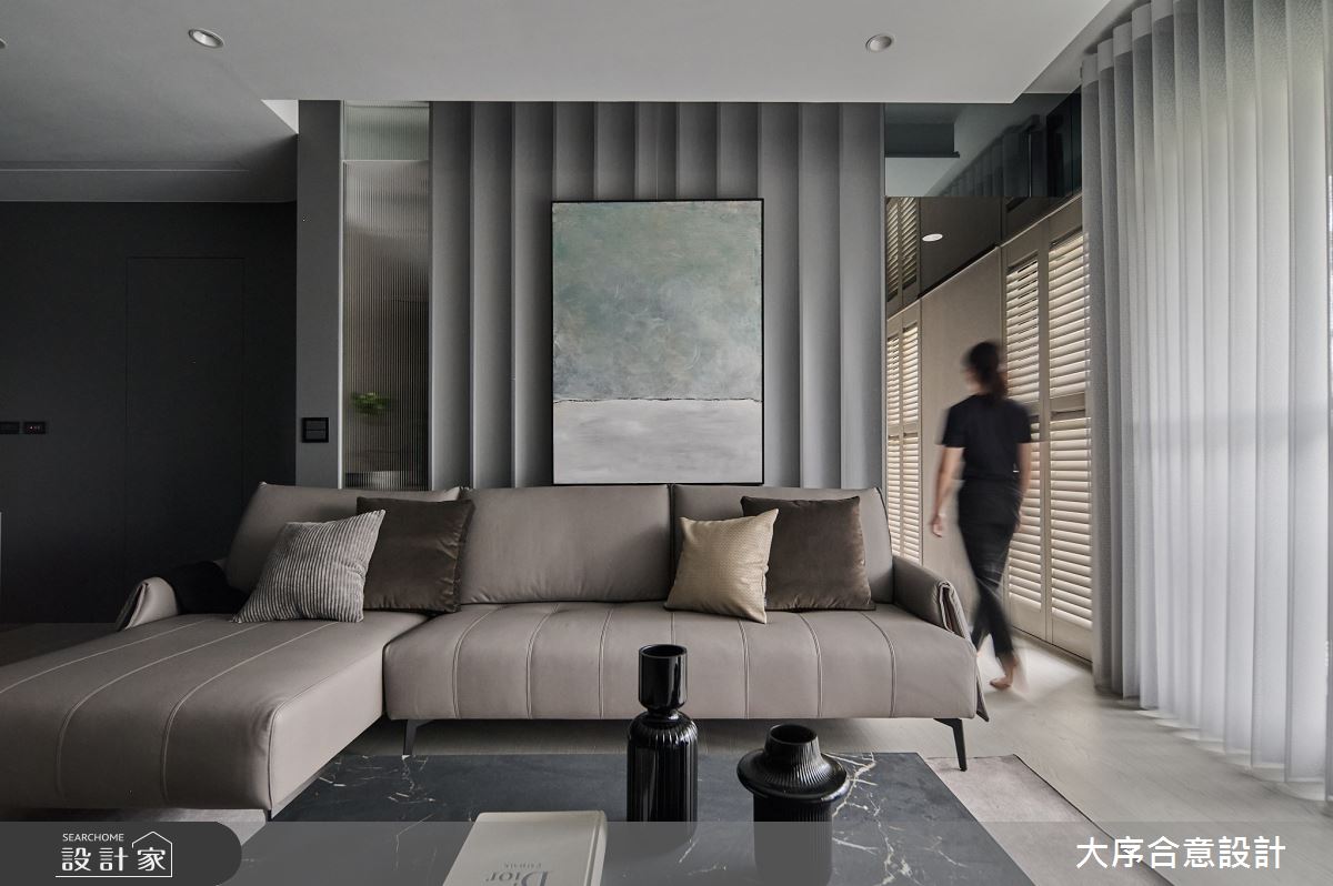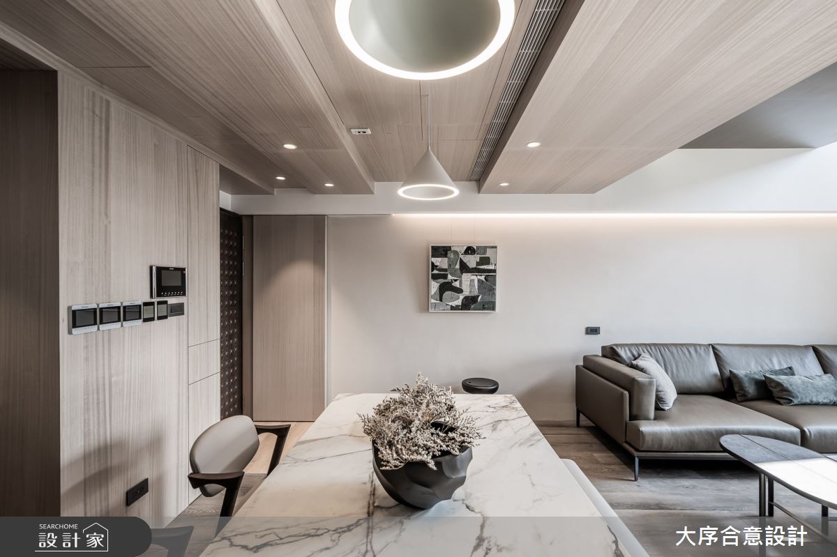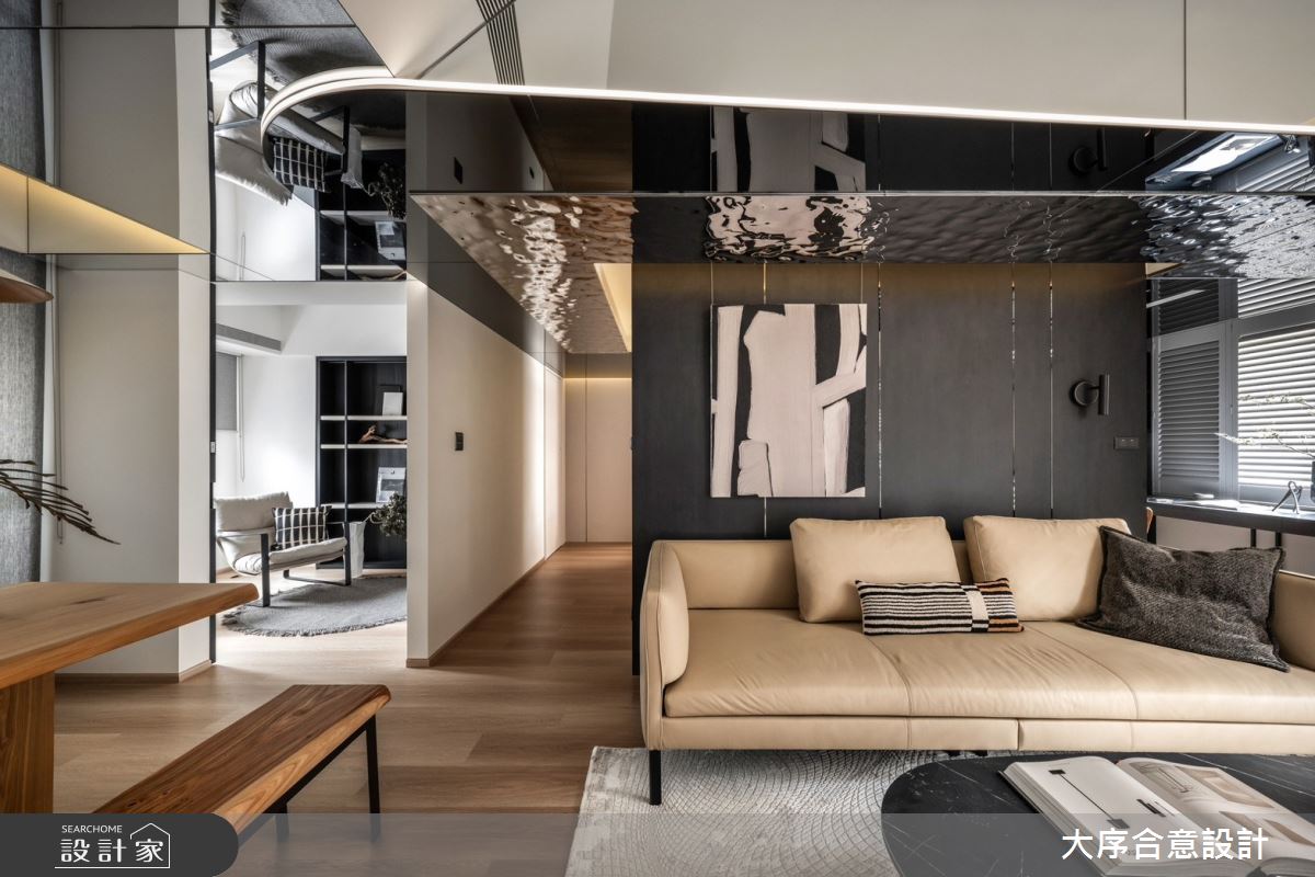 由大序合意設計精心規劃的60坪三房住宅空間。因應屋主需求,設計師運用現代風作為主軸,搭配乳膠漆、超耐磨木地板、灰鏡、鍍鈦金屬、木作貼皮、烤漆、石材、繃布、大板磚,打造全家人的夢想家居。