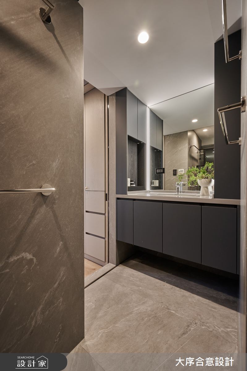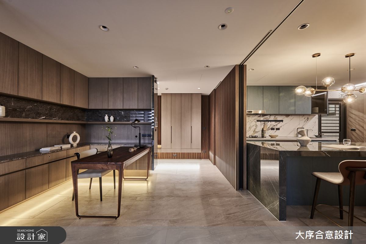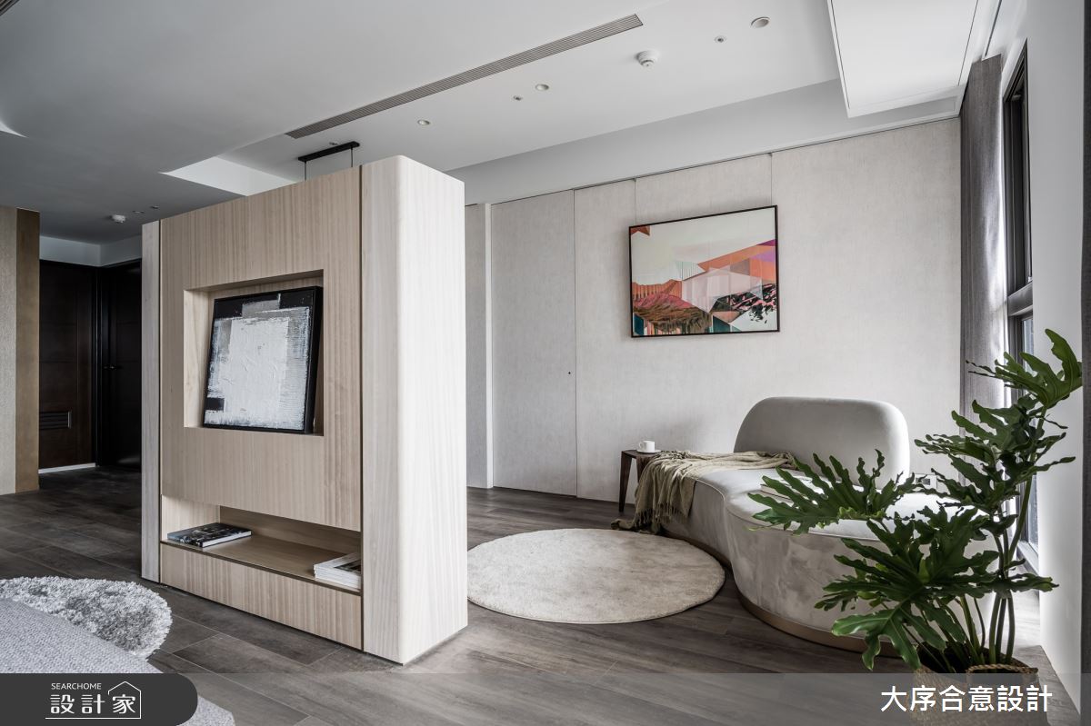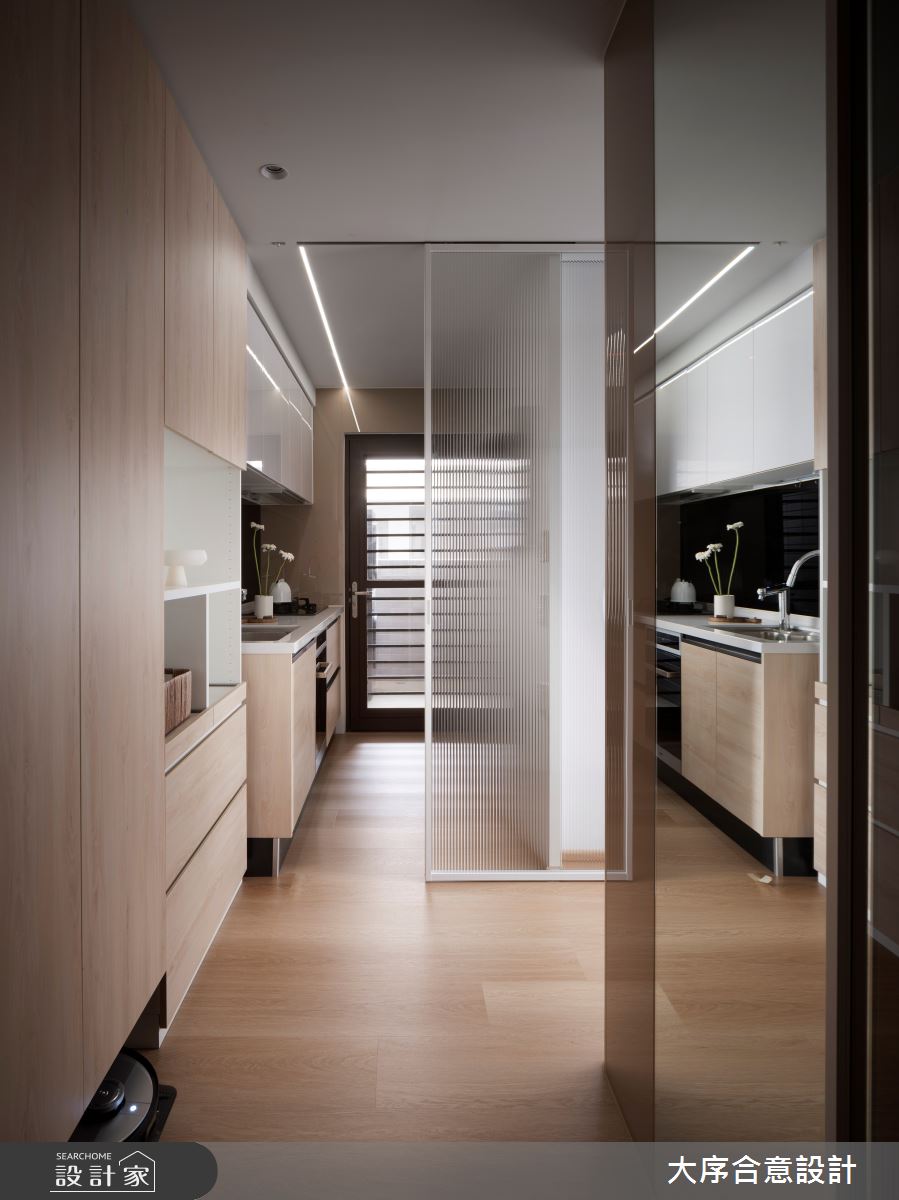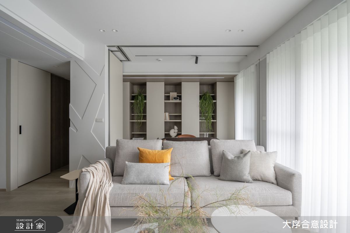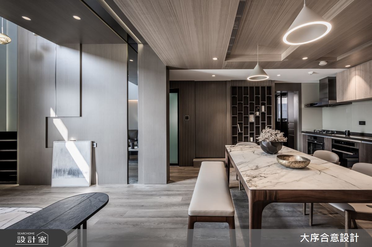 由大序合意設計精心規劃的60坪三房住宅空間。因應屋主需求,設計師運用現代風作為主軸,搭配乳膠漆、超耐磨木地板、灰鏡、鍍鈦金屬、木作貼皮、烤漆、石材、繃布、大板磚,打造全家人的夢想家居。