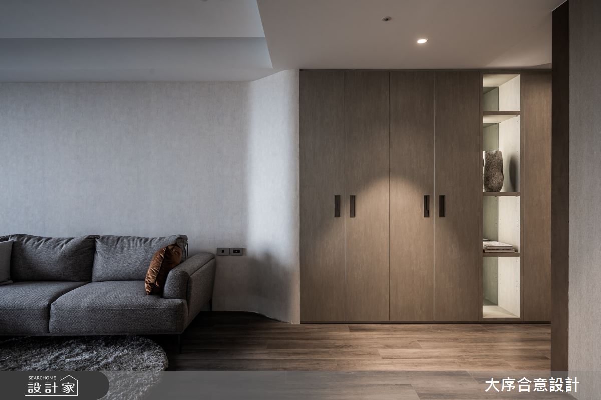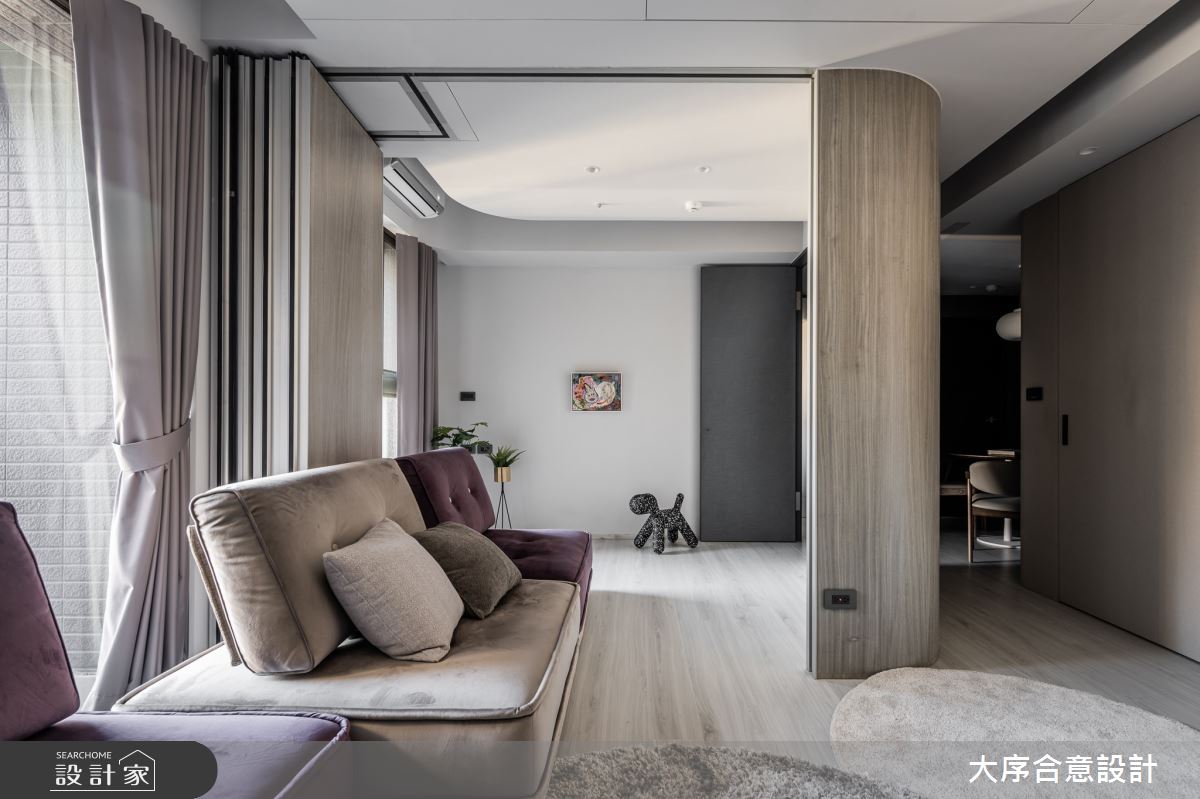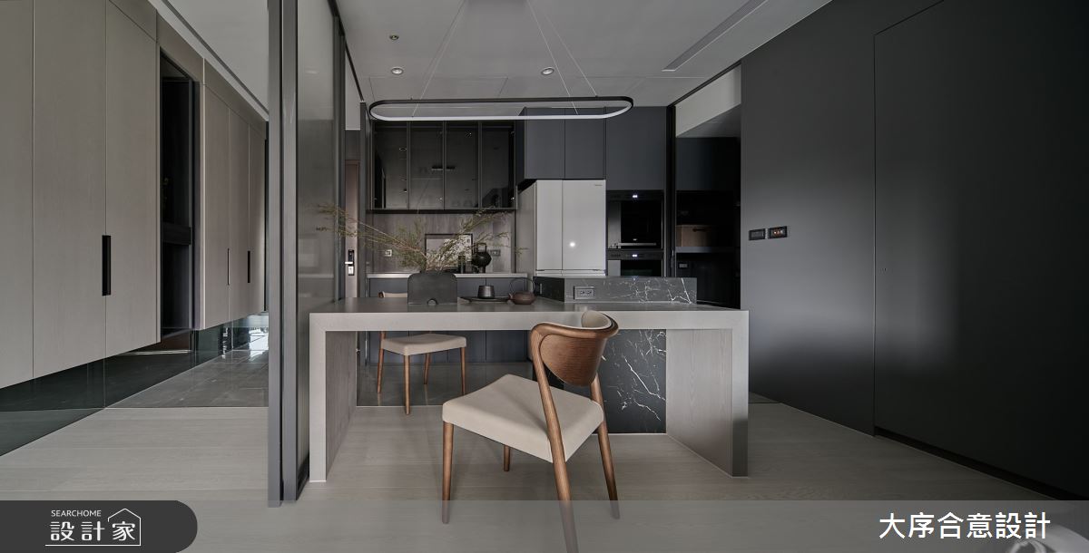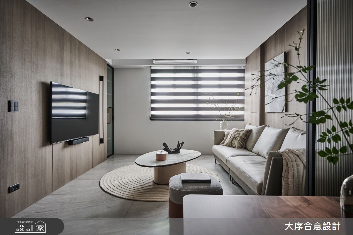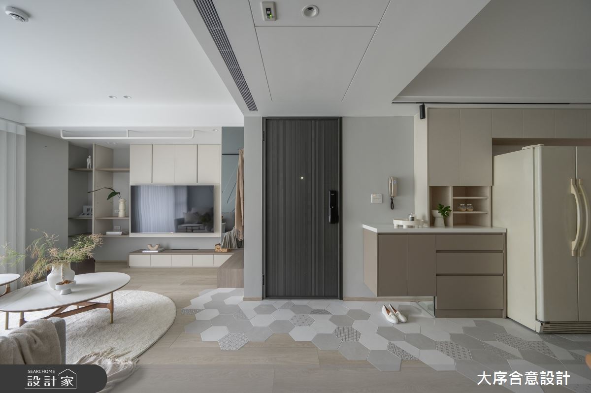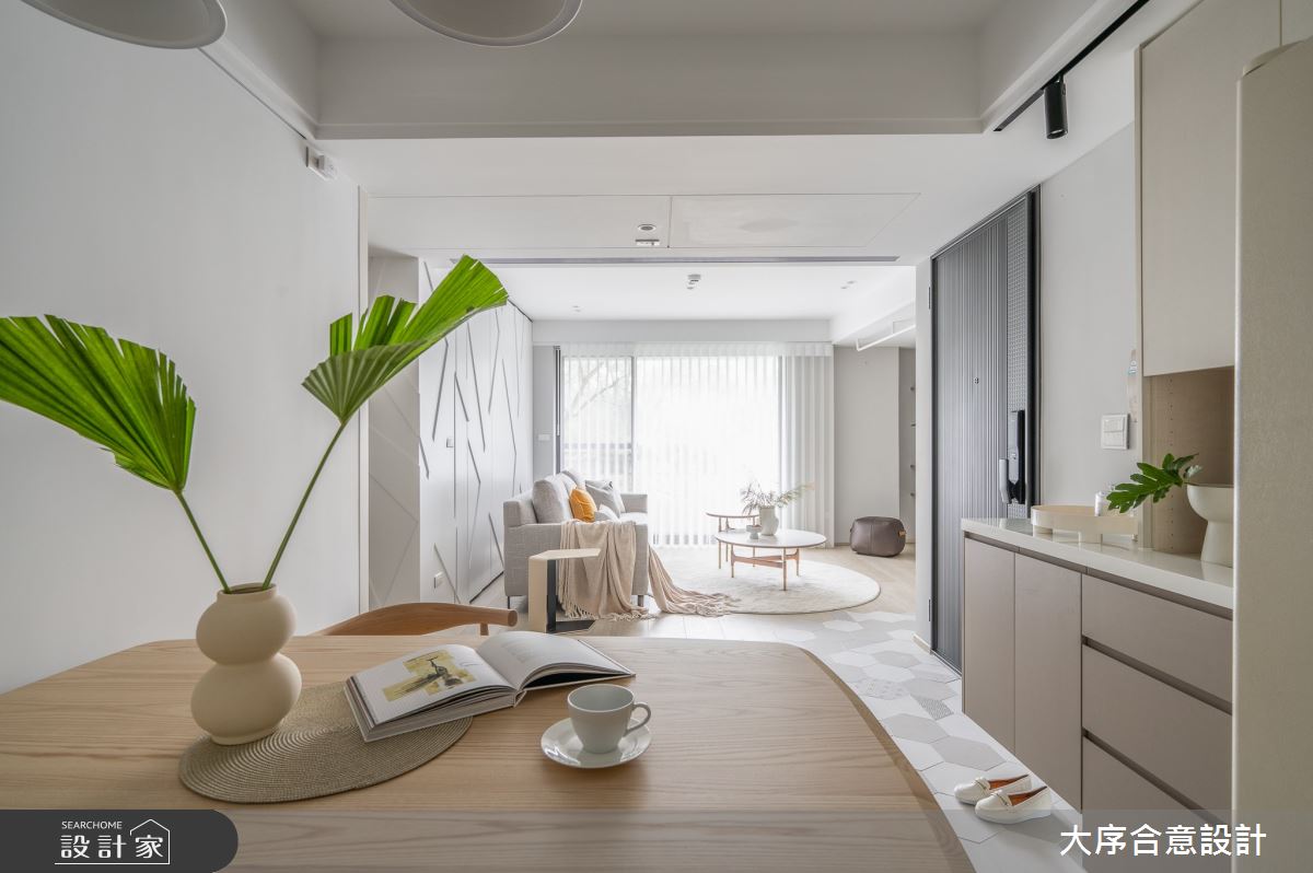 來自大序合意設計的36坪現代風住宅案,屋主一家人共有2位大人,是一間單層新成屋(5年以下)的兩房格局,設計師藉由建材以乳膠漆、壁紙、超耐磨木地板、鍍鈦金屬、實木皮板、美耐板的搭配應用,實現一家人的理想生活。