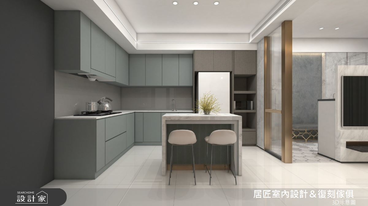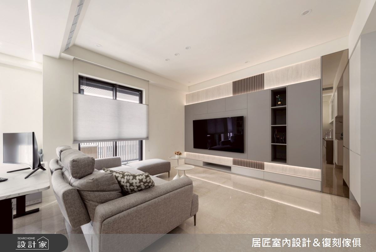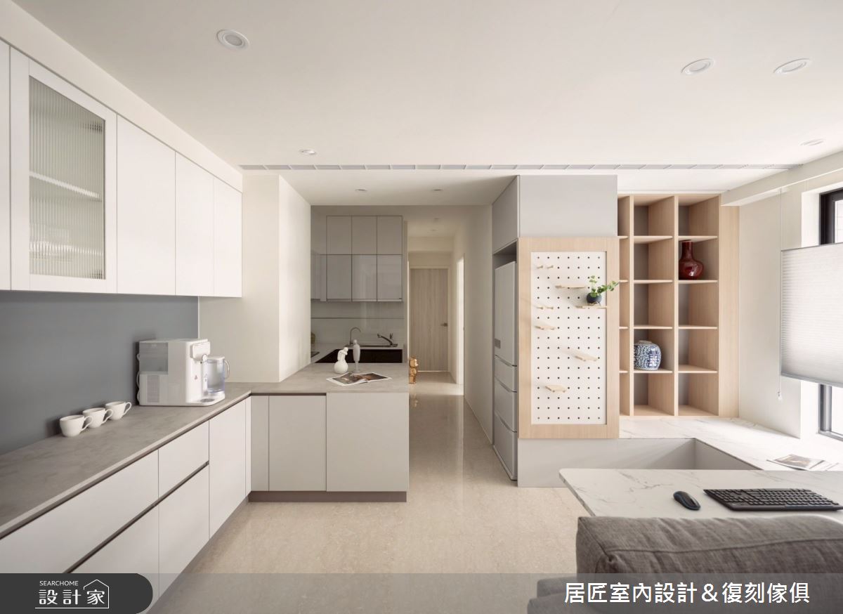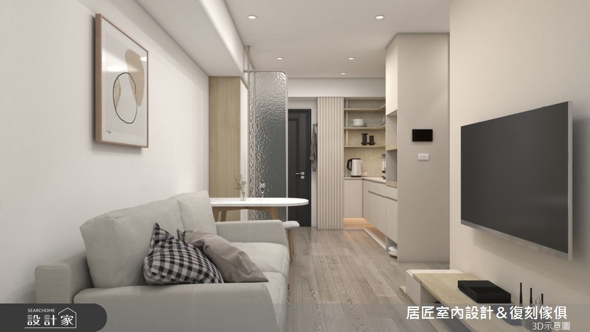 來自居匠室內設計&復刻傢俱的21坪現代風住宅案,屋主一家人共有2位大人,是一間單層中古屋(5~15年)的兩房格局,設計師藉由建材以長城板、茶鏡、平條玻璃、系統板、塗料、環保PP板的搭配應用,實現一家人的理想生活。