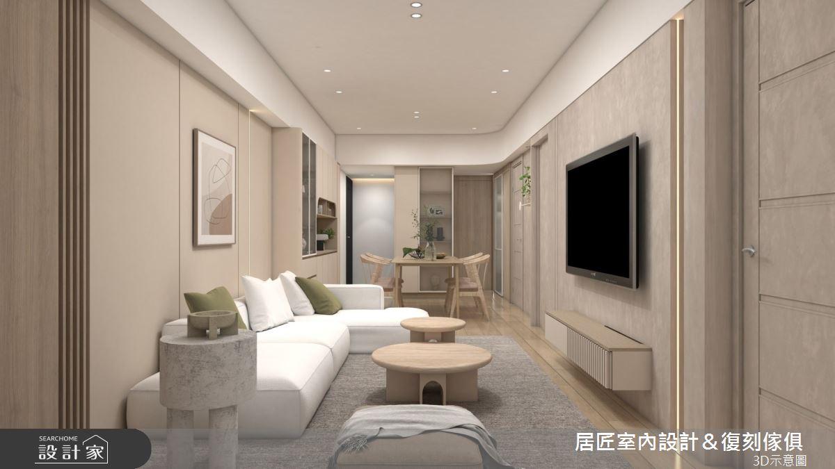本案為居匠室內設計&復刻傢俱的24坪奶茶風新成屋(5年以下)設計作品,格局為單層三房的居住空間。居住成員包含2位大人、2位小孩。全室建材的搭配,應用塗料、系統板、環保批批板、油漆、長虹玻璃、六角地磚,展現溫馨的居家氛圍。