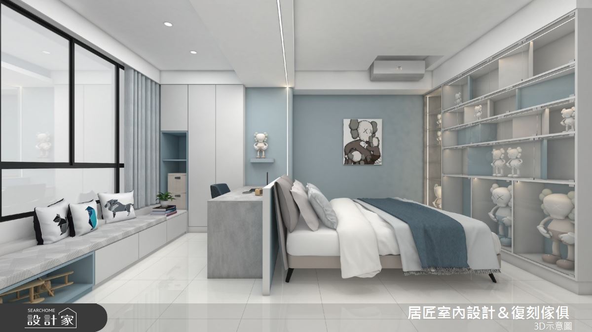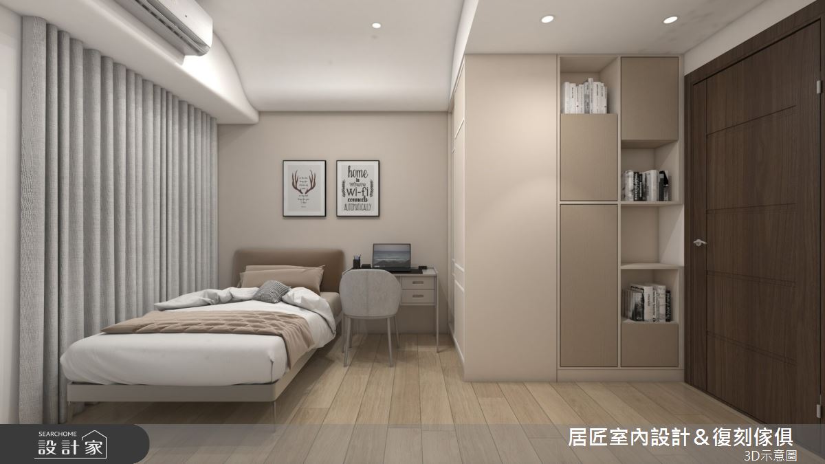 居匠室內設計&復刻傢俱以系統板、寫真板、美耐板、鐵件、油漆的搭配應用,呈現混搭風居家氛圍,將此間21坪、三房、單層、新成屋(5年以下)打造成舒適愜意的家庭空間,完成2位大人、2位小孩全家人的夢想之居。