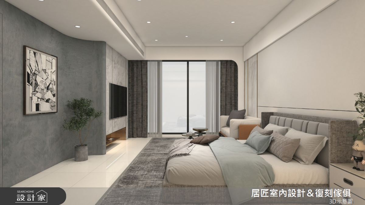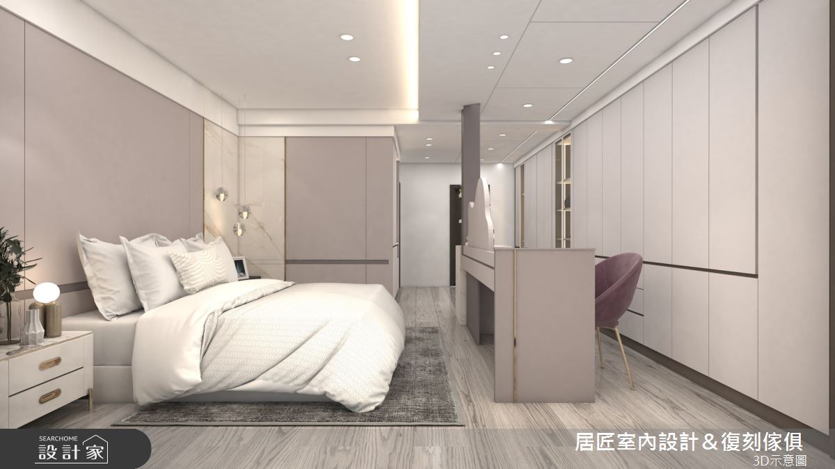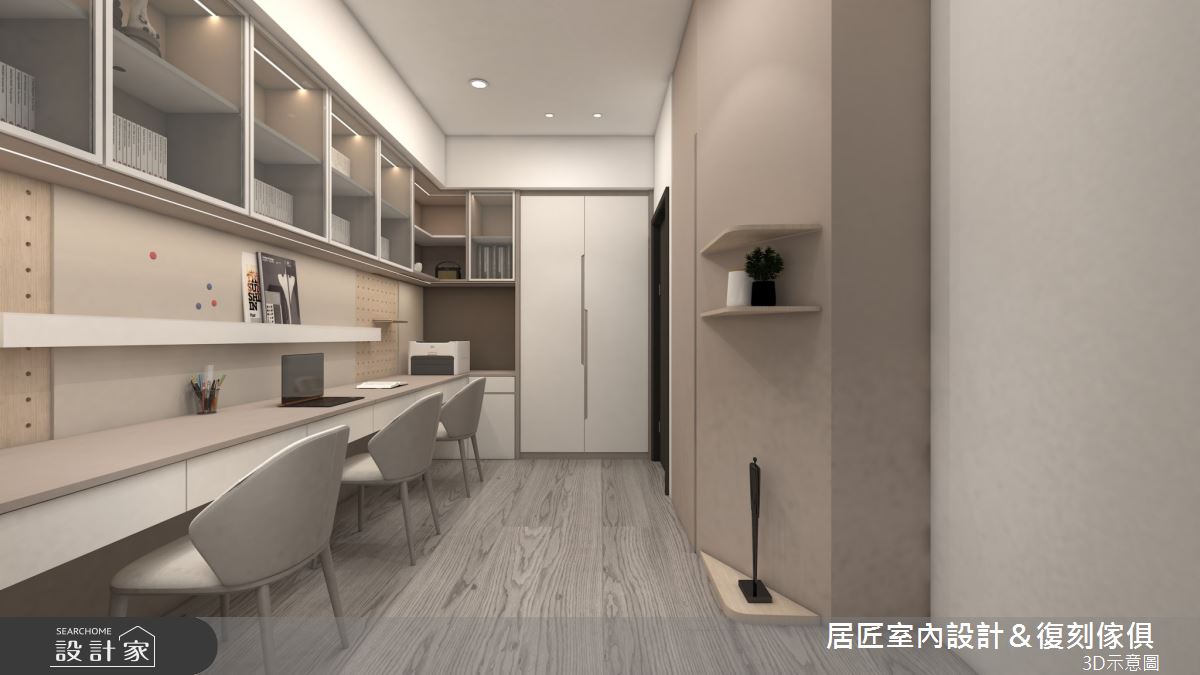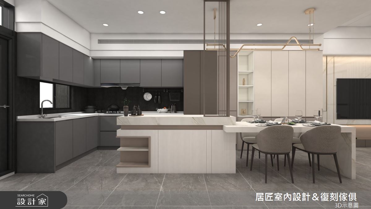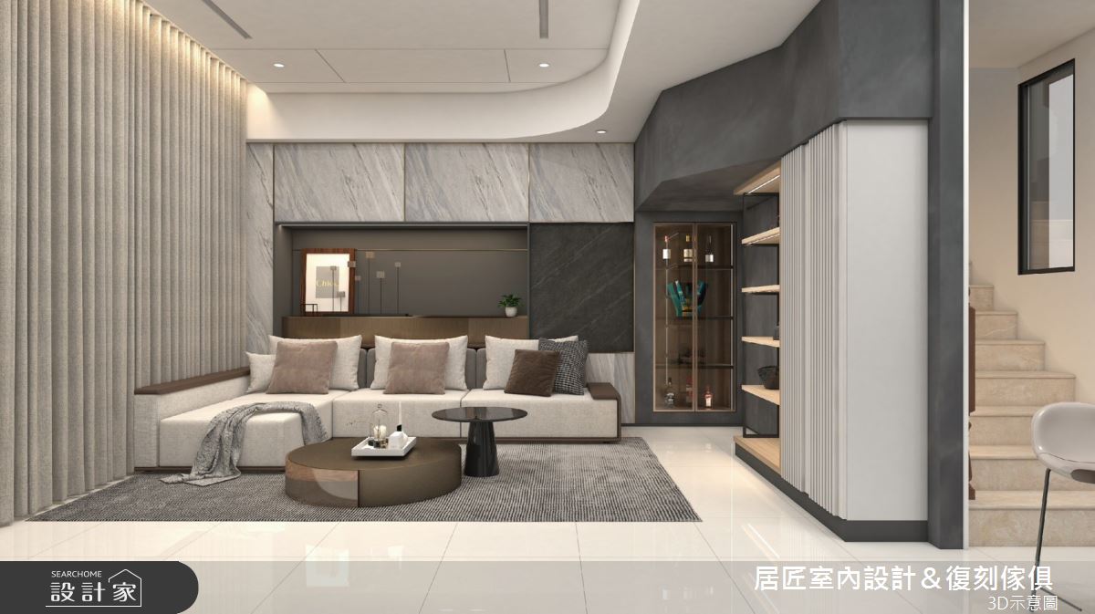 居匠室內設計&復刻傢俱以美耐板、鍍鈦條、人造石、系統板、環保批批板、油漆的搭配應用,呈現現代風居家氛圍,將此間47坪、三房、透天別墅、新成屋(5年以下)打造成舒適愜意的家庭空間,完成2位大人、2位小孩全家人的夢想之居。