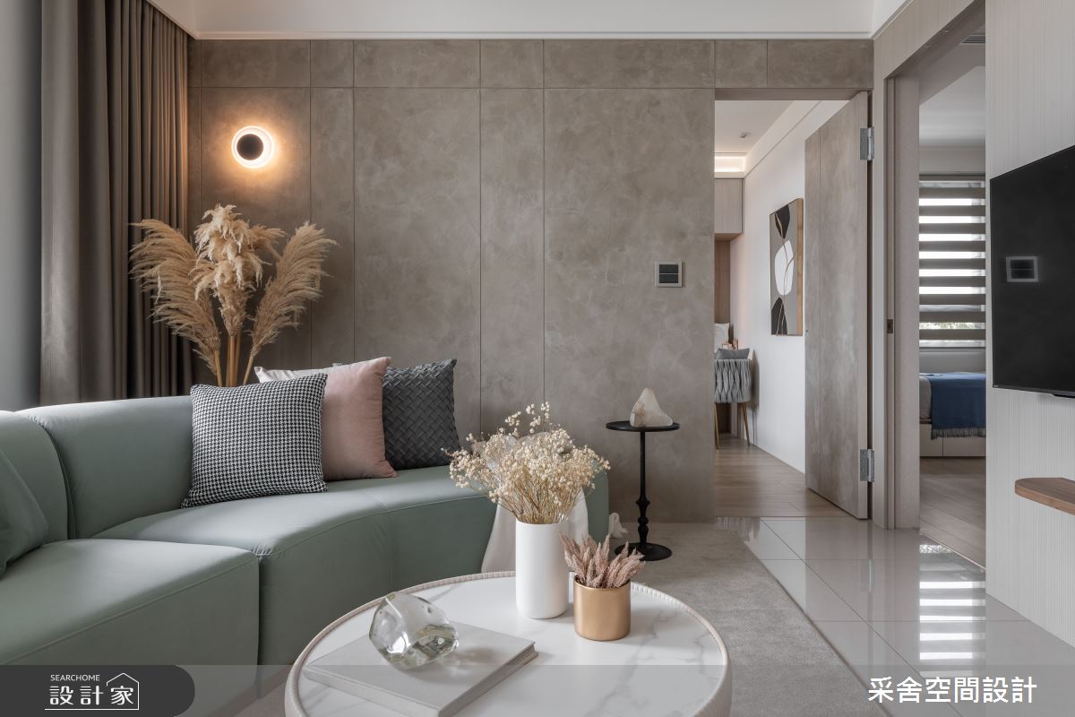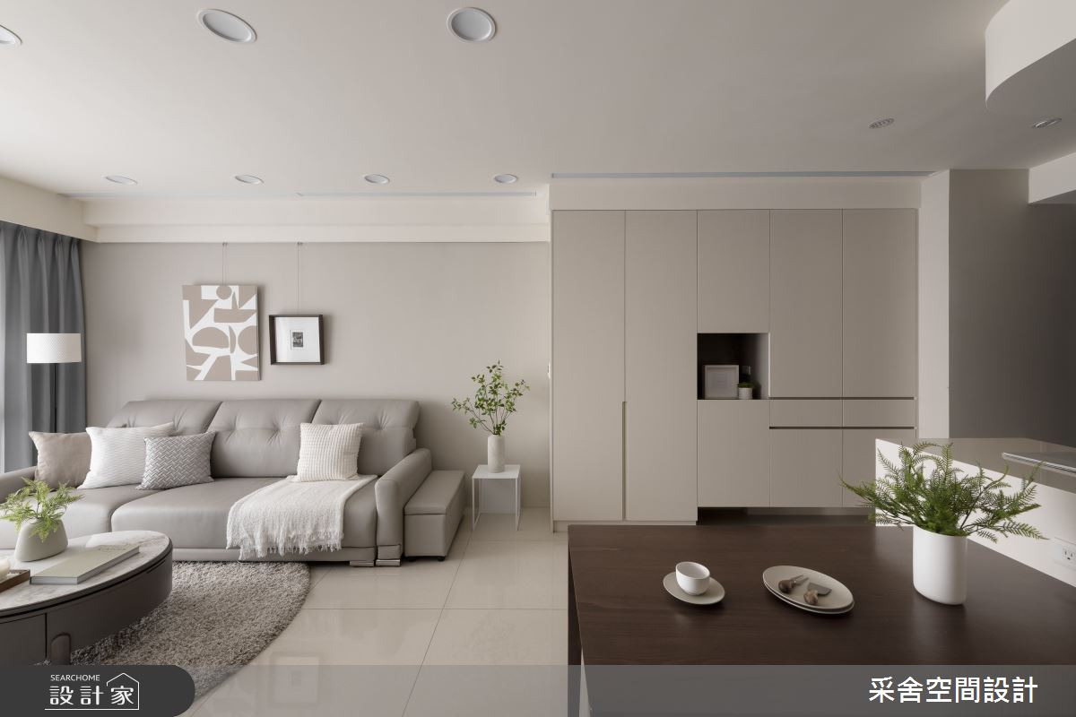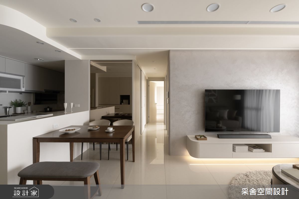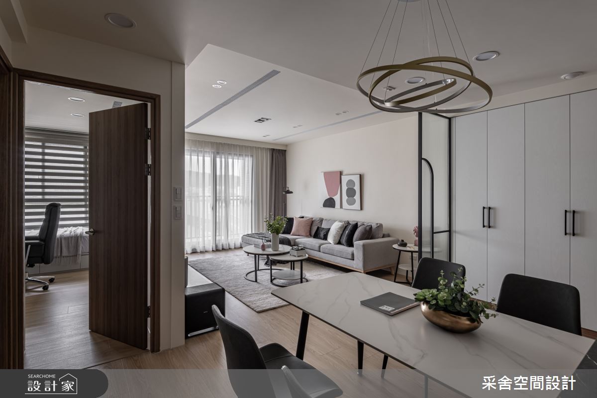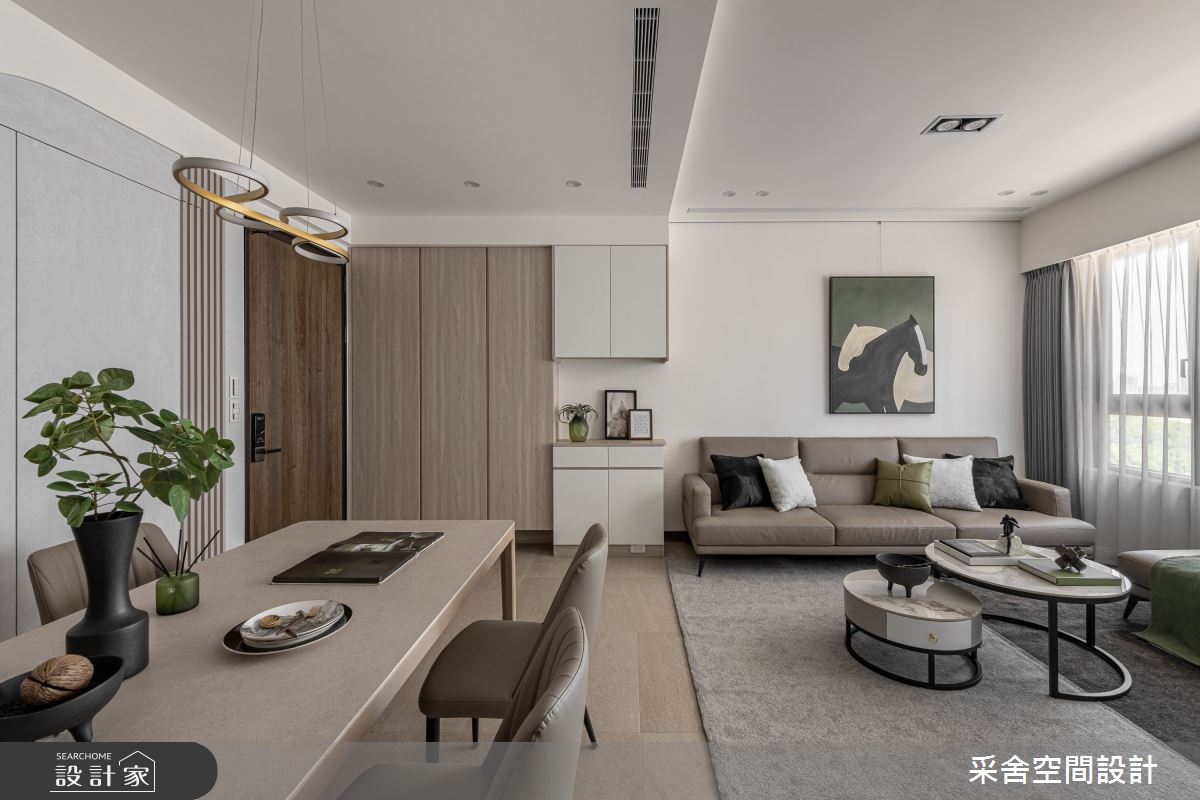 本案為采舍空間設計的31坪現代風新成屋(5年以下)設計作品,格局為單層三房的居住空間。居住成員包含1位大人、2位小孩。全室建材的搭配,應用乳膠漆、超耐磨木地板、鐵件、系統板材、spc地板、灰玻、金屬、大板磚,展現溫馨的居家氛圍。