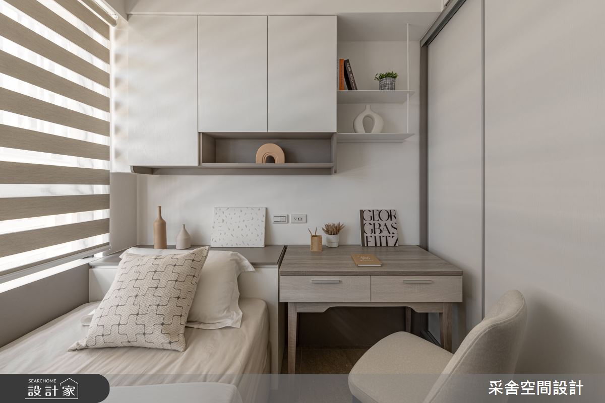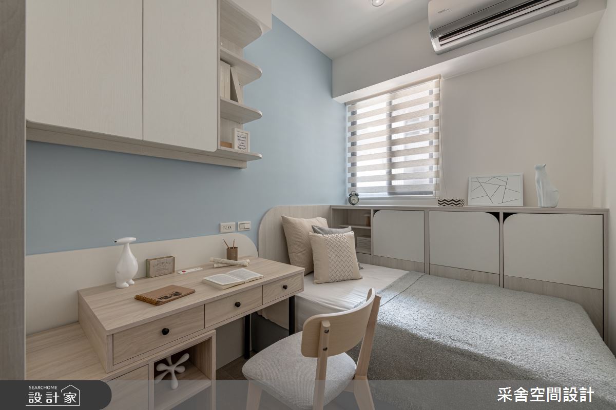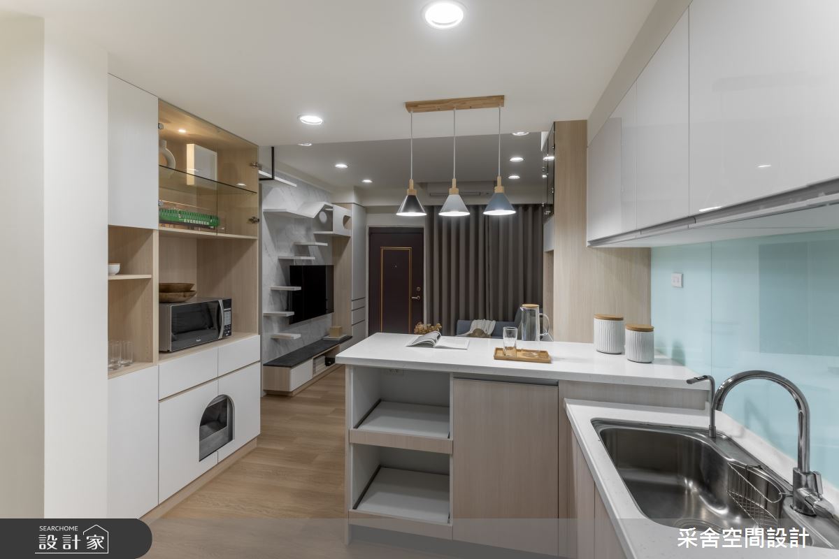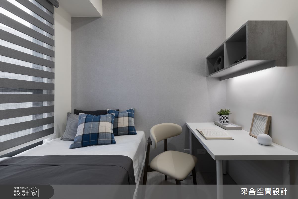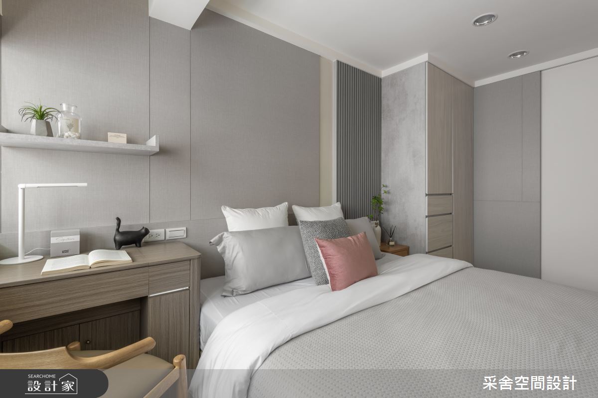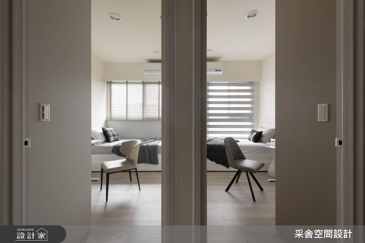 本案為采舍空間設計的31坪現代風新成屋(5年以下)設計作品,格局為單層三房的居住空間。居住成員包含1位大人、2位小孩。全室建材的搭配,應用乳膠漆、超耐磨木地板、鐵件、系統板材、spc地板、灰玻、金屬、大板磚,展現溫馨的居家氛圍。