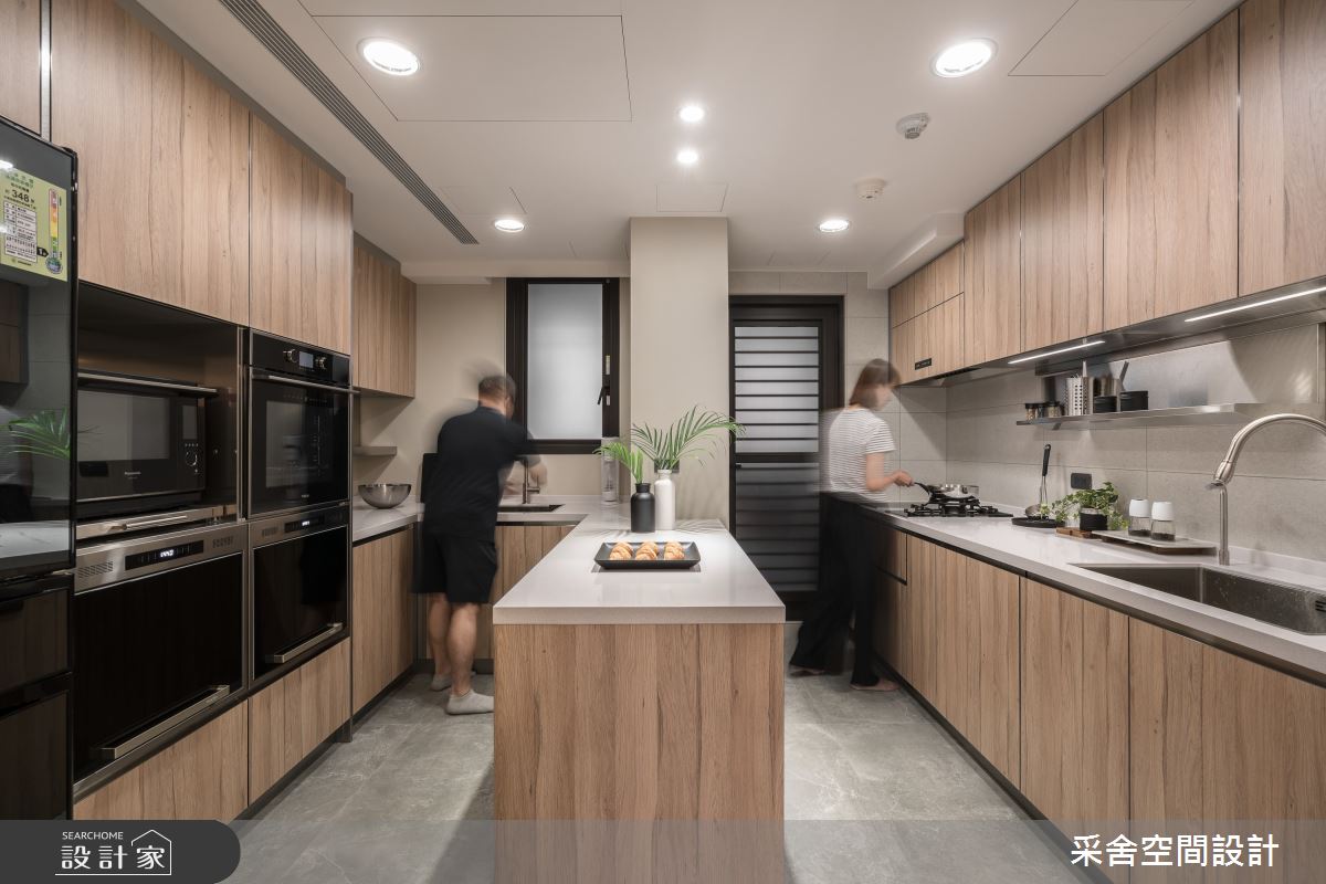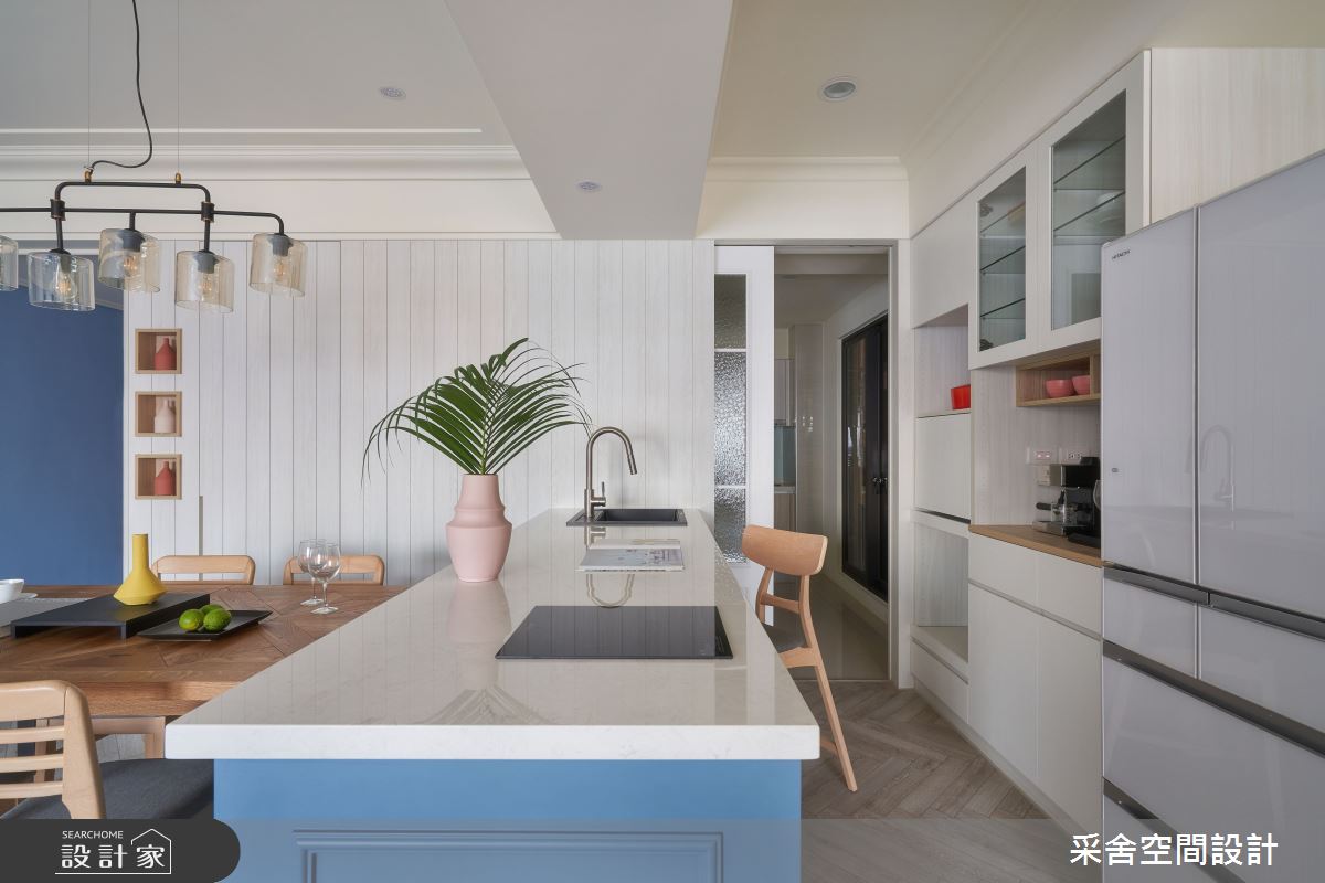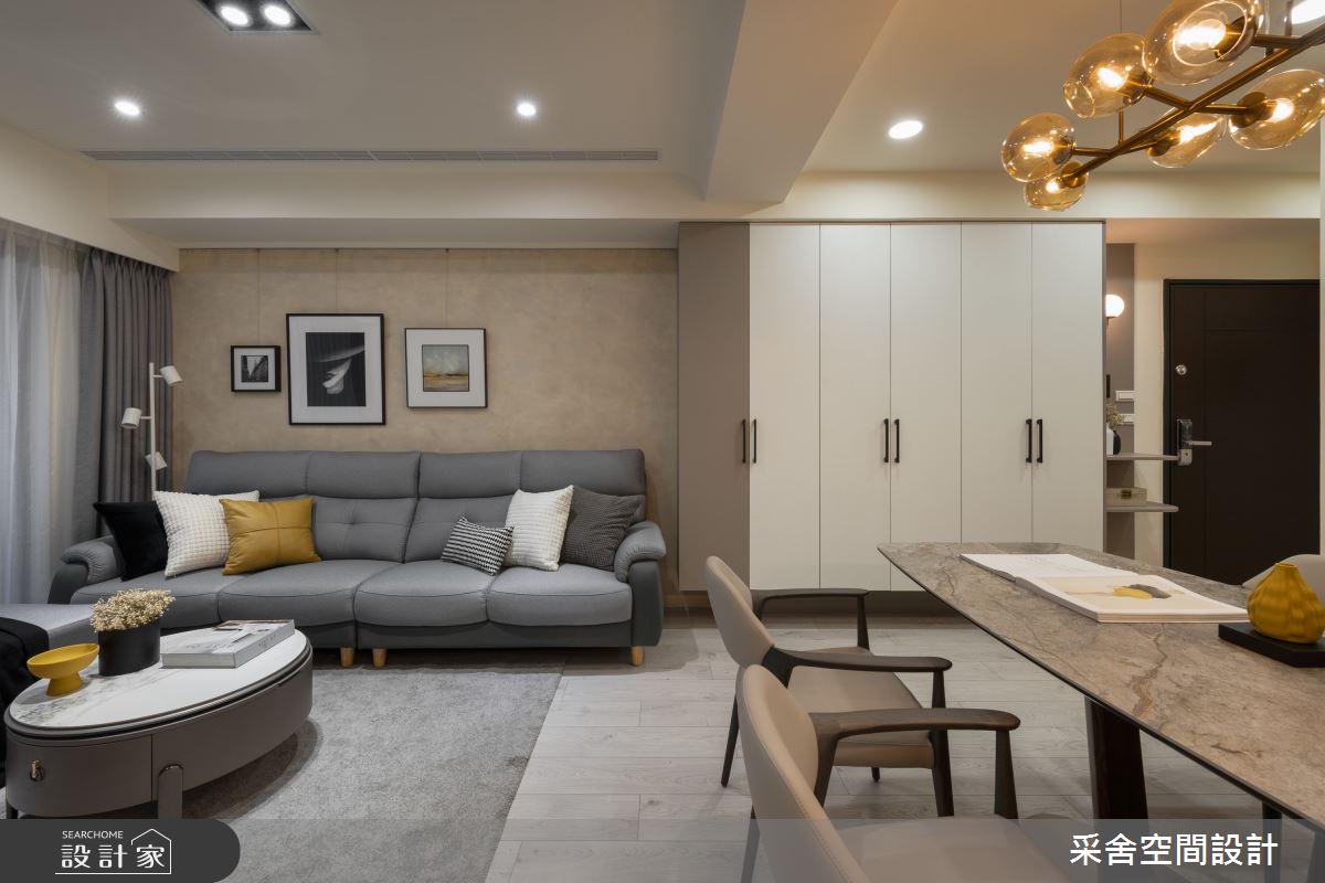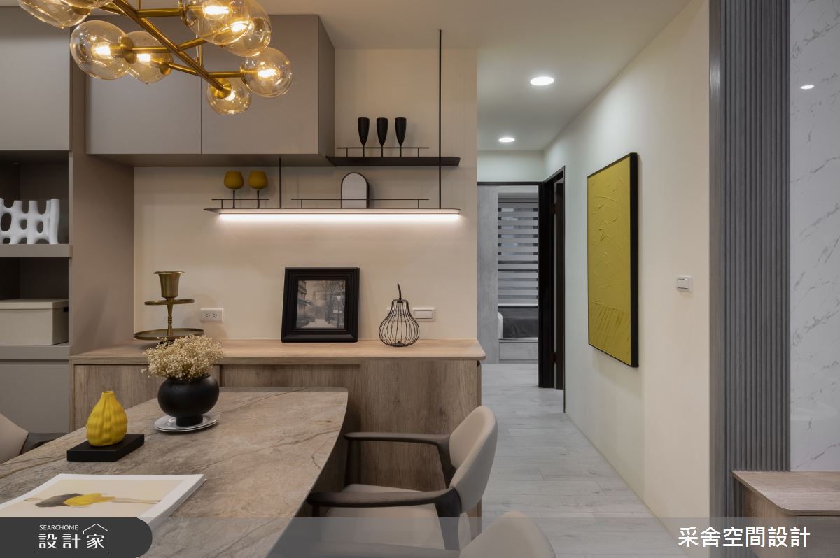采舍空間設計以石速板、鍍鈦金屬飾條、油漆跳色、鐵件拉門、隔柵板、木皮板的搭配應用,呈現現代風居家氛圍,將此間35坪、四房、單層、新成屋(5年以下)打造成舒適愜意的家庭空間,完成3位大人全家人的夢想之居。