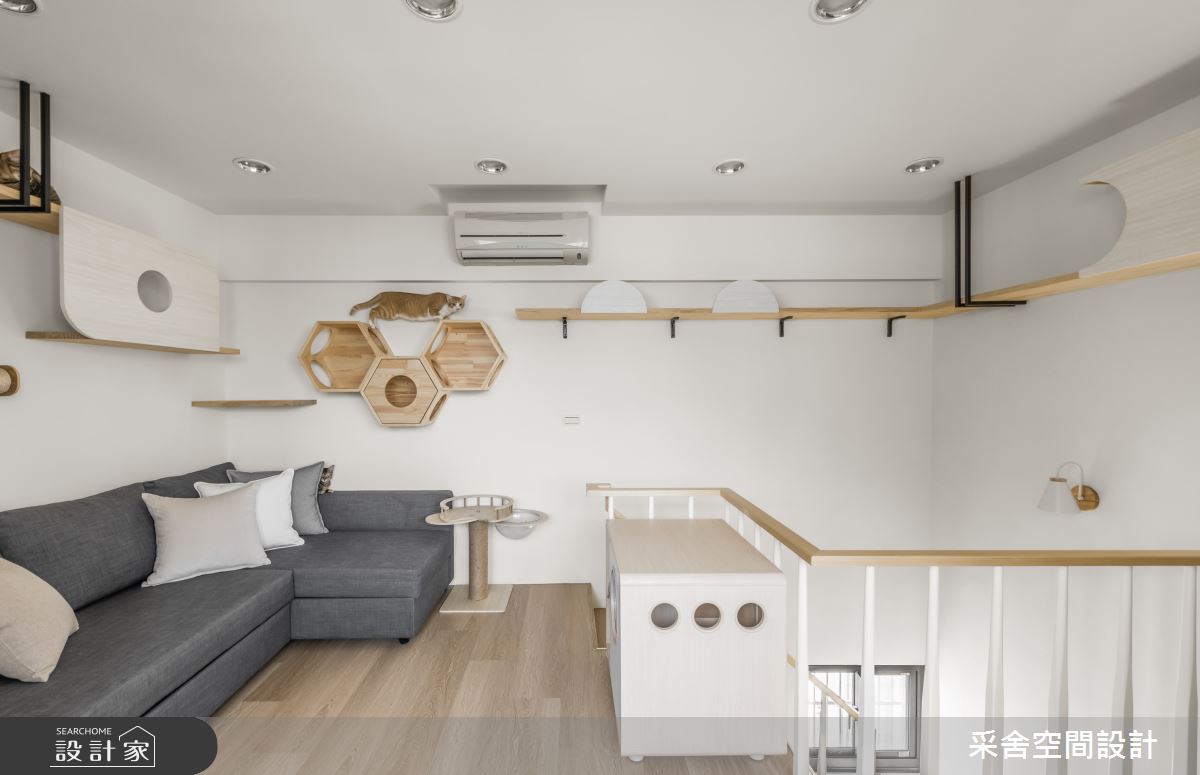 采舍空間設計以超耐磨木地板、鐵件、石塑板、造型鐵件、超耐磨地板、系統櫃、貓跳台的搭配應用,呈現北歐風居家氛圍,將此間41坪、六房、透天別墅、老屋(31~40年)打造成舒適愜意的家庭空間,完成5位大人全家人的夢想之居。