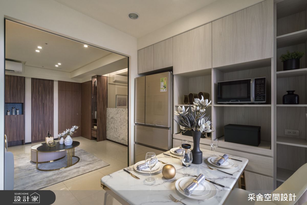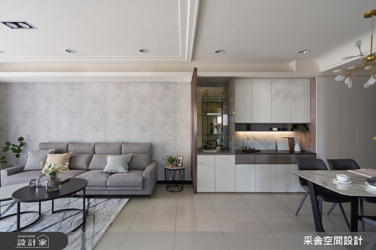 采舍空間設計以壁紙、系統櫃、進口壁紙、鍍鈦金屬條、石紋板的搭配應用,呈現現代風居家氛圍,將此間23坪、三房、單層、新成屋(5年以下)打造成舒適愜意的家庭空間,完成2位大人全家人的夢想之居。