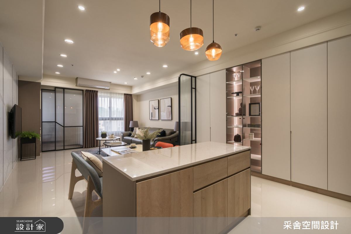 采舍空間設計以鐵件、系統櫃、油漆跳色、進口壁紙、鍍鈦金屬條、薄磚的搭配應用,呈現現代風居家氛圍,將此間20.3坪、三房、單層、新成屋(5年以下)打造成舒適愜意的家庭空間,完成2位大人、2位小孩全家人的夢想之居。