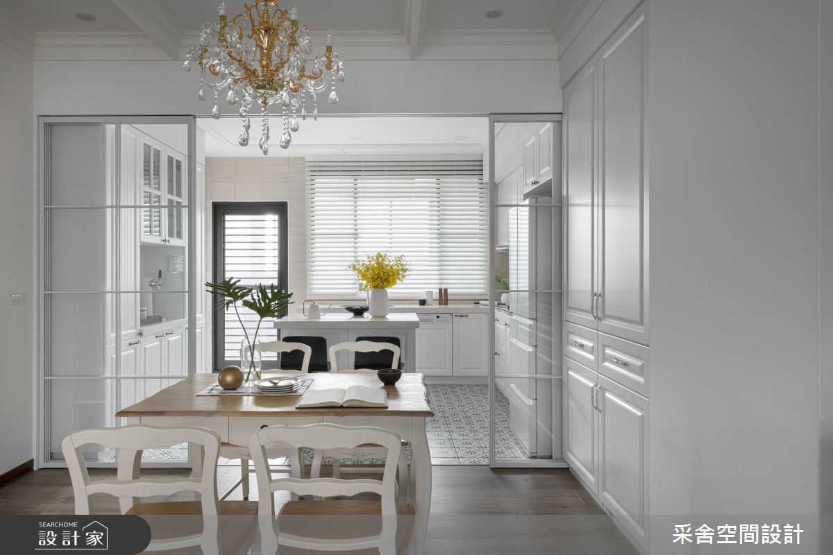 由采舍空間設計精心規劃的35坪四房住宅空間。因應屋主需求,設計師運用美式風作為主軸,搭配花磚、超耐磨木地板、烤漆、系統板材、線板,打造全家人的夢想家居。