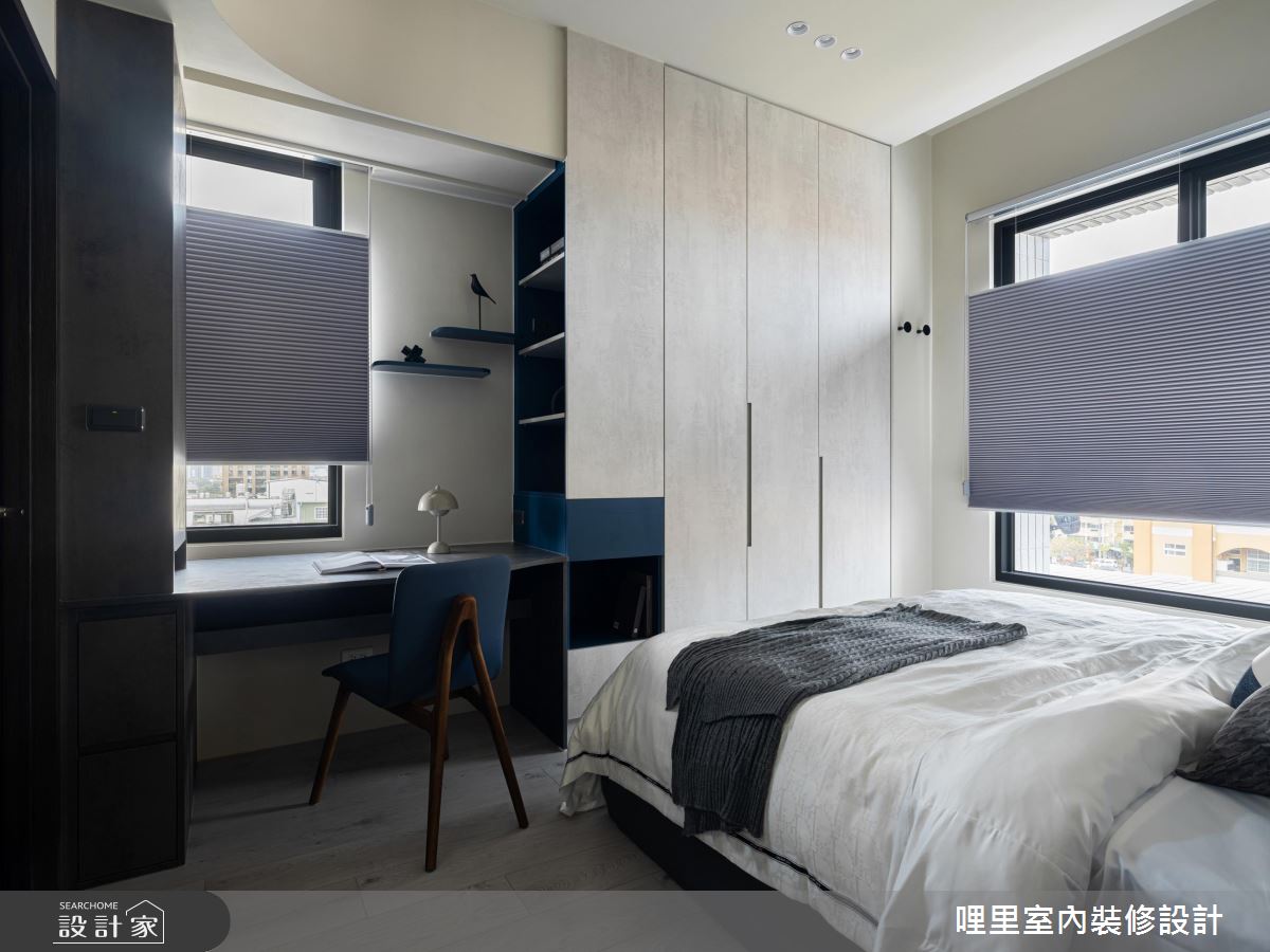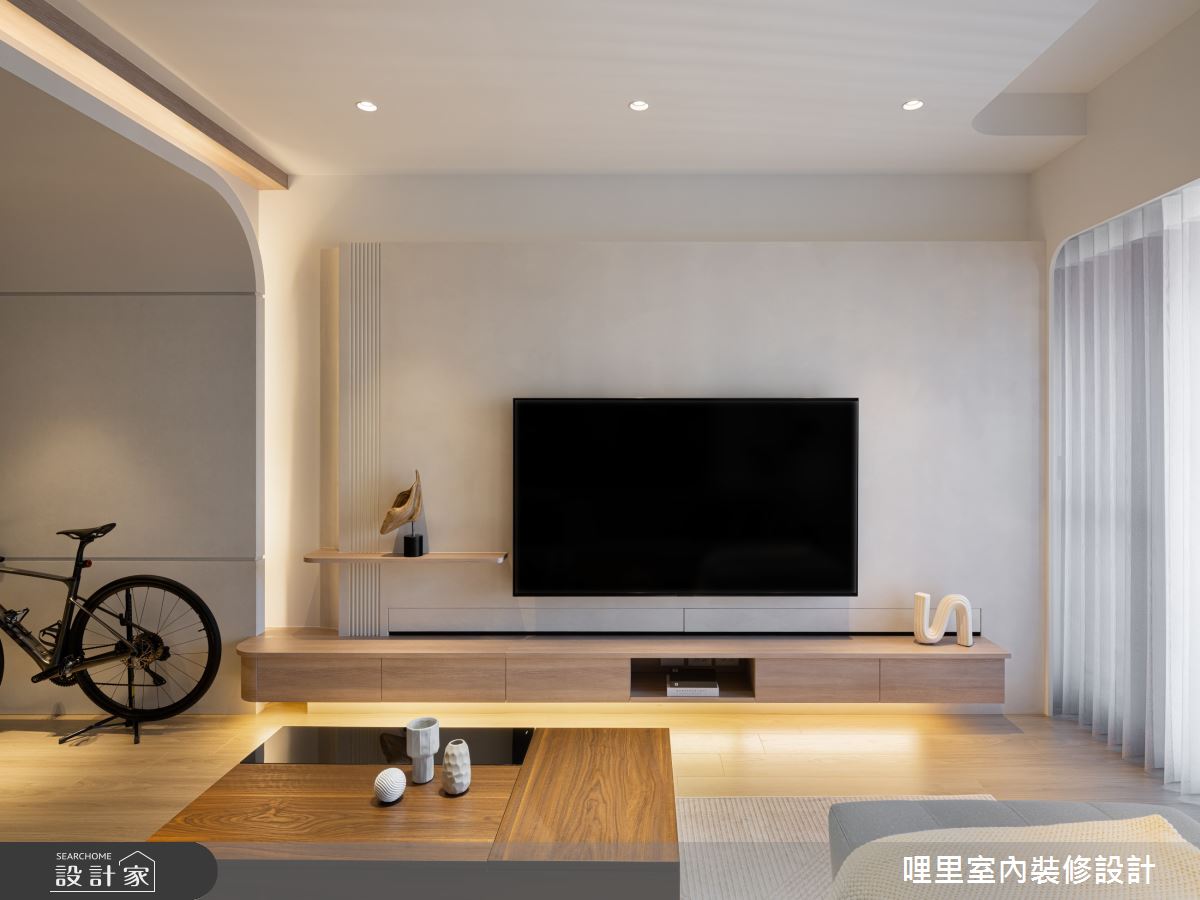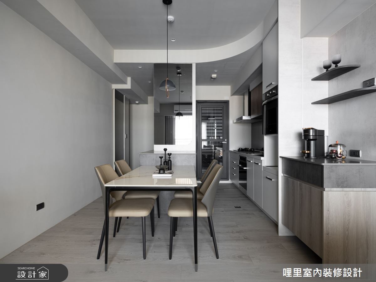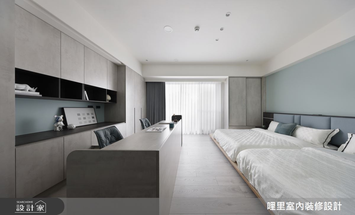 哩里室內裝修設計以調色漆、藝術塗料、鋁框門、系統櫃、風琴簾、穿透簾、石英石、鐵件、烤漆玻璃、磁性板、沖孔板、灰鏡、灰玻、長虹玻璃、小冰柱玻璃、裱布的搭配應用,呈現現代風居家氛圍,將此間23坪、三房、單層、預售屋打造成舒適愜意的家庭空間,完成2位大人全家人的夢想之居。