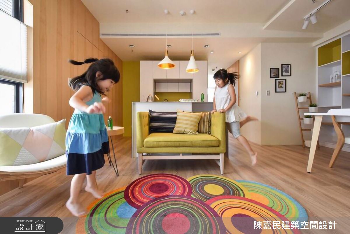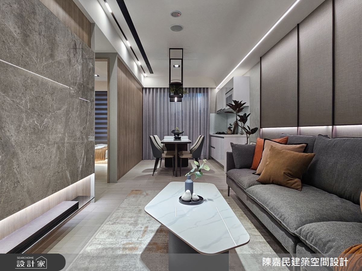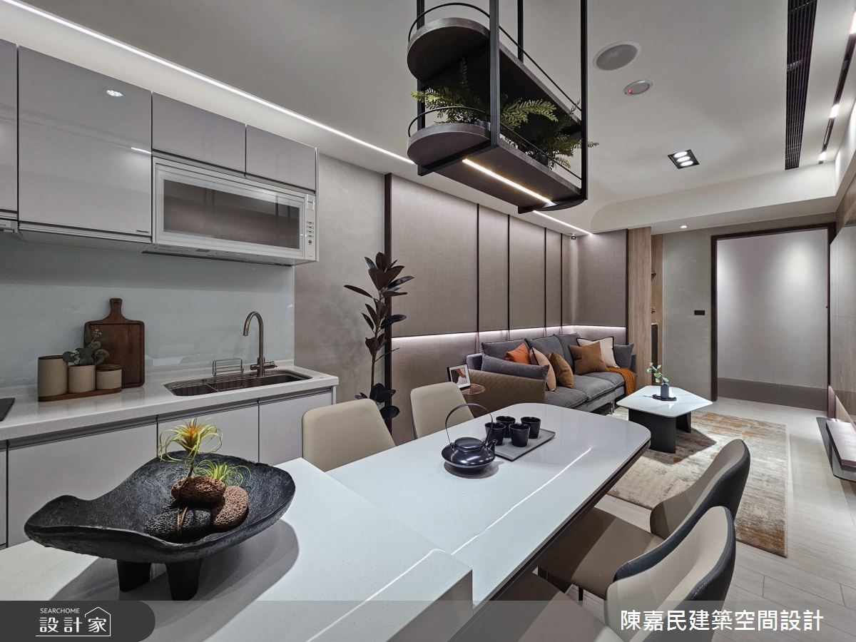 陳嘉民建築空間設計以油漆、壁紙、超耐磨木地板、鐵件、烤漆、系統板材、大理石、人造石、石材、薄板的搭配應用,呈現現代風居家氛圍,將此間23坪、兩房、單層、預售屋打造成舒適愜意的家庭空間,完成2位大人全家人的夢想之居。
