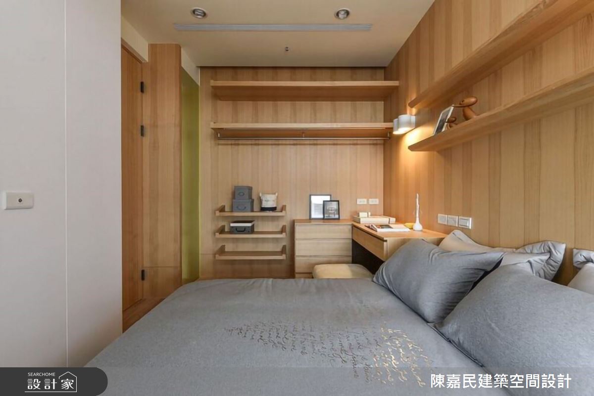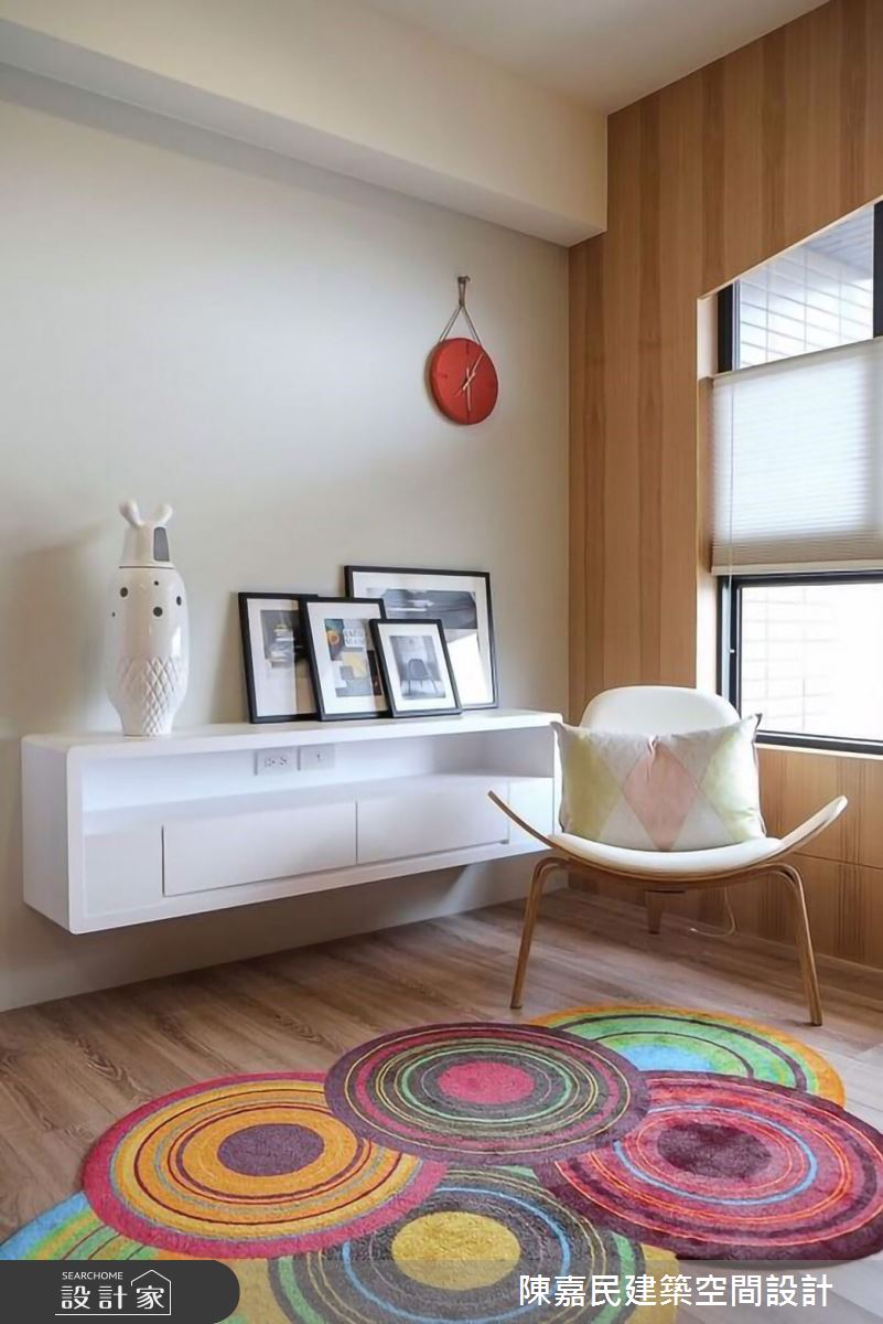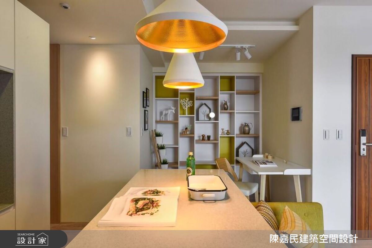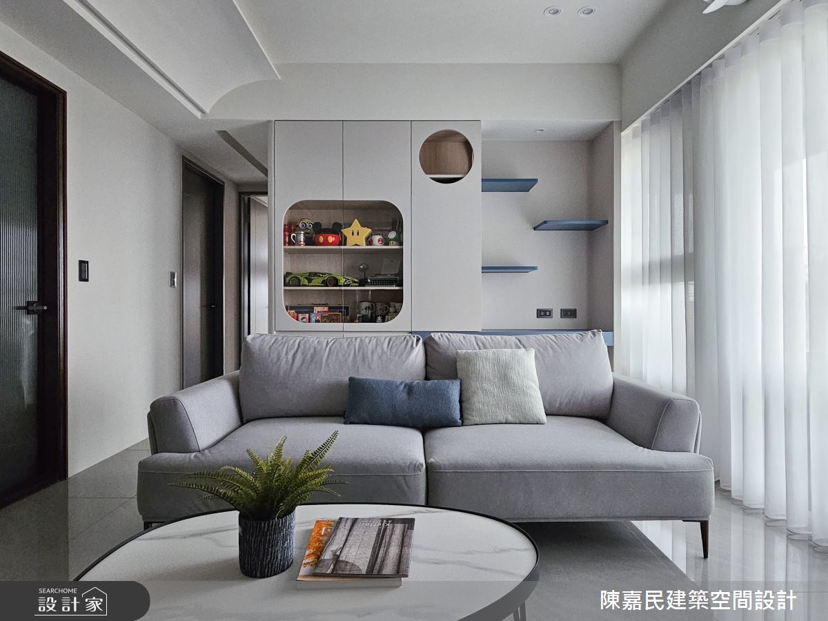 陳嘉民建築空間設計以油漆、壁紙、超耐磨木地板、鐵件、烤漆、系統板材、大理石、人造石、石材、薄板的搭配應用,呈現現代風居家氛圍,將此間23坪、兩房、單層、預售屋打造成舒適愜意的家庭空間,完成2位大人全家人的夢想之居。