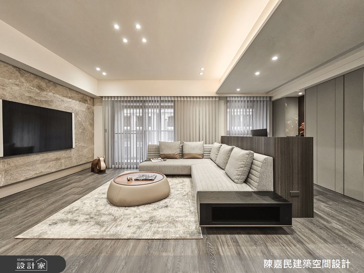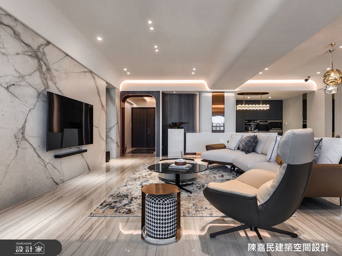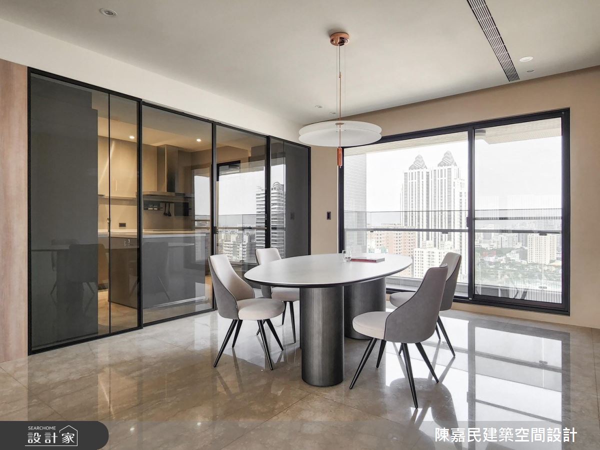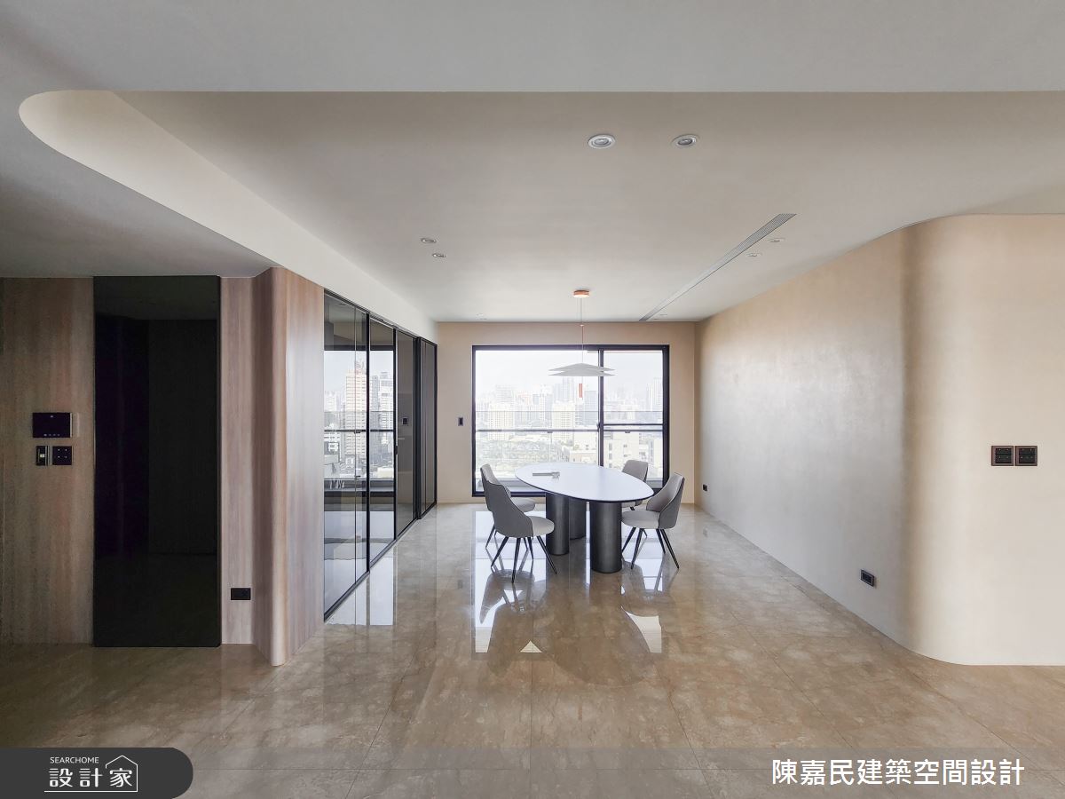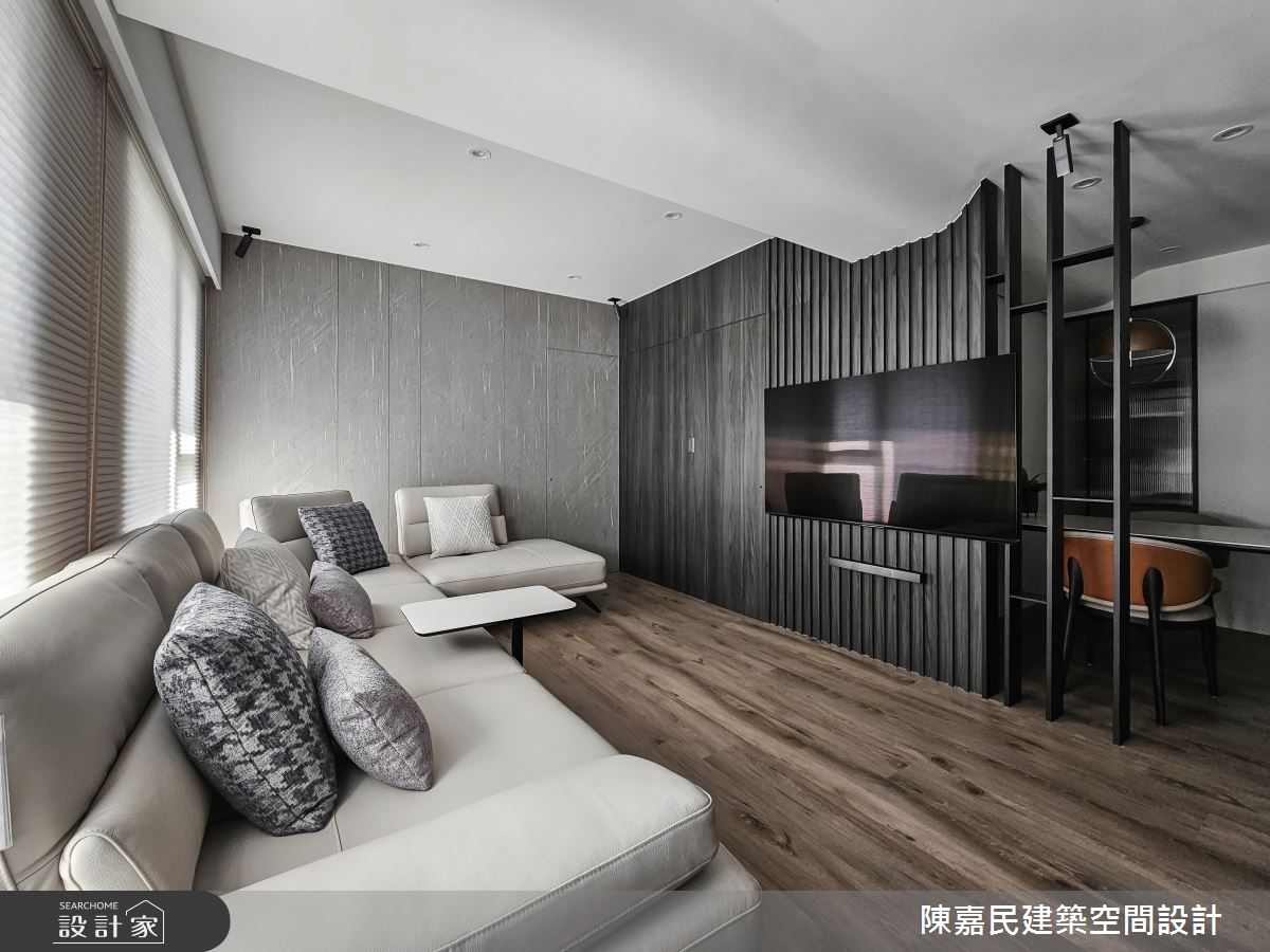 陳嘉民建築空間設計以乳膠漆、壁紙、石英磚/拋光石英磚、不鏽鋼、鐵件、灰鏡、鍍鈦金屬、木作貼皮、系統板材、磁磚、繃布、噴漆的搭配應用,呈現混搭風居家氛圍,將此間45坪、三房、單層、新成屋(5年以下)打造成舒適愜意的家庭空間,完成全家人的夢想之居。