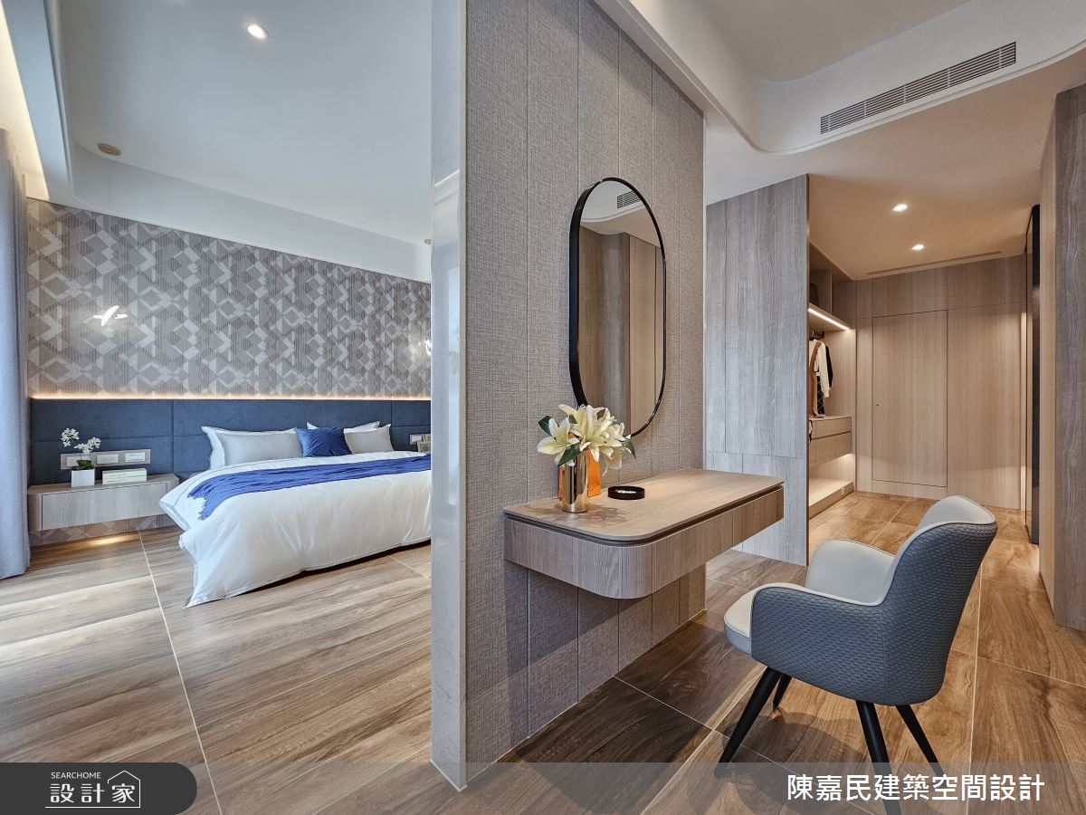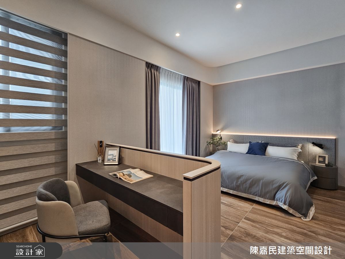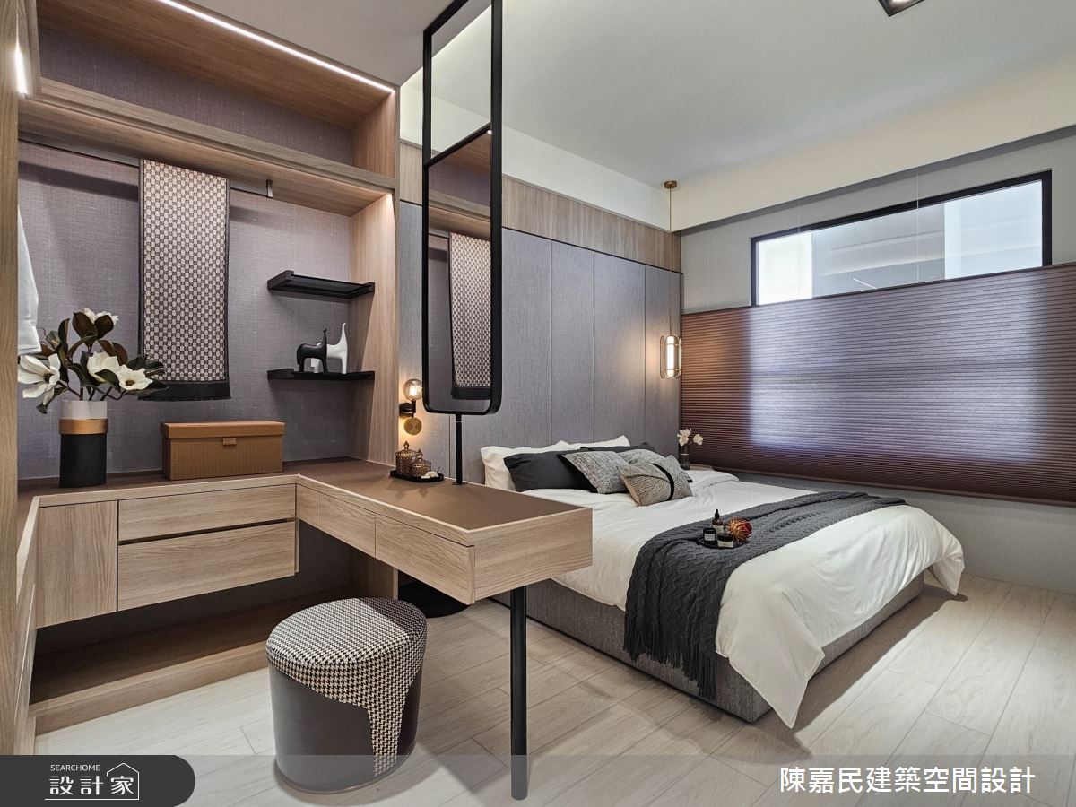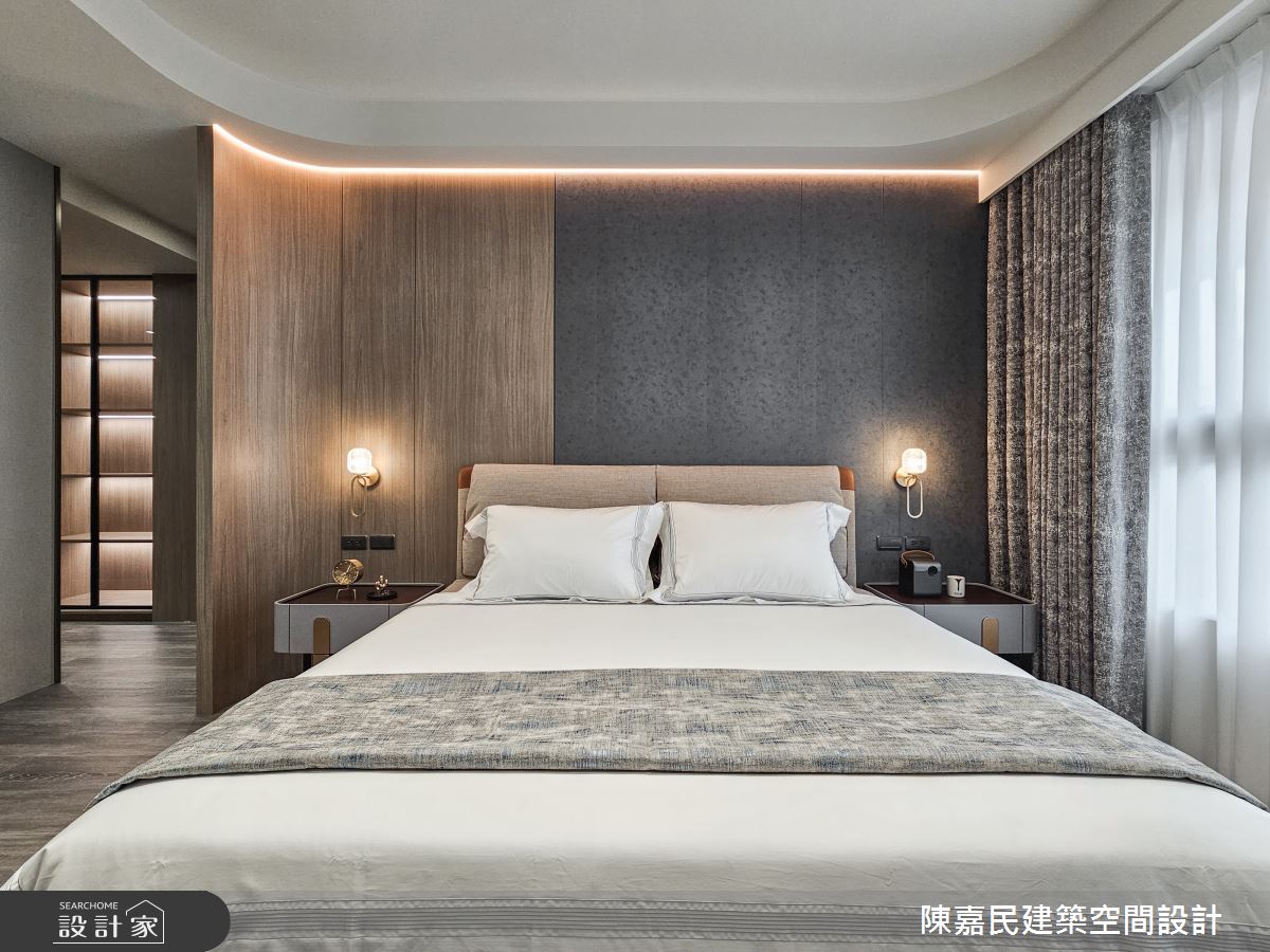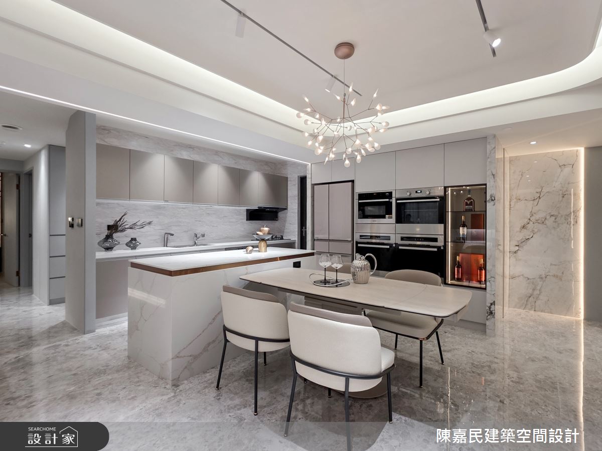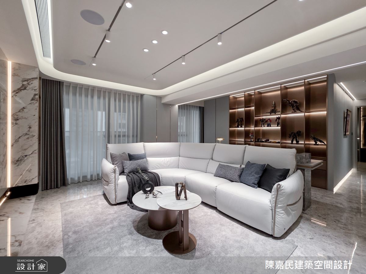 陳嘉民建築空間設計以乳膠漆、壁紙、石英磚/拋光石英磚、不鏽鋼、鐵件、灰鏡、鍍鈦金屬、木作貼皮、系統板材、磁磚、繃布、噴漆的搭配應用,呈現混搭風居家氛圍,將此間45坪、三房、單層、新成屋(5年以下)打造成舒適愜意的家庭空間,完成全家人的夢想之居。