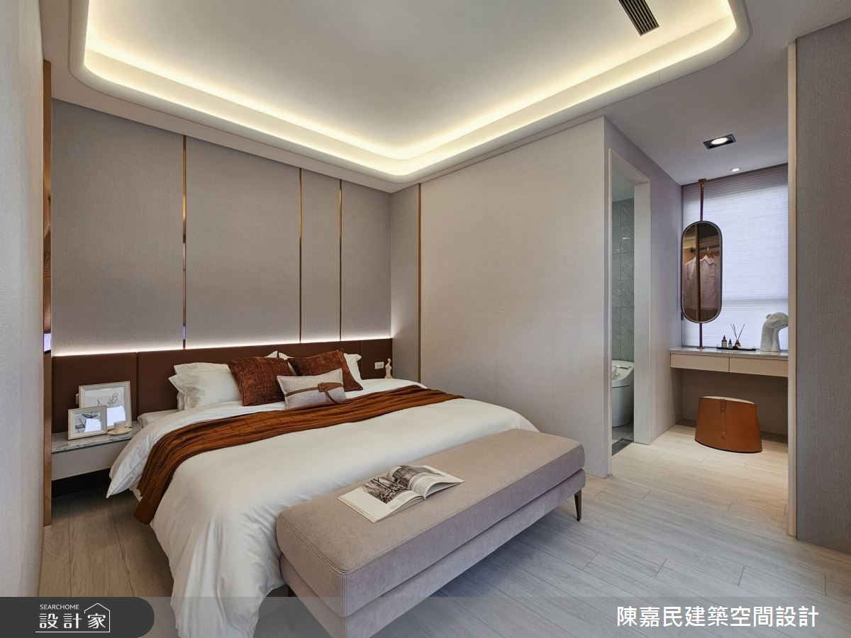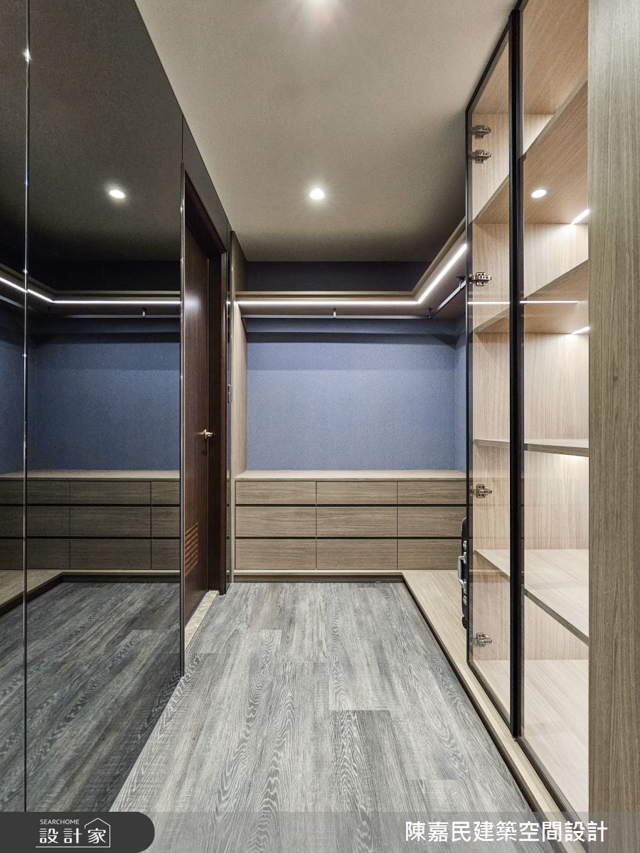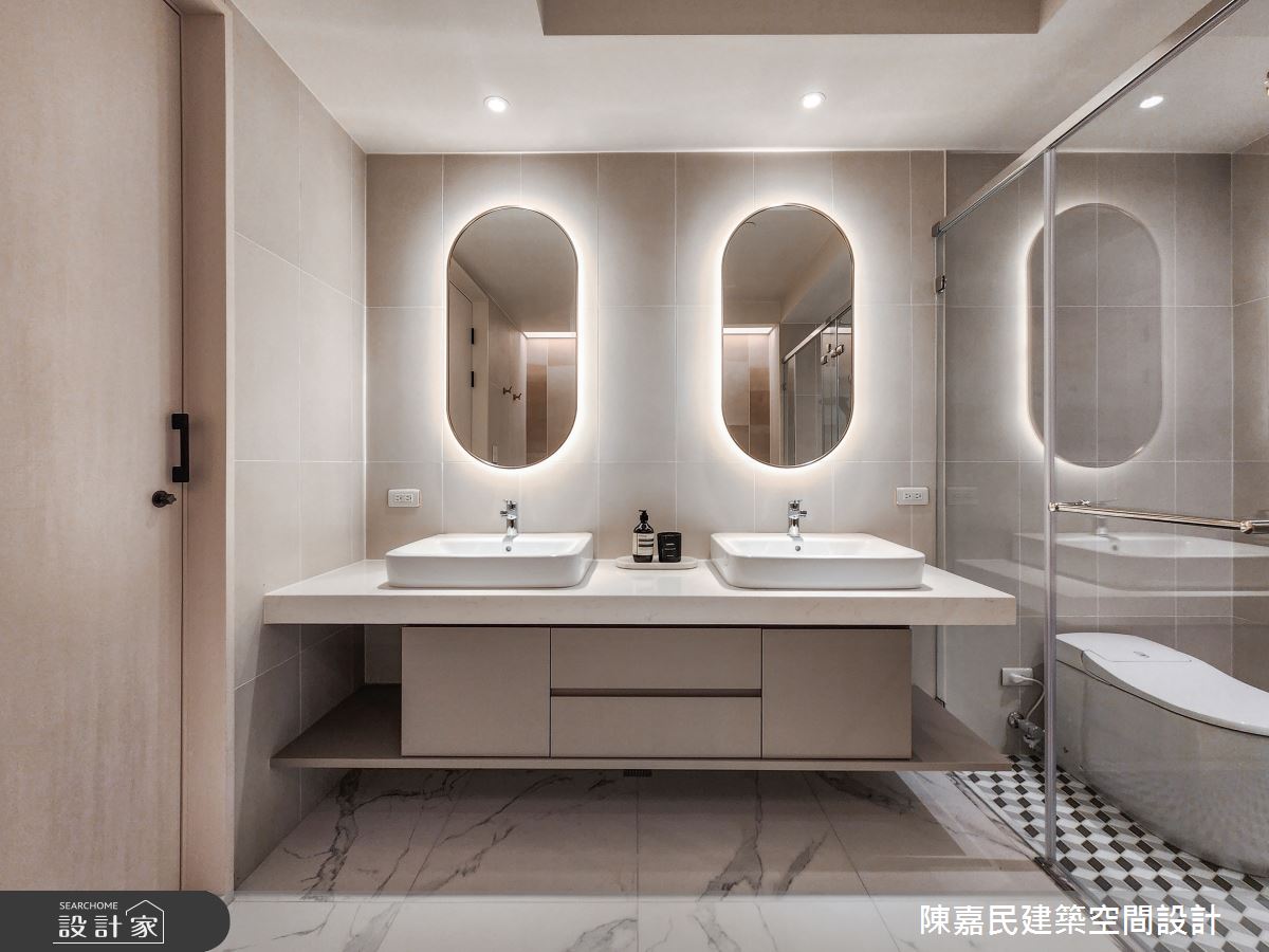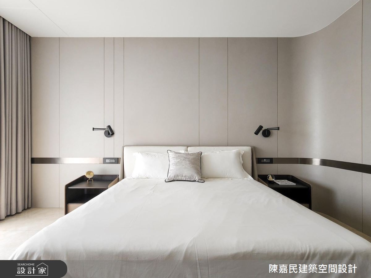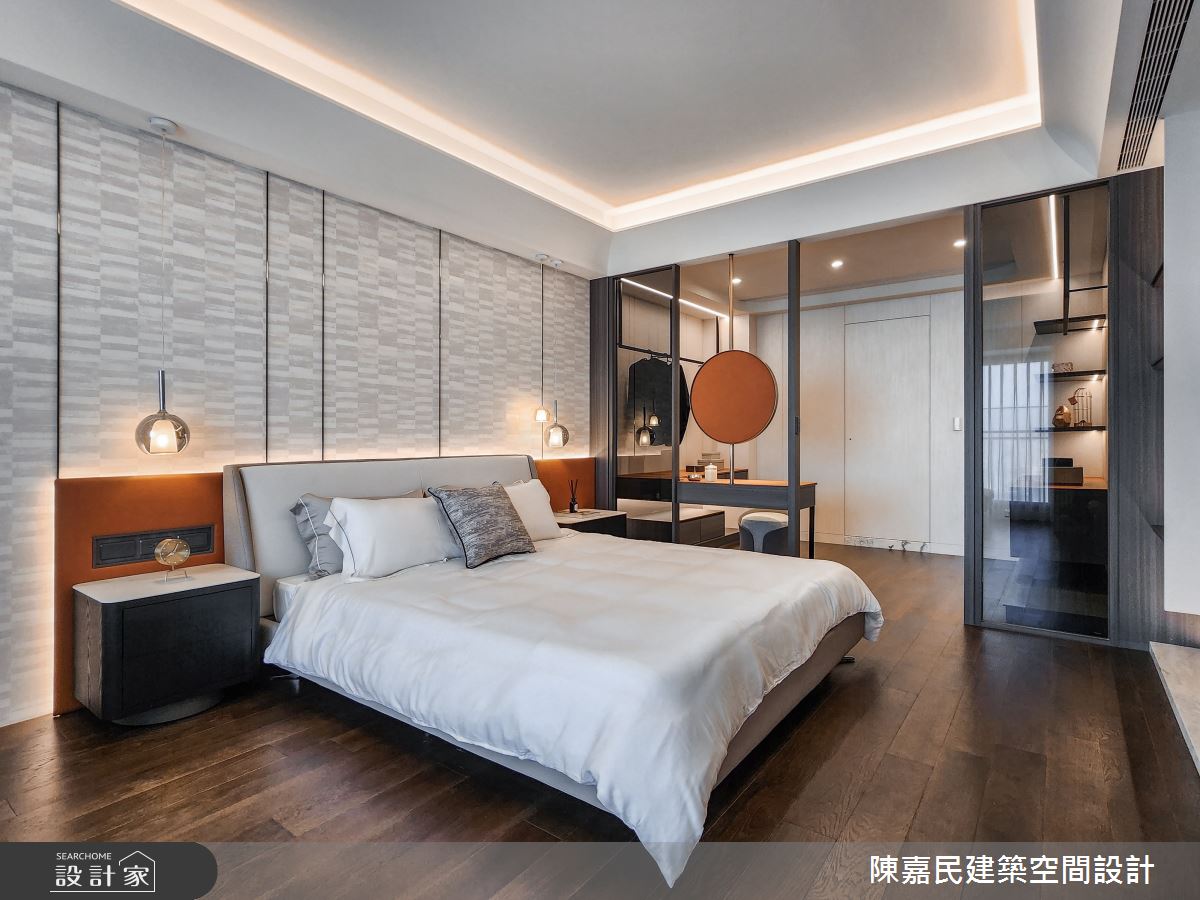 陳嘉民建築空間設計以乳膠漆、壁紙、石英磚/拋光石英磚、不鏽鋼、鐵件、灰鏡、鍍鈦金屬、木作貼皮、系統板材、磁磚、繃布、噴漆的搭配應用,呈現混搭風居家氛圍,將此間45坪、三房、單層、新成屋(5年以下)打造成舒適愜意的家庭空間,完成全家人的夢想之居。