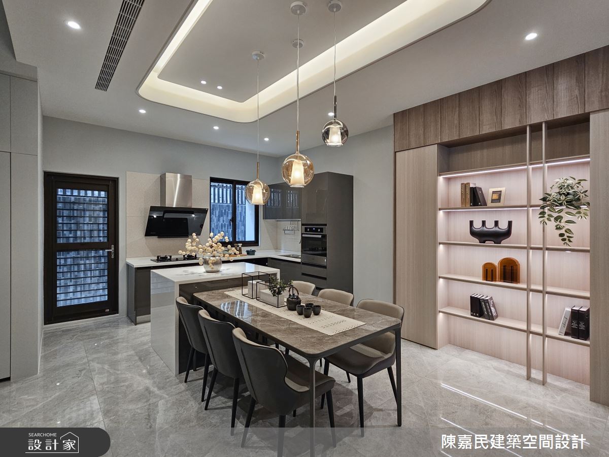 來自陳嘉民建築空間設計的60坪美式風住宅案,屋主一家人共有2位大人,是一間單層毛胚屋的四房格局,設計師藉由建材以薄板磚、鍍鈦金屬、石材的搭配應用,實現一家人的理想生活。