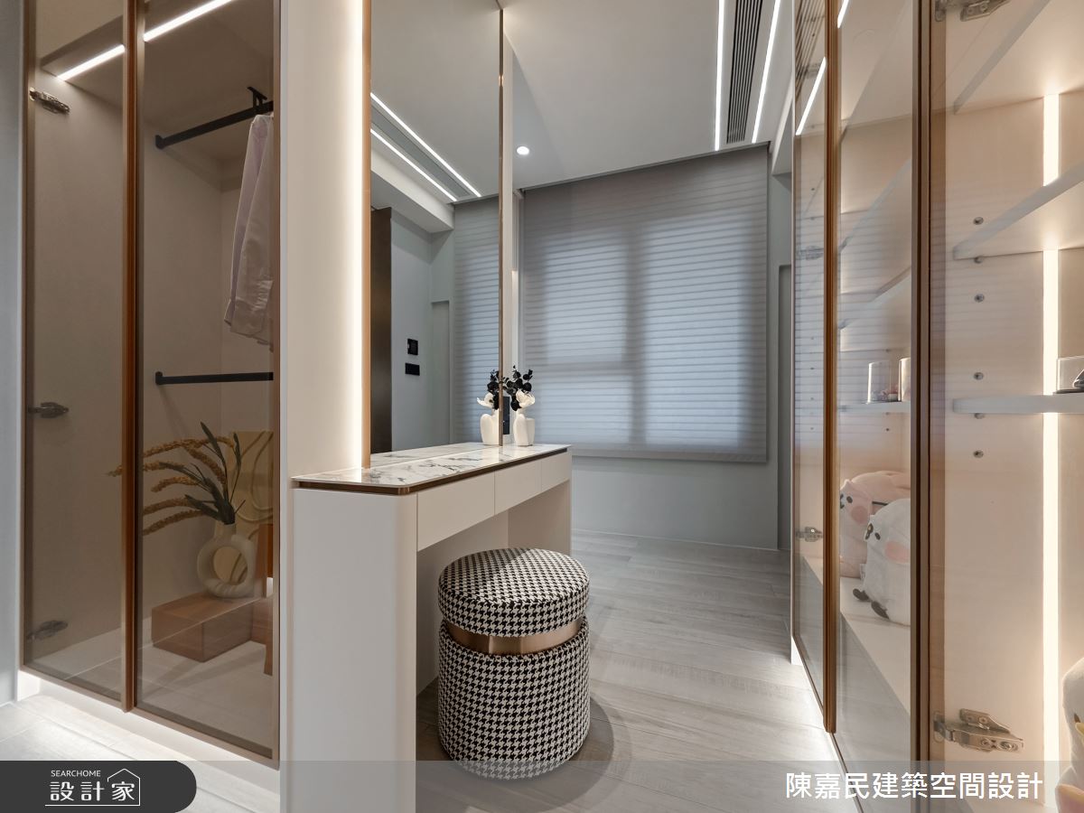 來自陳嘉民建築空間設計的28坪奢華風住宅案,是一間單層預售屋的四房格局,設計師藉由建材以壁紙、木地板、鐵件、茶玻、鍍鈦金屬、烤漆、大理石、木百葉、石材、噴漆的搭配應用,實現一家人的理想生活。