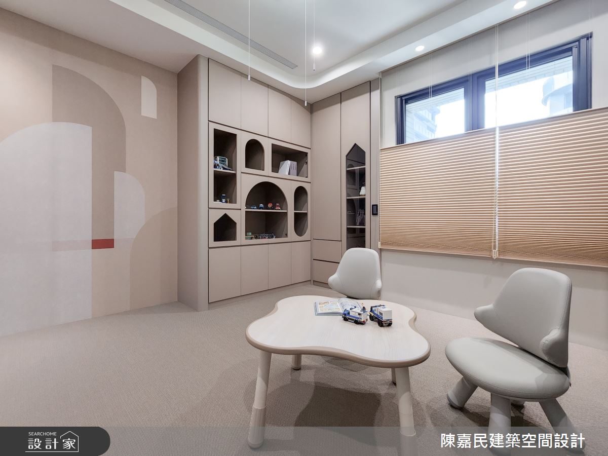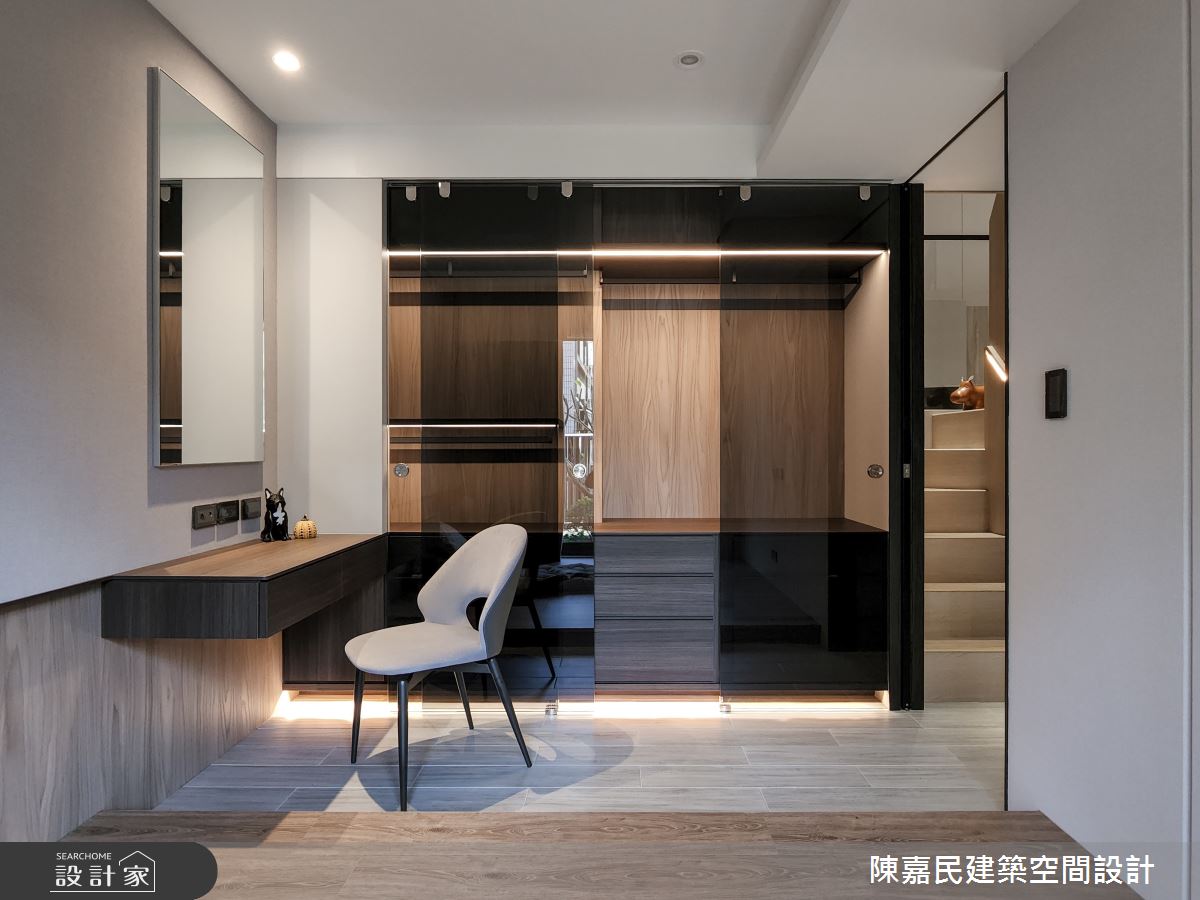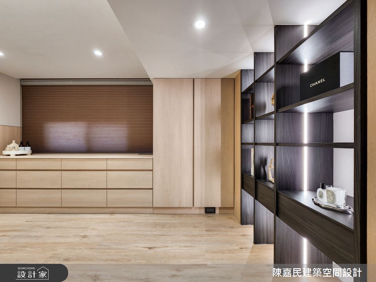 陳嘉民建築空間設計以壁紙、木地板、茶玻、烤漆、木百葉、石材、噴漆的搭配應用,呈現簡約風居家氛圍,將此間28坪、三房、複層、新成屋(5年以下)打造成舒適愜意的家庭空間,完成2位大人、1位小孩全家人的夢想之居。