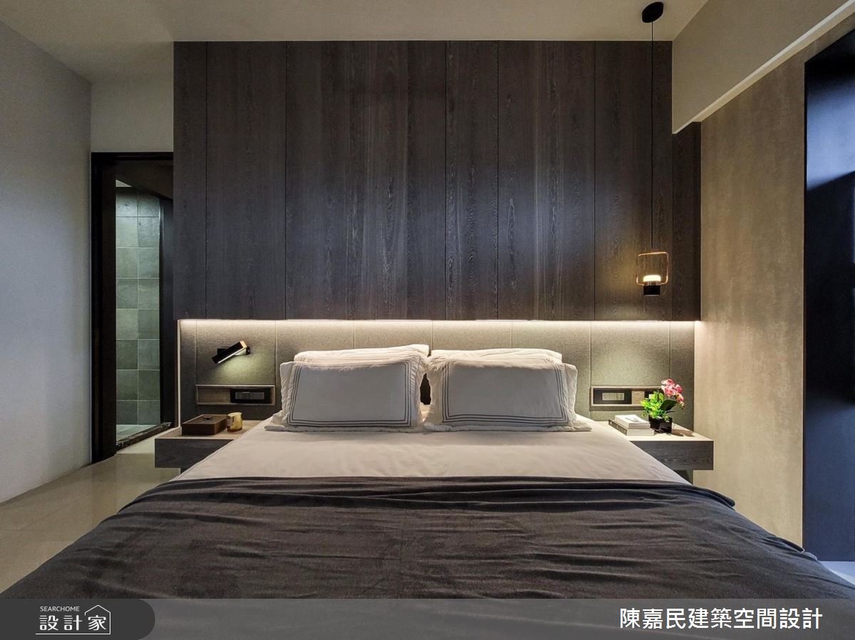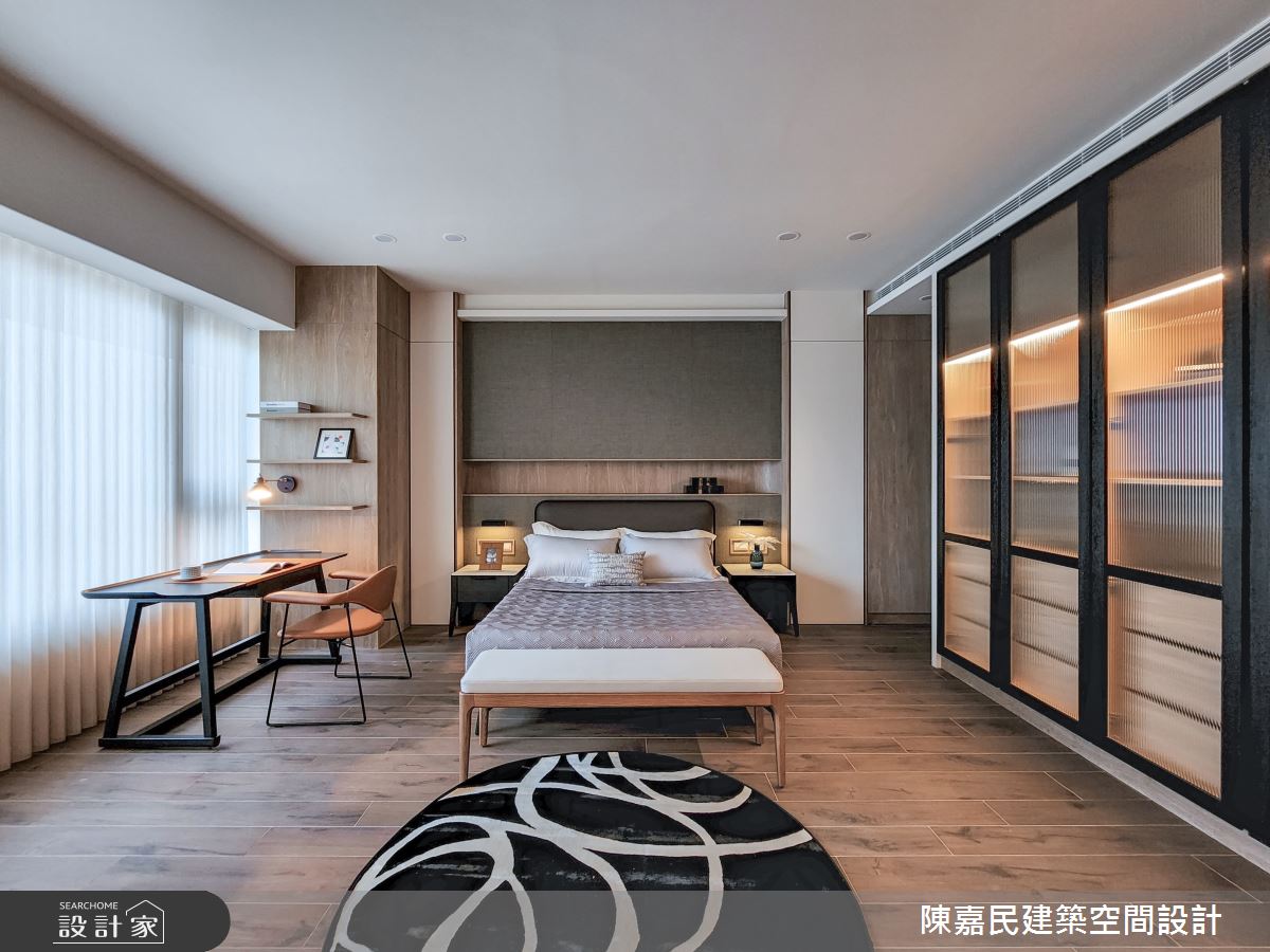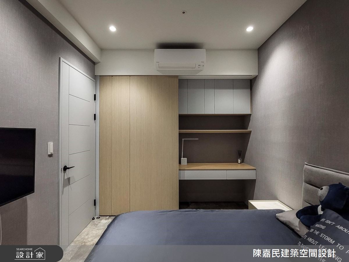 陳嘉民建築空間設計以壁紙、木地板、茶玻、烤漆、木百葉、石材、噴漆的搭配應用,呈現簡約風居家氛圍,將此間28坪、三房、複層、新成屋(5年以下)打造成舒適愜意的家庭空間,完成2位大人、1位小孩全家人的夢想之居。