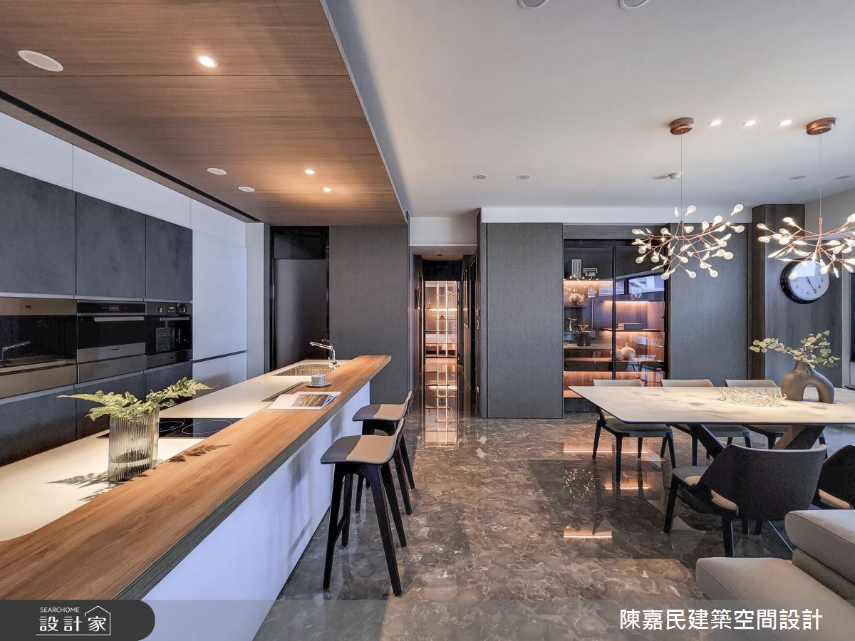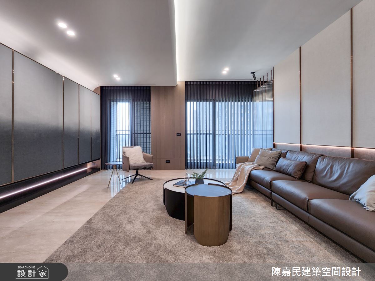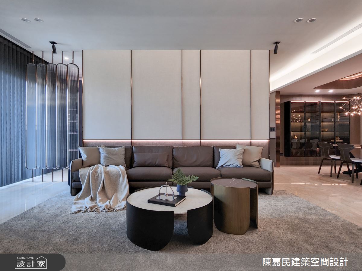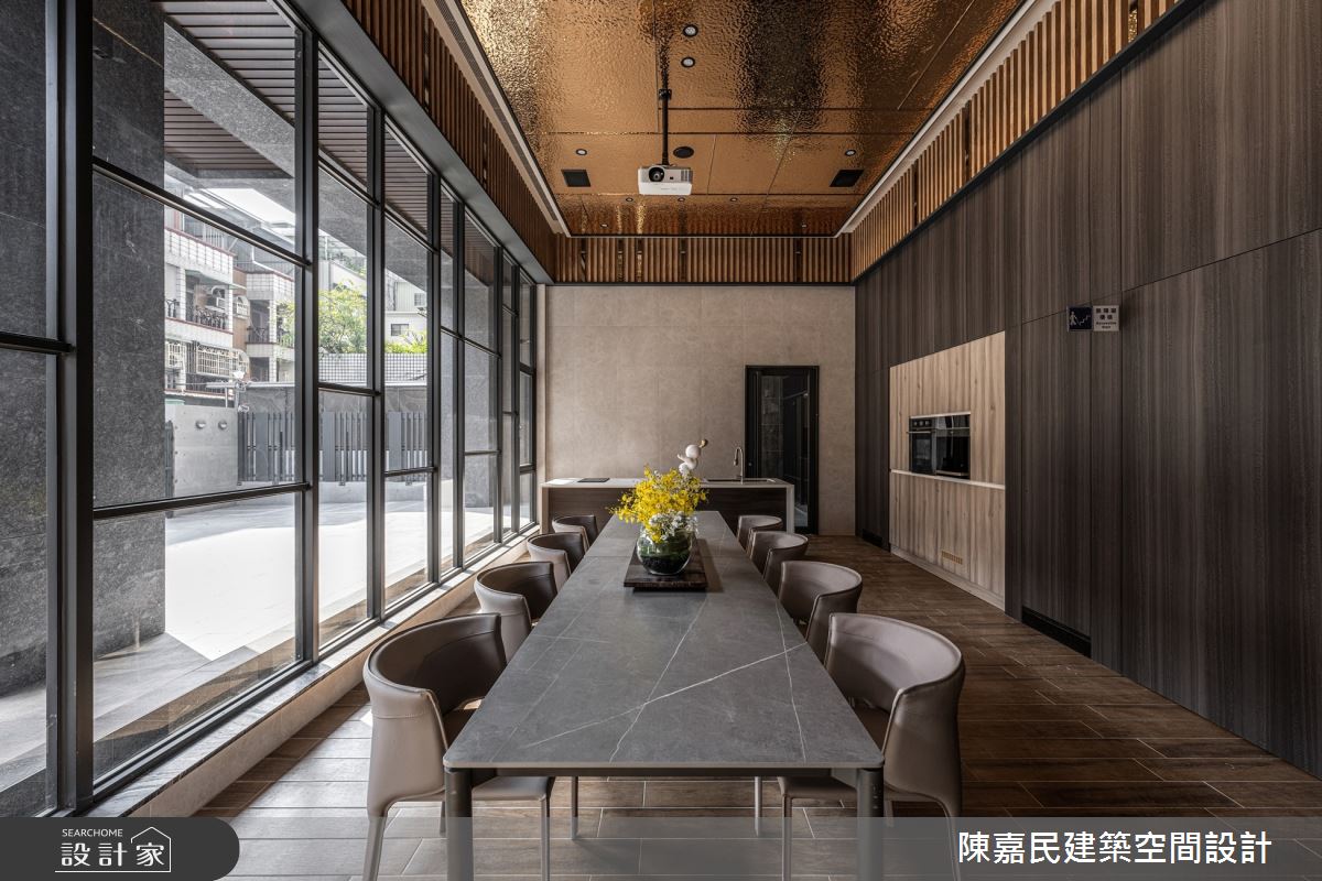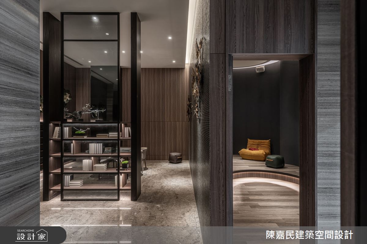 由陳嘉民建築空間設計精心規劃的350坪公共空間,因應業主需求,設計師運用混搭風作為主軸,搭配建材壁紙、木地板、茶玻、鍍鈦金屬、木作貼皮、烤漆、人造石、石材、繃布,打造精緻品味的空間氛圍。
