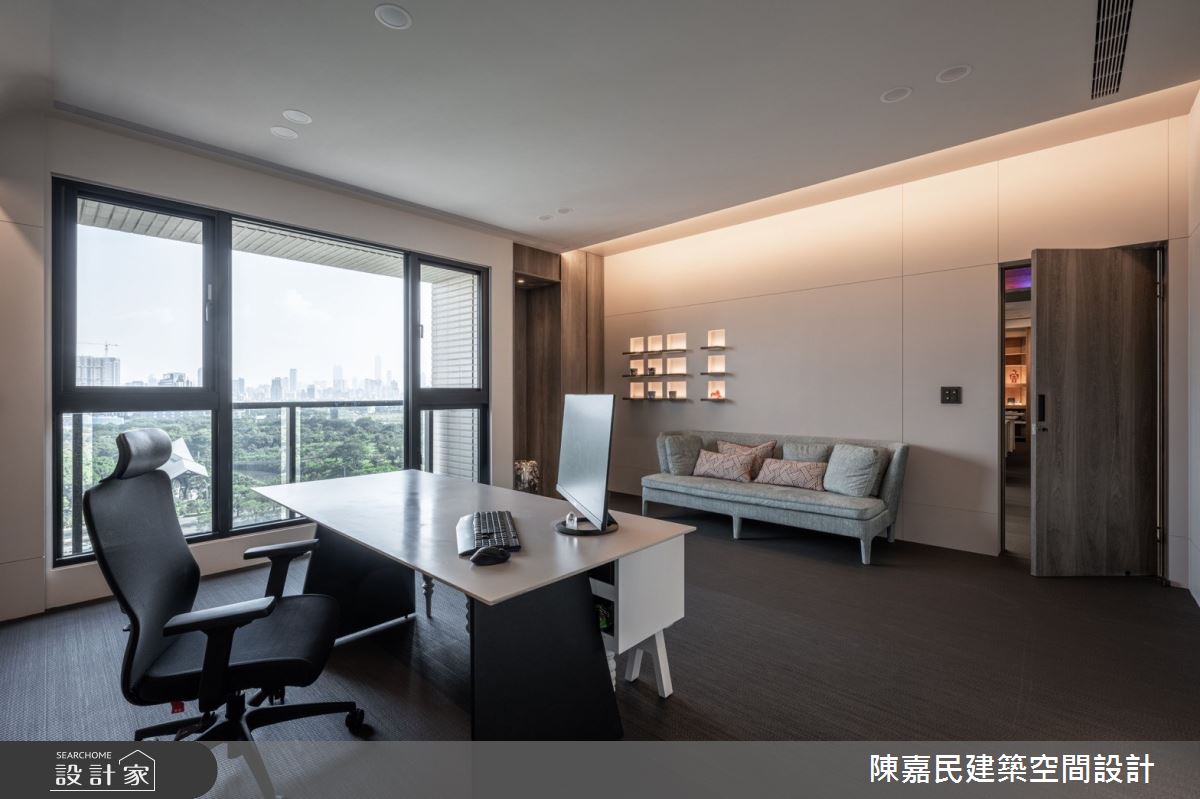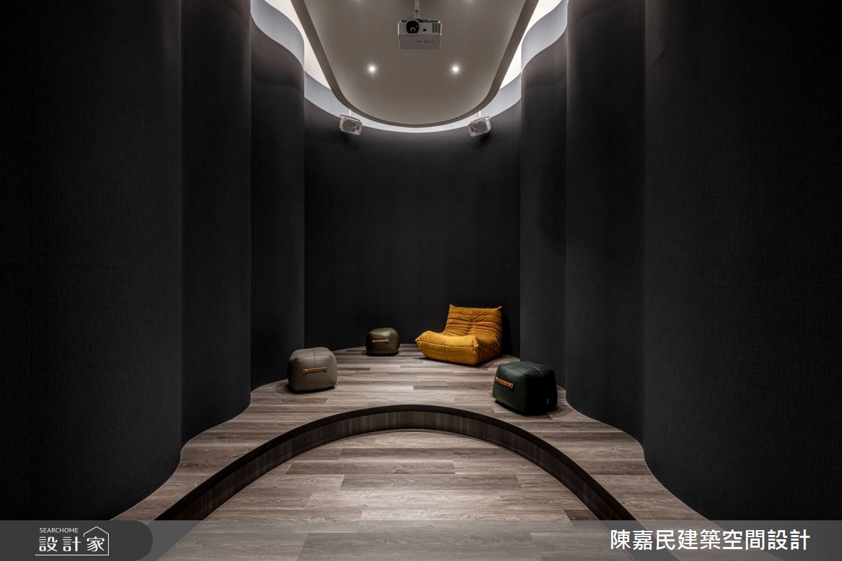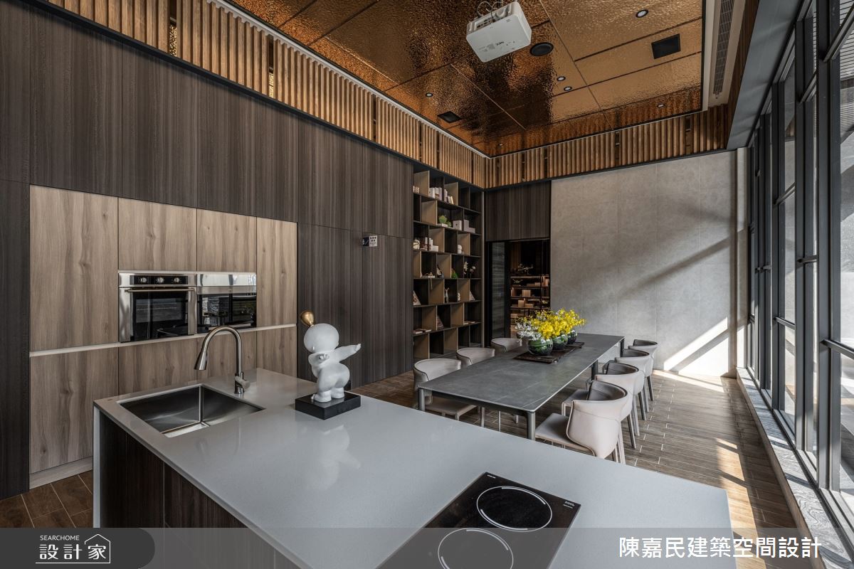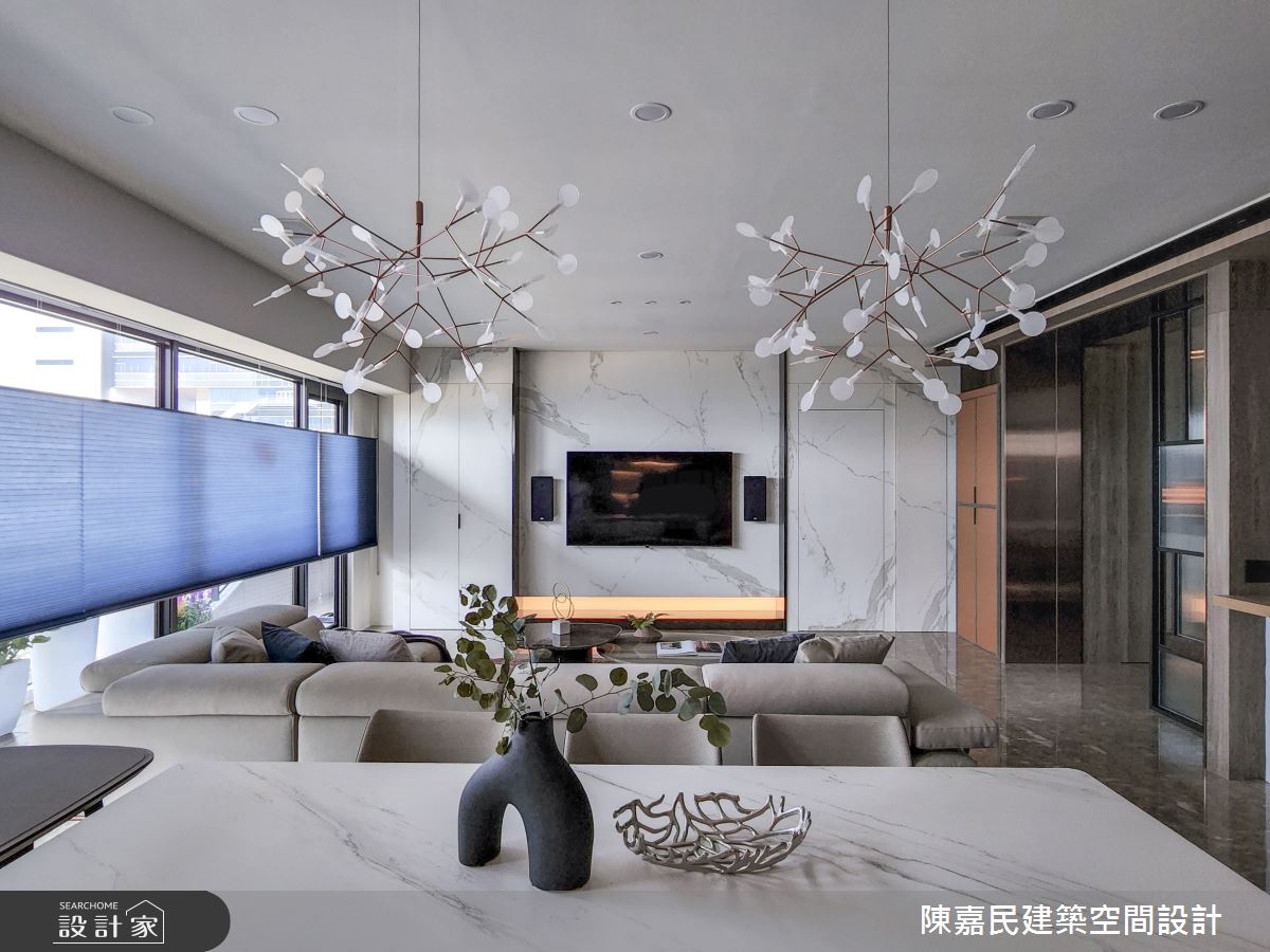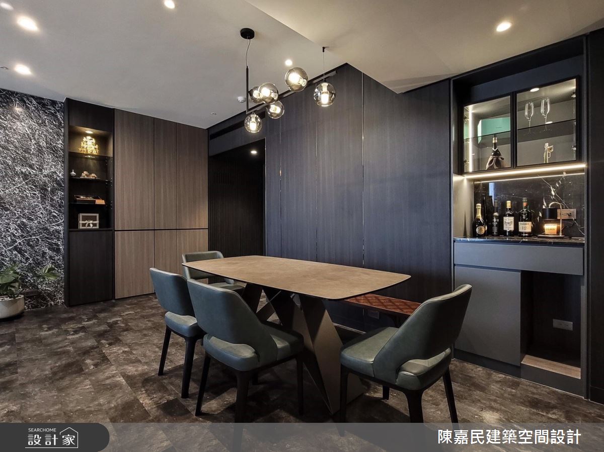 由陳嘉民建築空間設計精心規劃的350坪公共空間,因應業主需求,設計師運用混搭風作為主軸,搭配建材壁紙、木地板、茶玻、鍍鈦金屬、木作貼皮、烤漆、人造石、石材、繃布,打造精緻品味的空間氛圍。