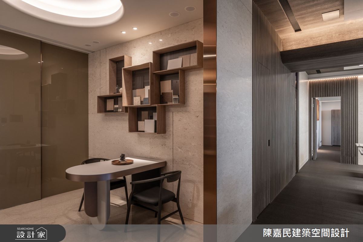 陳嘉民建築空間設計以鍍鈦金屬、烤漆、石材、繃布、編織地毯、風琴簾、塗裝板的搭配應用,呈現混搭風的風格氣息,將此間54坪中古屋(5~15年)優雅詮釋成舒適愜意的商業空間。