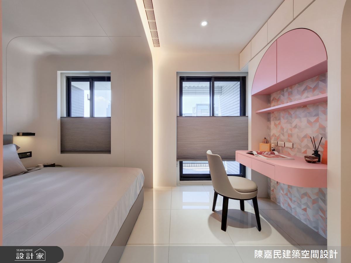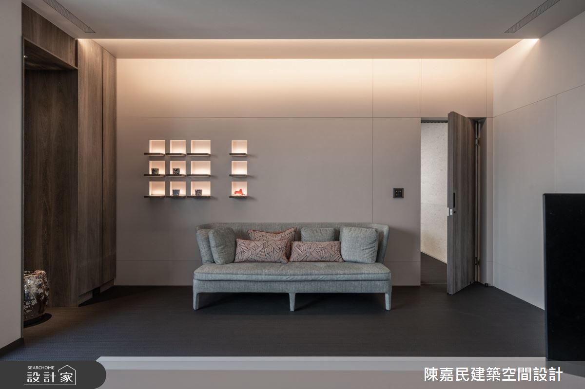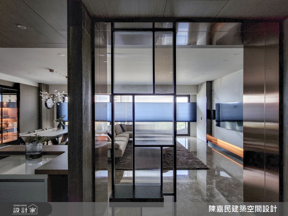 陳嘉民建築空間設計以油漆、壁紙、鐵件、茶玻、木作貼皮、烤漆、石材、噴漆、風琴簾的搭配應用,呈現混搭風居家氛圍,將此間18坪、三房、單層、預售屋打造成舒適愜意的家庭空間,完成全家人的夢想之居。