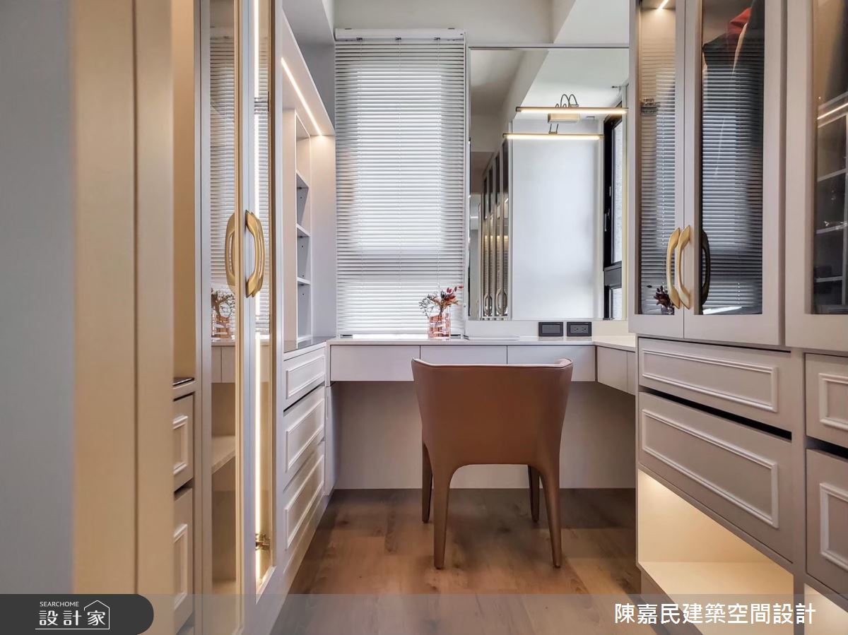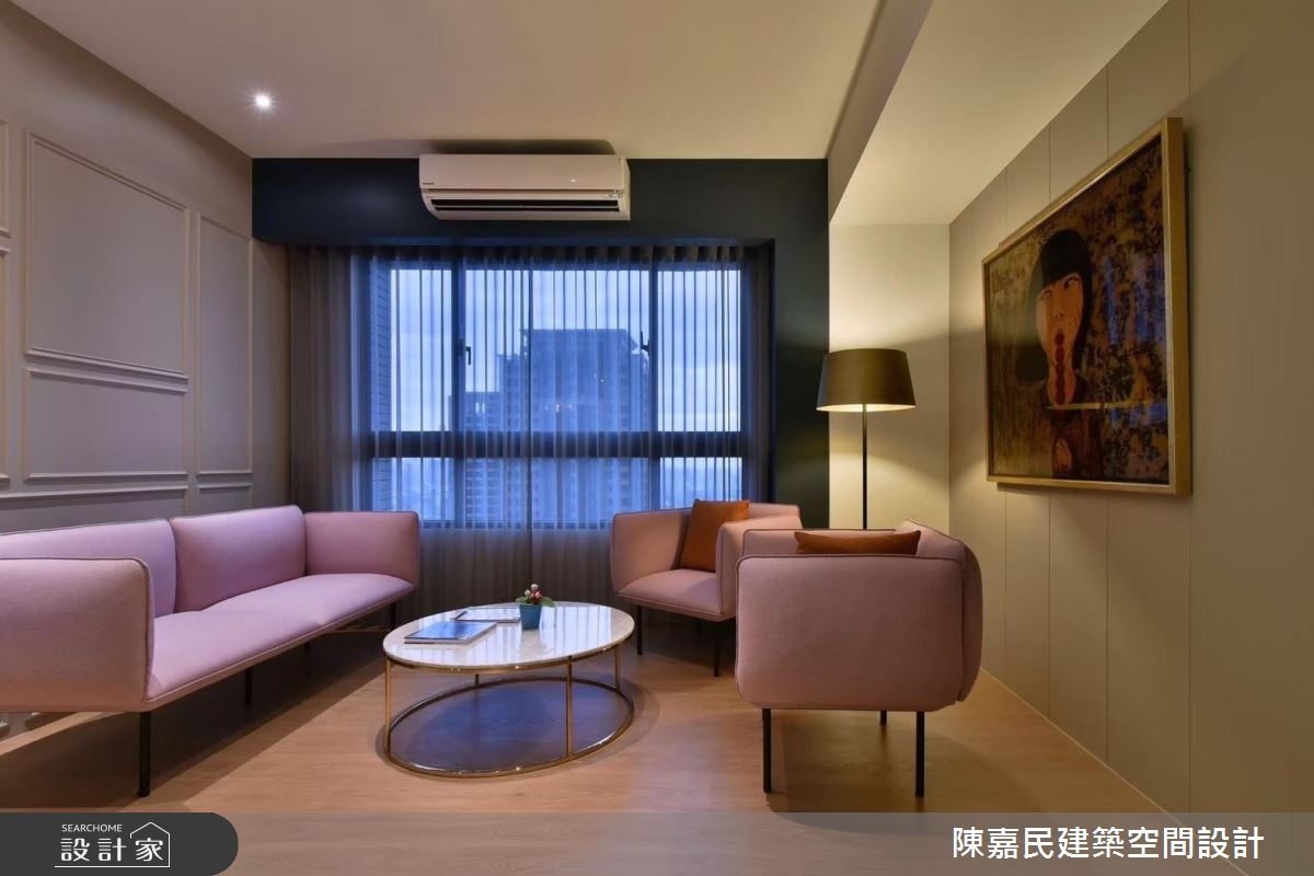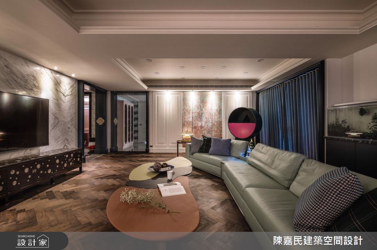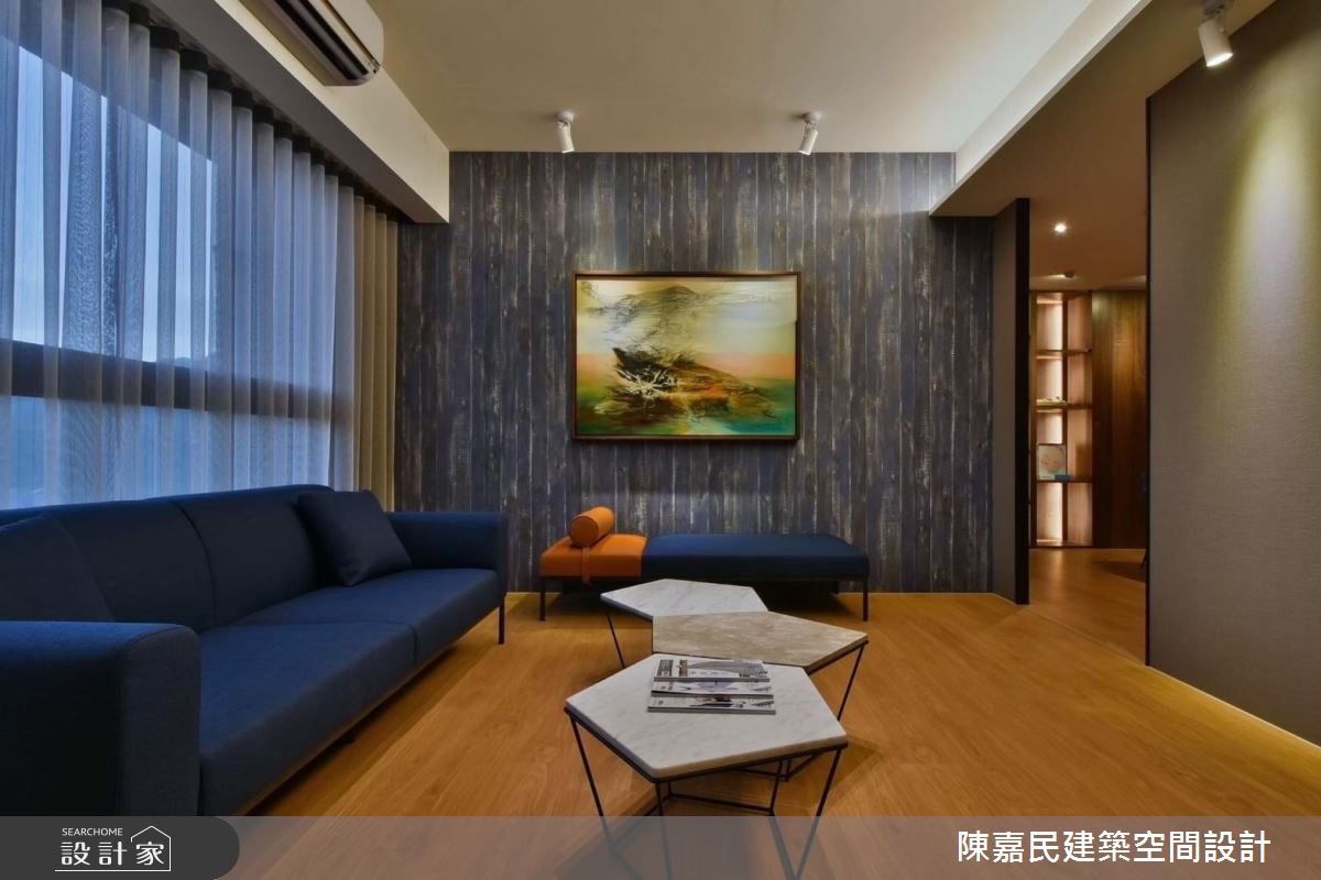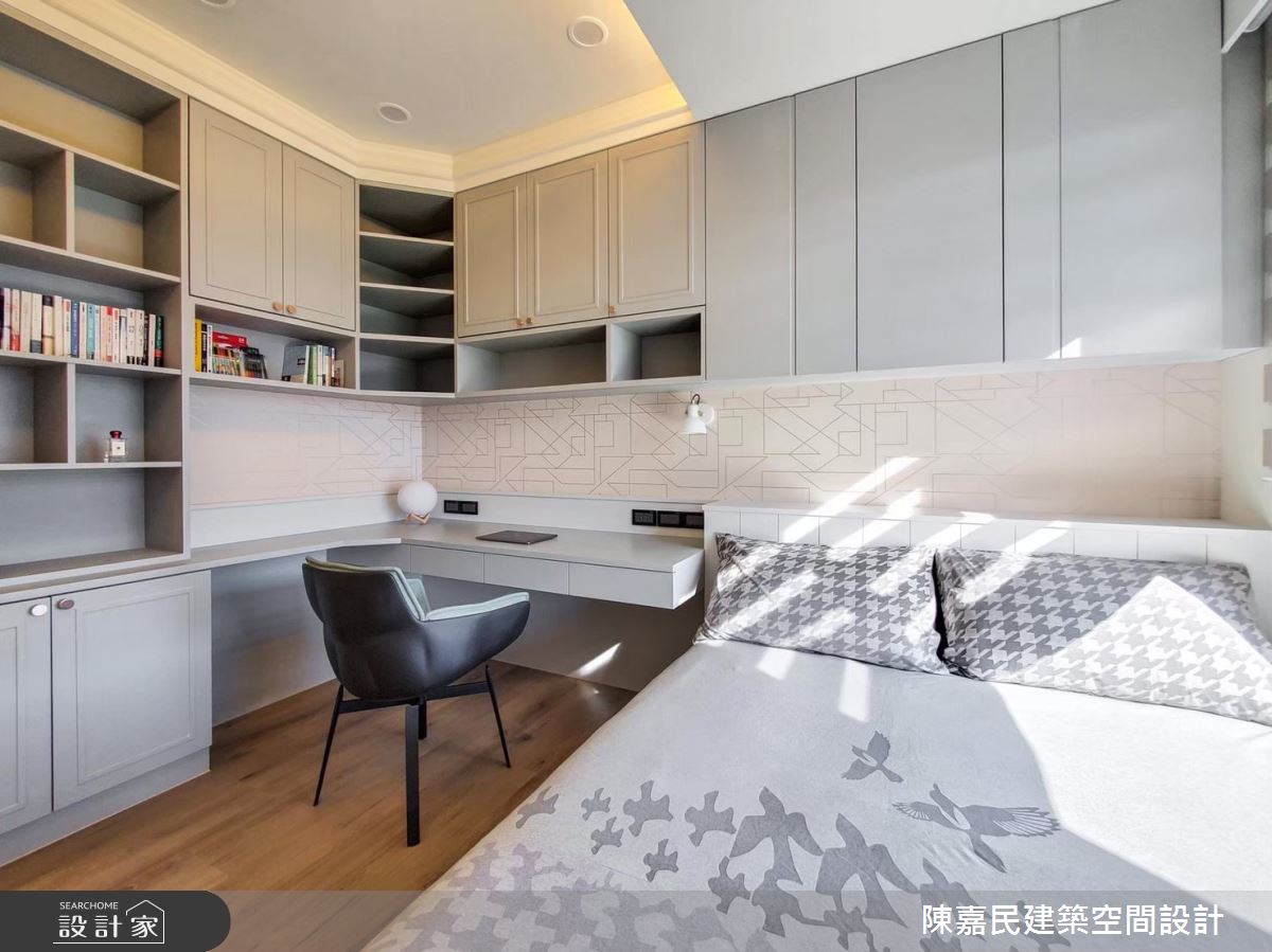 陳嘉民建築空間設計以壁紙、木地板、石材、繃布、噴漆、薄板的搭配應用,呈現美式風居家氛圍,將此間47坪、四房、單層、新成屋(5年以下)打造成舒適愜意的家庭空間,完成1位大人、2位小孩全家人的夢想之居。