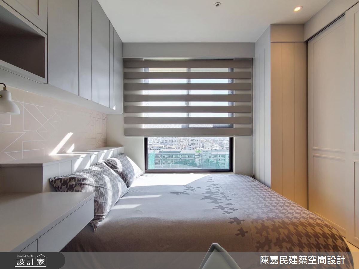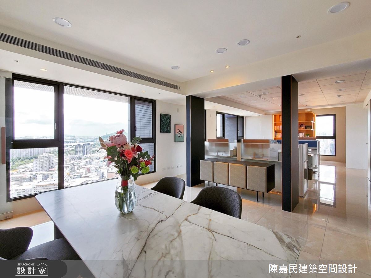 陳嘉民建築空間設計以木地板、木作貼皮、烤漆、人造石、繃布、玻璃的搭配應用,呈現北歐風居家氛圍,將此間35坪、三房、單層、新成屋(5年以下)打造成舒適愜意的家庭空間,完成2位大人、2位小孩全家人的夢想之居。
