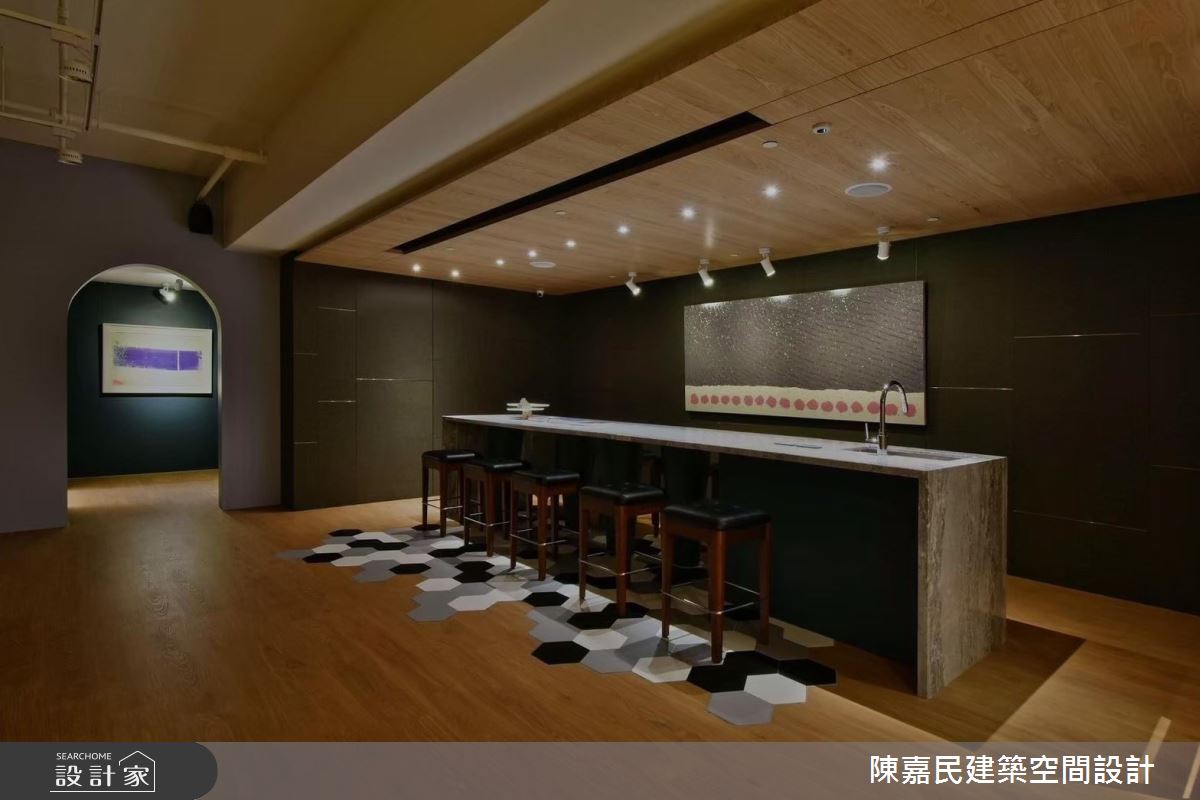 陳嘉民建築空間設計以油漆、六角磚/蜂巢磚、壁紙、超耐磨木地板、鐵件、鍍鈦金屬、木作貼皮、系統板材、人造石、線板的搭配應用,呈現混搭風的風格氣息,將此間125坪新成屋(5年以下)優雅詮釋成舒適愜意的商業空間。