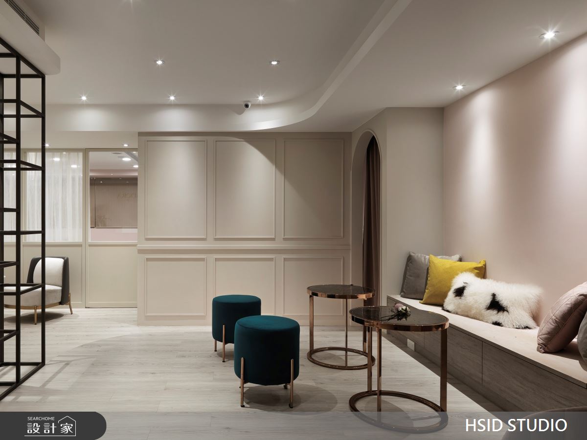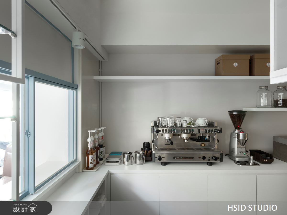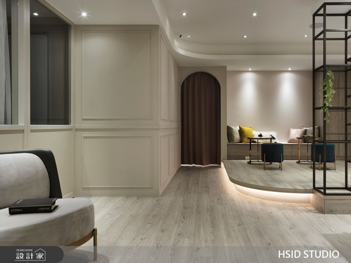 樺設室內裝修設計以波麗板、金屬美耐板、系統板、乳膠漆、金屬漆、水泥漆、晴雨漆、塑膠地板、優白玻璃、白鐵、木作底面貼鏡膜、矽利康、白色可透光壓克力的搭配應用,呈現法式現代風的風格氣息,將此間10.4坪老屋(16~30年)優雅詮釋成舒適愜意的商業空間。