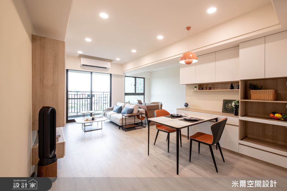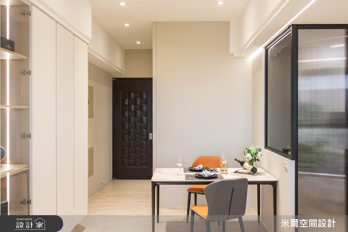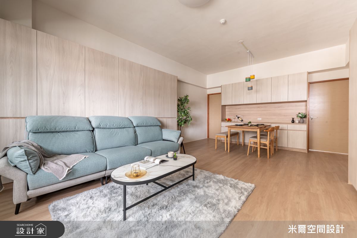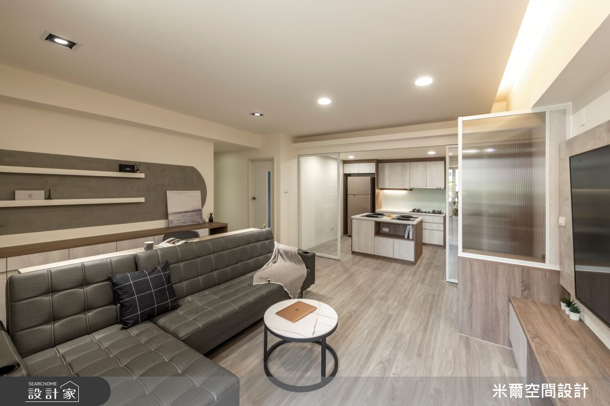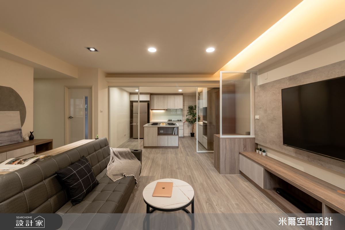 米爾空間設計以木作、玻璃、油漆、鋁件、spc地板的搭配應用,呈現現代風居家氛圍,將此間25坪、單層、新成屋(5年以下)打造成舒適愜意的家庭空間,完成全家人的夢想之居。