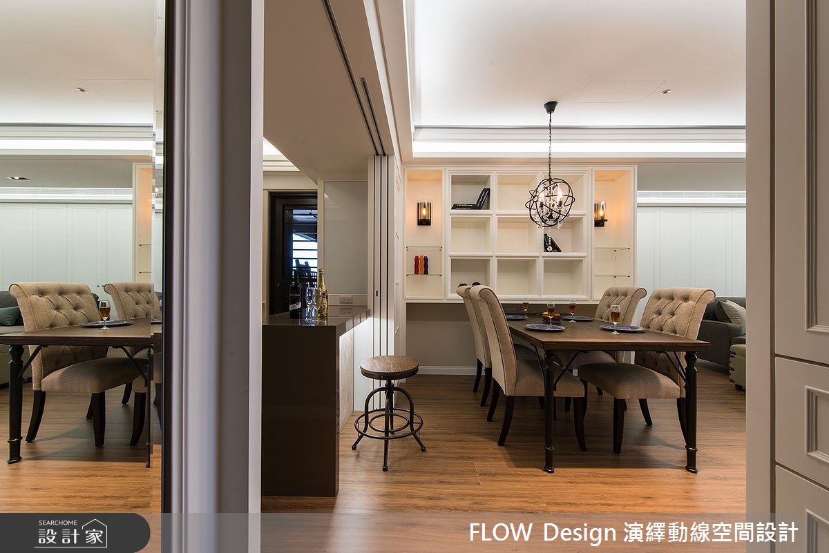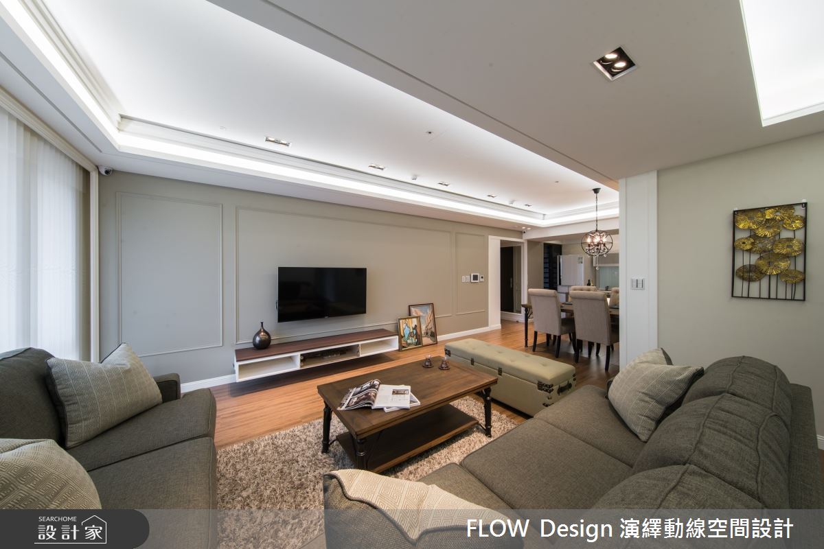 FLOW Design 演繹動線空間設計以木地板、人造石、線板、實木木皮的搭配應用,呈現美式風居家氛圍,將此間24坪、三房、單層、新成屋(5年以下)打造成舒適愜意的家庭空間,完成3位大人全家人的夢想之居。