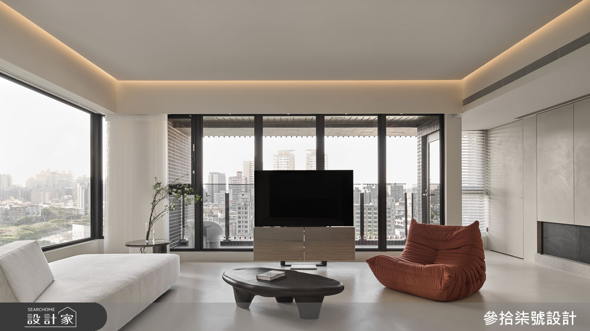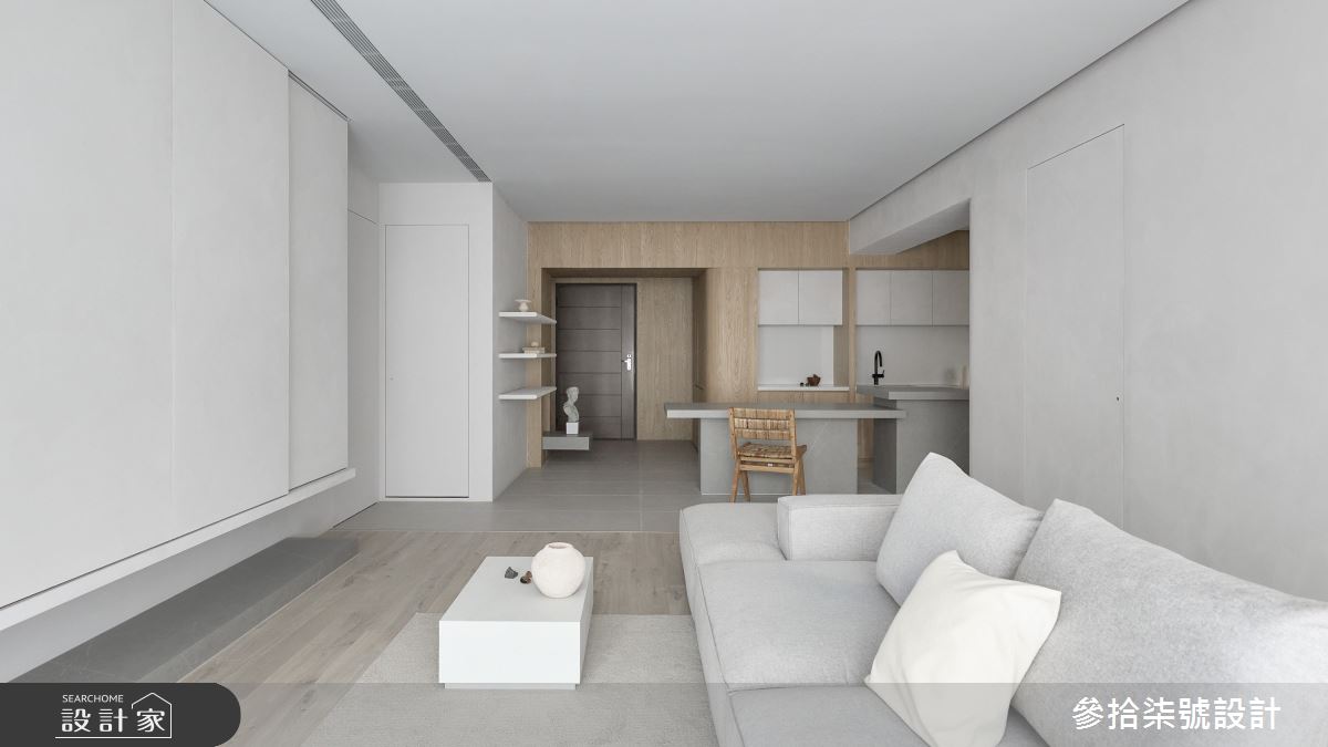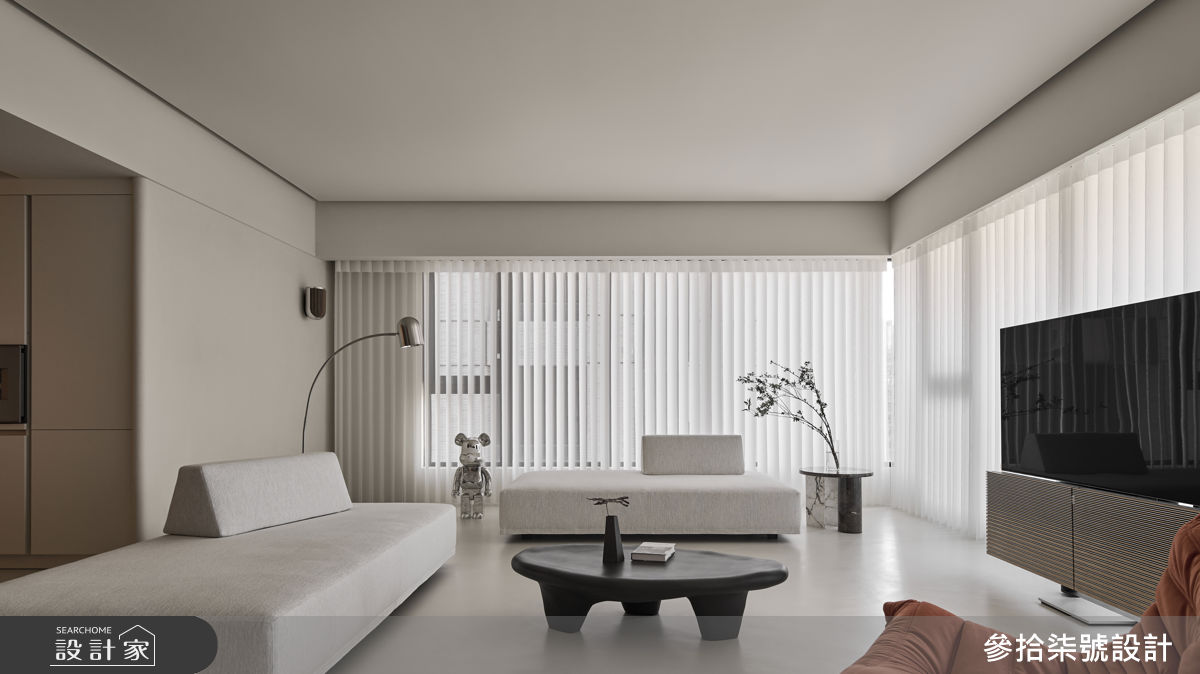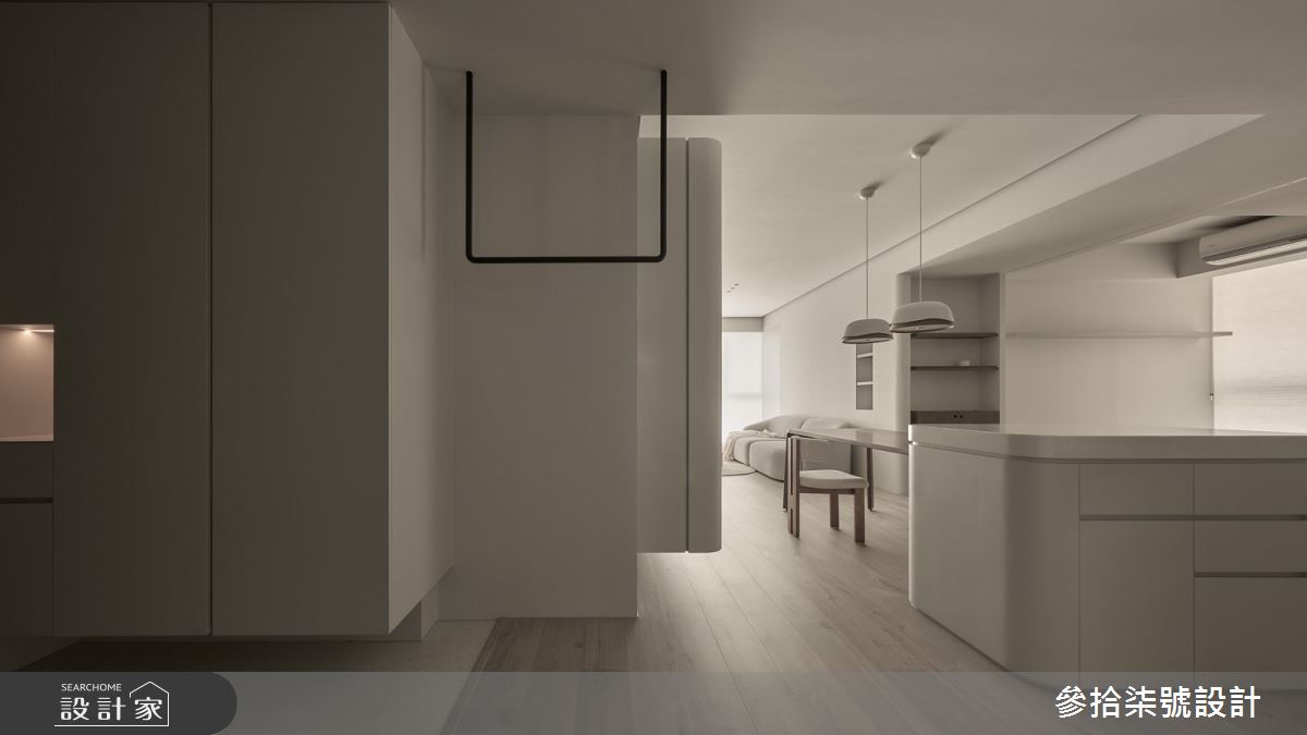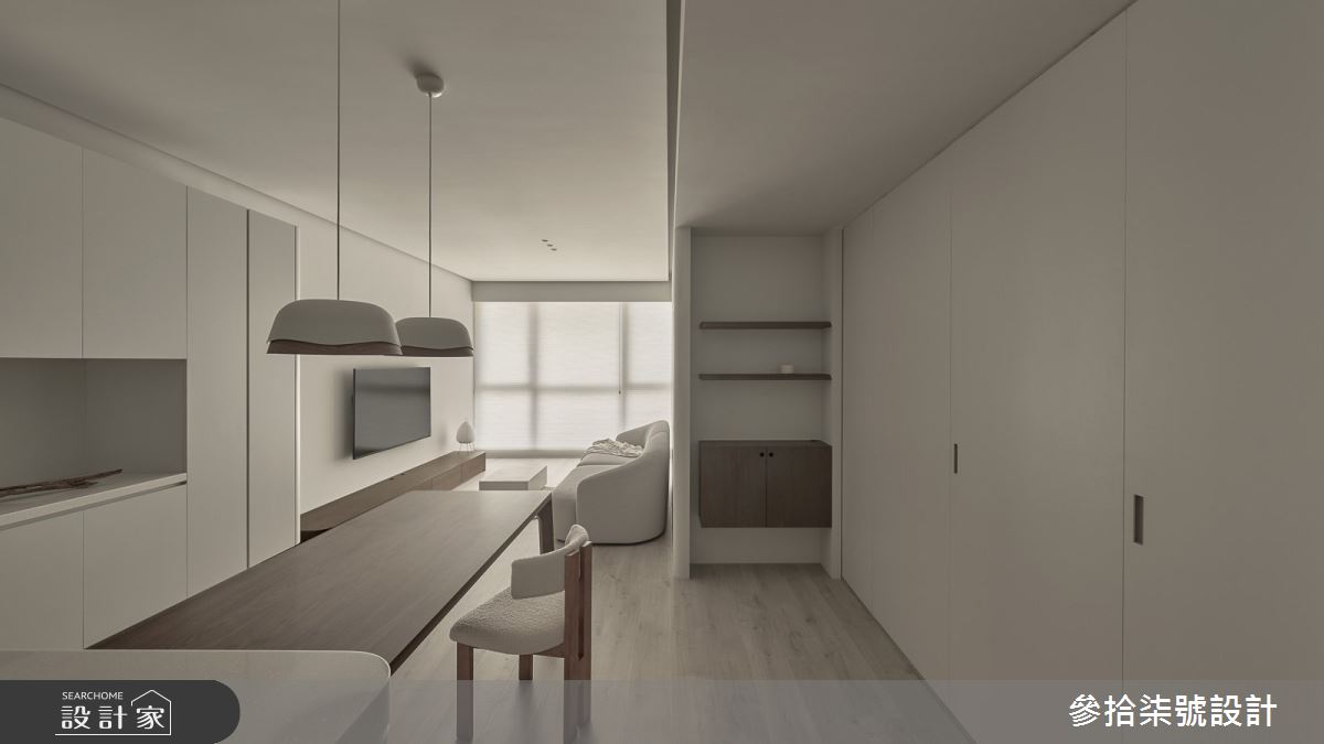參拾柒號設計以乳膠漆、超耐磨木地板、鐵件、木作貼皮、烤漆、系統板材、磁磚、人造石、風琴簾、長虹茶玻的搭配應用,呈現簡約風居家氛圍,將此間23坪、三房、單層、新成屋(5年以下)打造成舒適愜意的家庭空間,完成2位大人全家人的夢想之居。