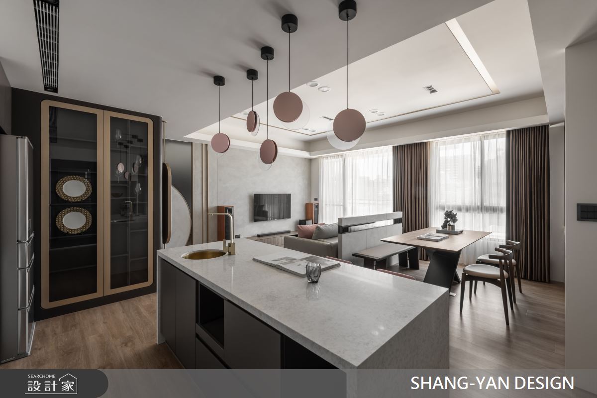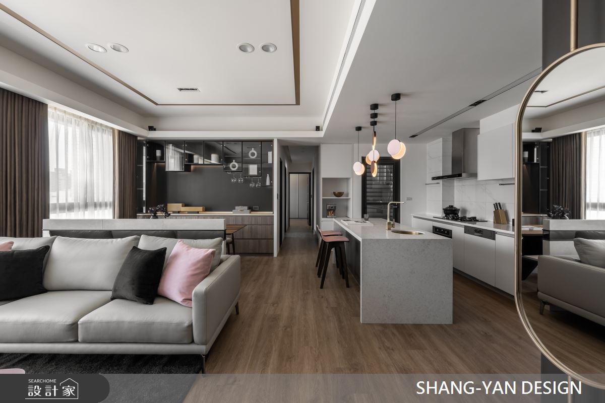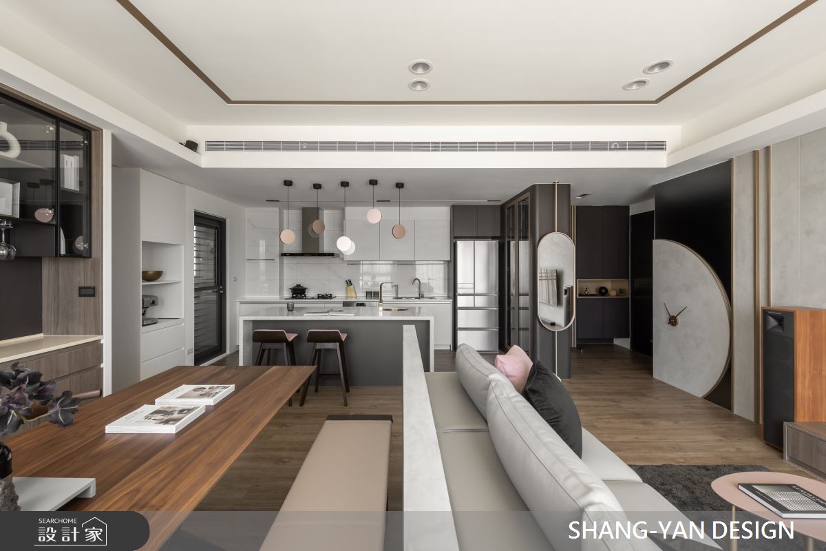 來自上硯建築空間設計的75坪現代風住宅案,屋主一家人共有2位大人,是一間單層毛胚屋的四房格局,設計師藉由建材以實木皮、進口地磚、噴漆、進口廚具、實木地板的搭配應用,實現一家人的理想生活。