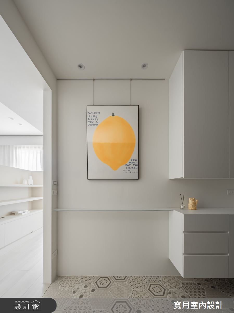 寬月室內設計以油漆、六角磚/蜂巢磚、磁性漆/磁性黑板漆、超耐磨木地板、木作貼皮、磁磚、軌道燈、石材的搭配應用,呈現人文禪風居家氛圍,將此間21坪、三房、單層、老屋(50年以上)打造成舒適愜意的家庭空間,完成2位大人、1位小孩全家人的夢想之居。