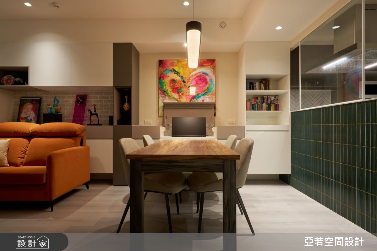 由亞若設計有限公司精心規劃的8坪一房住宅空間,家庭成員一共有2位大人。因應屋主需求,設計師運用現代風作為主軸,搭配乳膠漆、鐵道磚、磁性漆/磁性黑板漆、超耐磨木地板、鐵件、系統板材、人造石、石塑地板、明鏡,打造全家人的夢想家居。