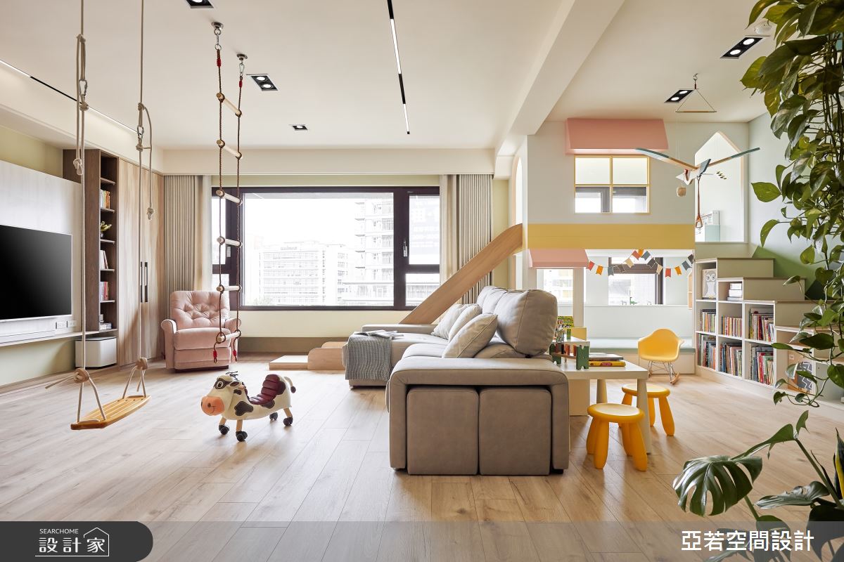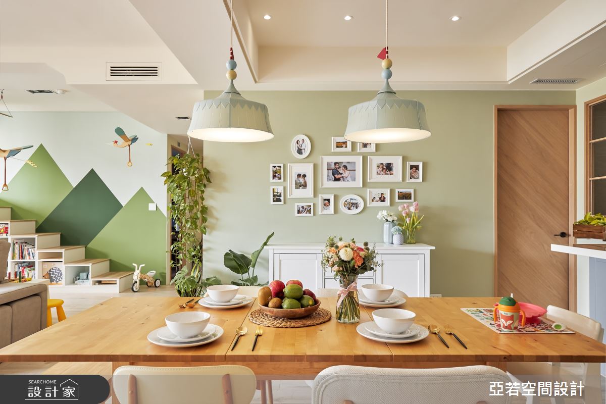 由亞若設計有限公司精心規劃的46坪四房住宅空間,家庭成員一共有3位大人、2位小孩。因應屋主需求,設計師運用北歐風作為主軸,搭配乳膠漆、花磚、磁性漆、超耐磨木地板、烤玻、木作貼皮、烤漆、鋼刷木皮、系統板材、人造石、軌道燈、噴漆、磁性黑板、礦物漆,打造全家人的夢想家居。