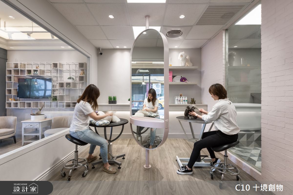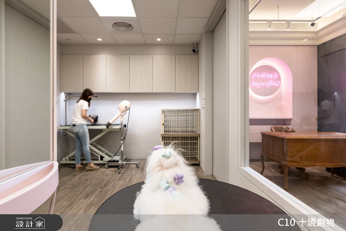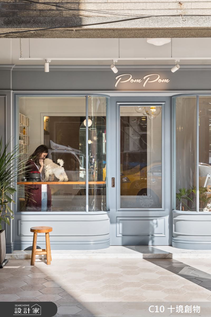希望營造出優雅舒服的氛圍,藉由湖水藍的色塊立面及騎樓復古磚鋪面,產生一種外國風情,讓簡單的商業活動變得更有生氣。內部延續著舒適柔軟的粉色調,讓寵物與主人可以感受到空間的輕鬆與自在,並藉由穿透的視覺可以詳盡的了解在幫毛小孩的整理毛髮時的各種狀況,藉以也可引入自然光線。曲線自在的線條縈繞在內與外的空間四周,搭配著復古與現代的傢飾、燈具讓人在等待時有如置身在法式咖啡店喝著下午茶般的空間,讓整體環境更能感受到的外國氛圍。(文字提供:十境創物)